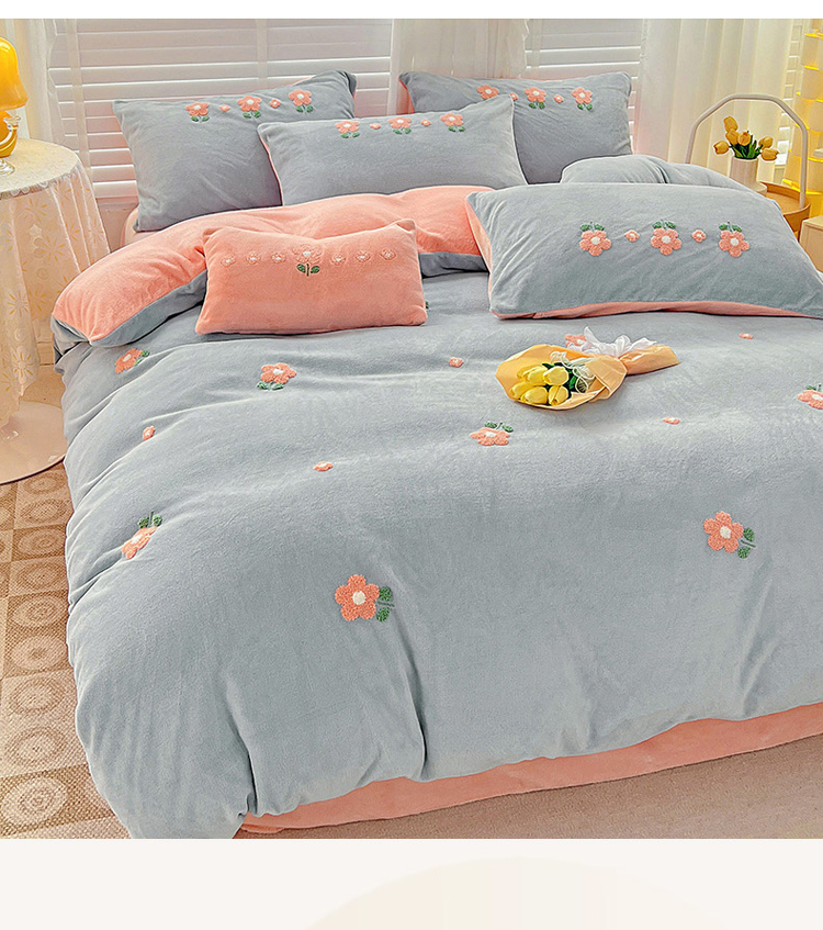 商品名称:寐居家纺 2023新款高克重牛奶绒毛巾绣四件套 朵朵花开-蓝粉