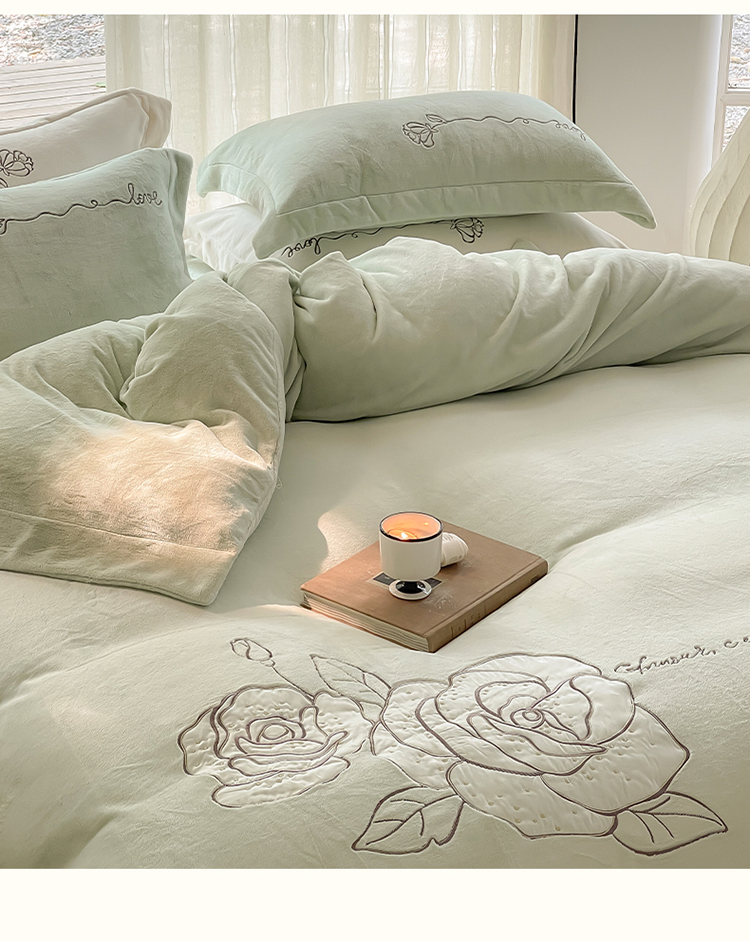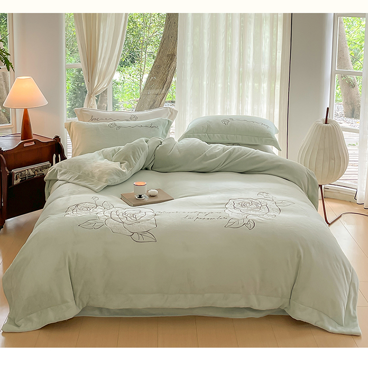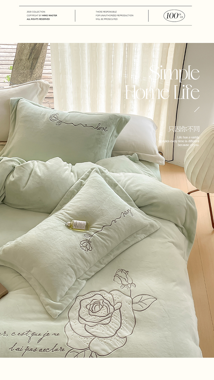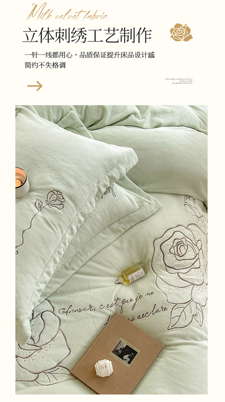商品名称:名品优仓 2023新款高克重230g牛奶绒绣花温妮莎系列四件套 新芽绿