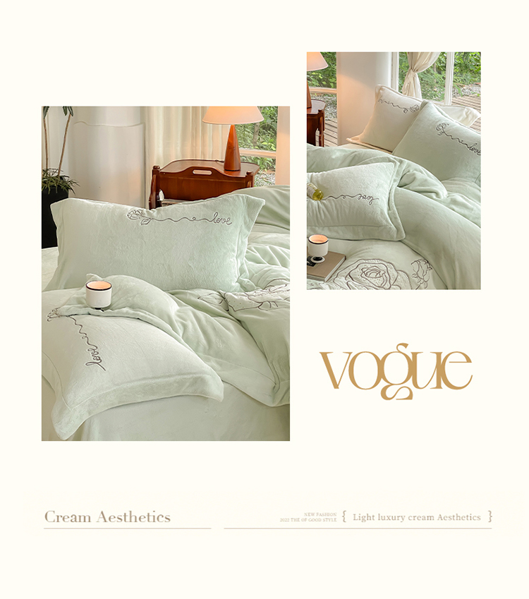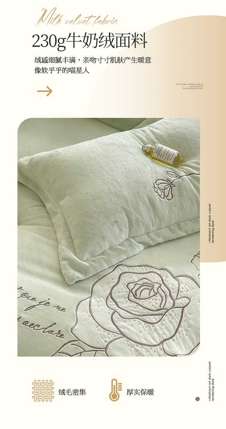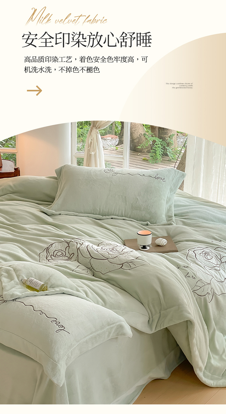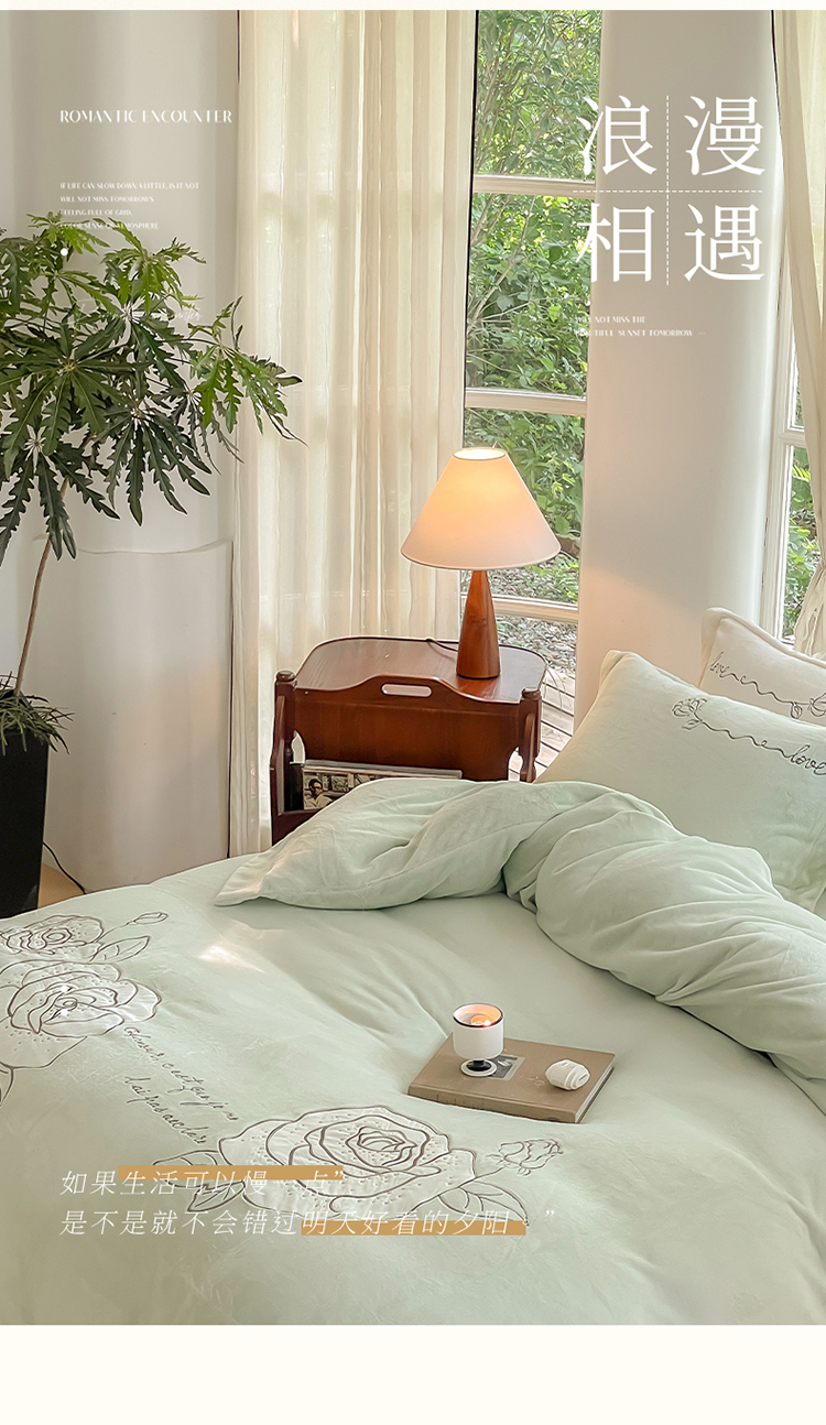 商品名称:名品优仓 2023新款高克重230g牛奶绒绣花温妮莎系列四件套 新芽绿