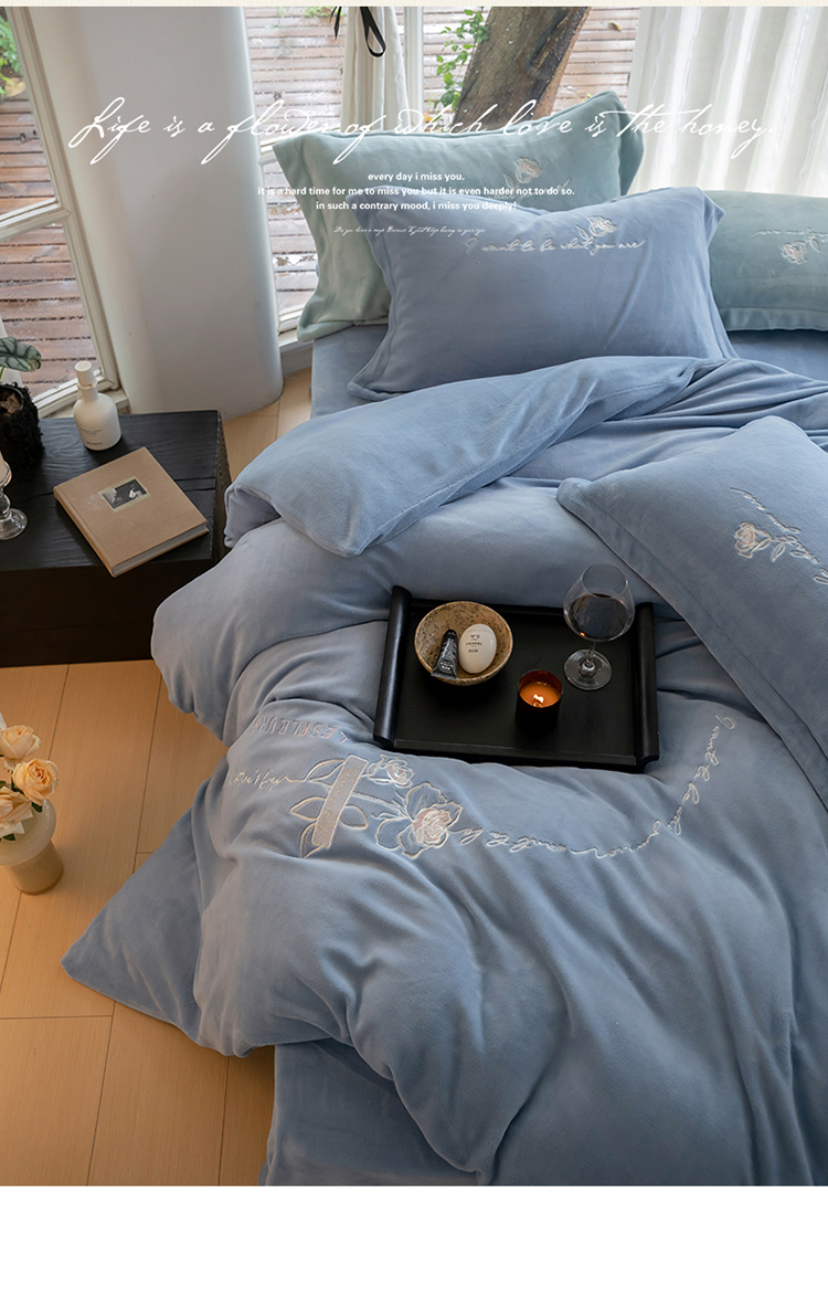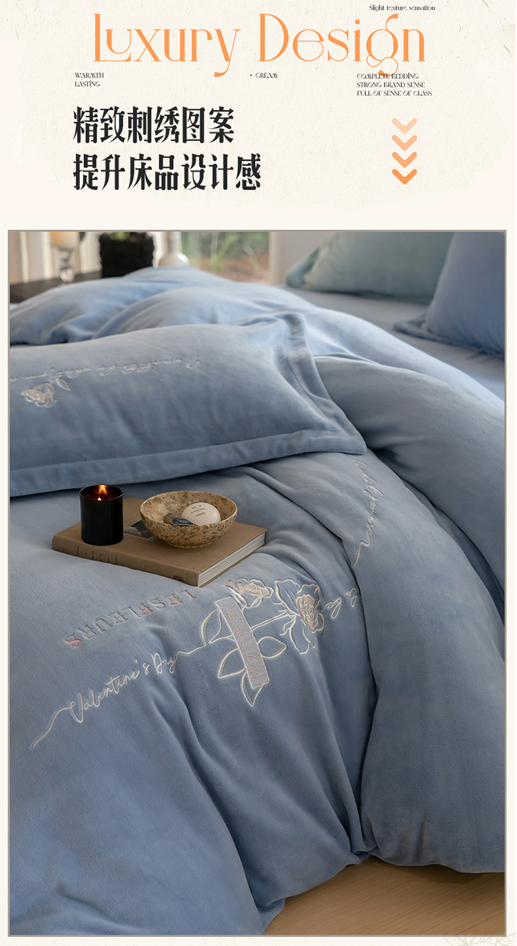 名品优仓 2023新款高克重牛奶绒绣花浪漫玫瑰系列四件套 水冰蓝