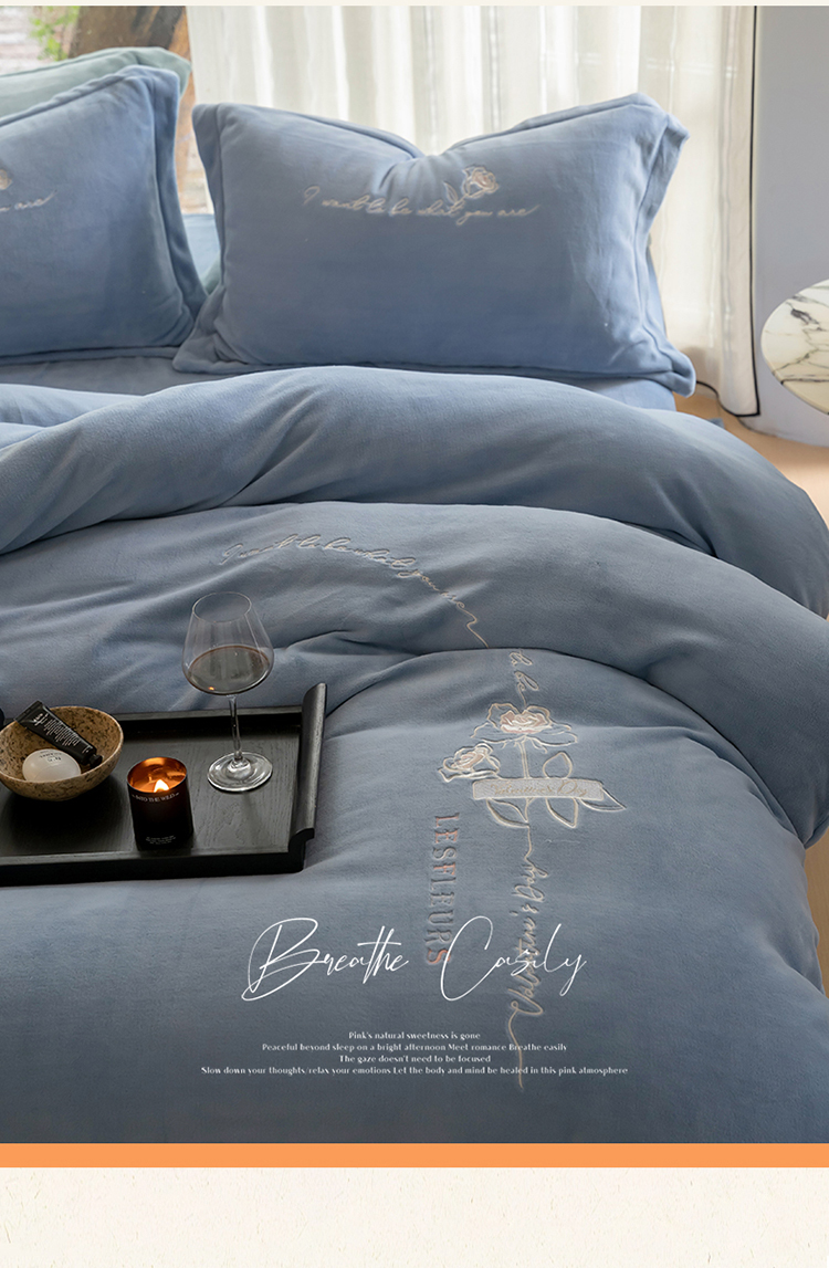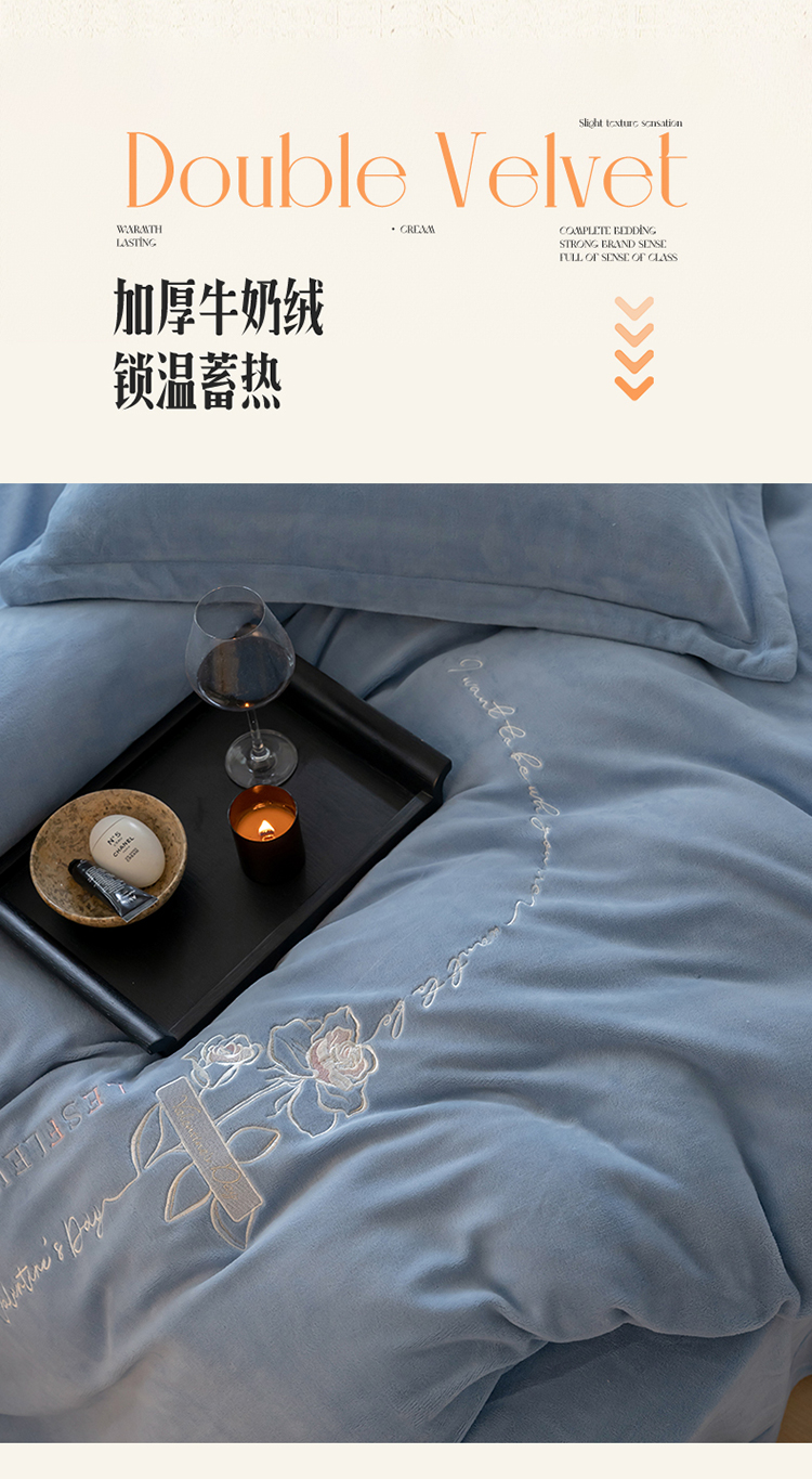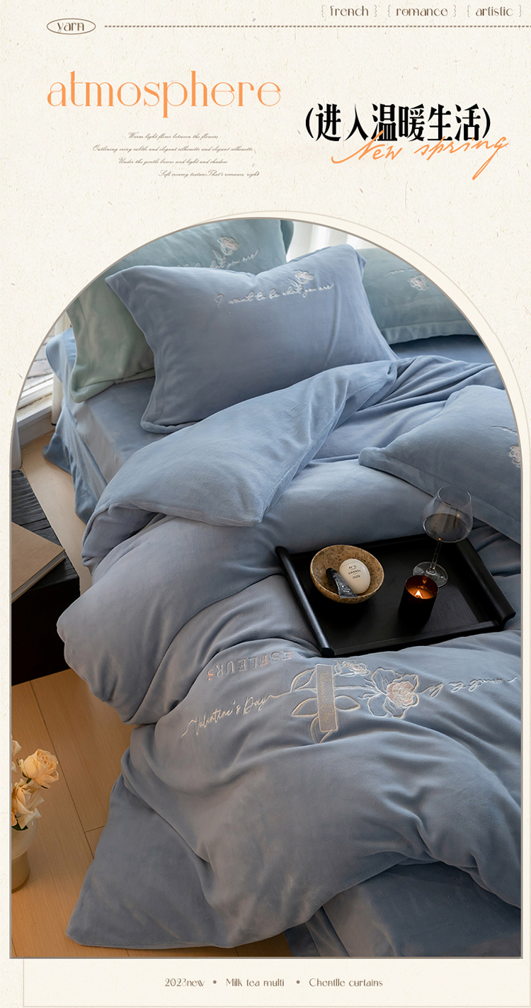 商品名称:名品优仓 2023新款高克重牛奶绒绣花浪漫玫瑰系列四件套 水冰蓝