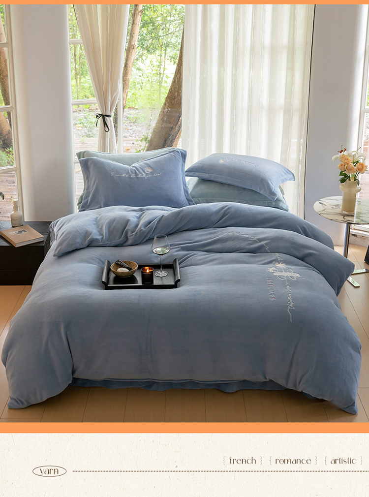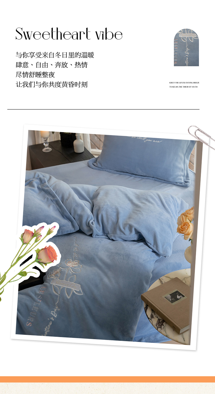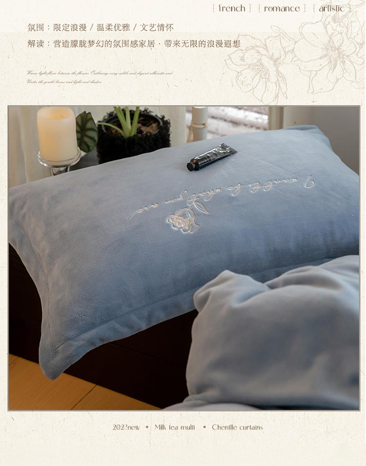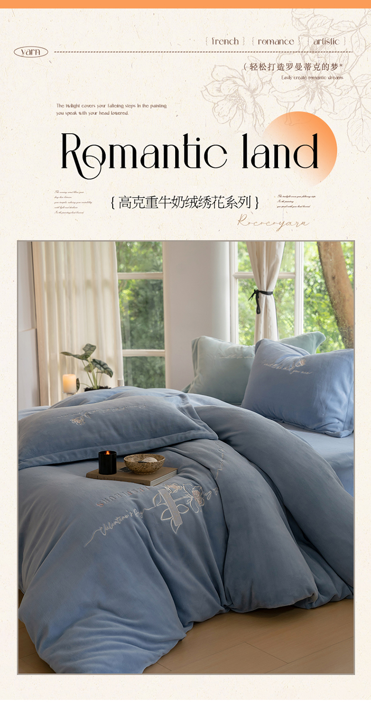 商品名称:名品优仓 2023新款高克重牛奶绒绣花浪漫玫瑰系列四件套 水冰蓝