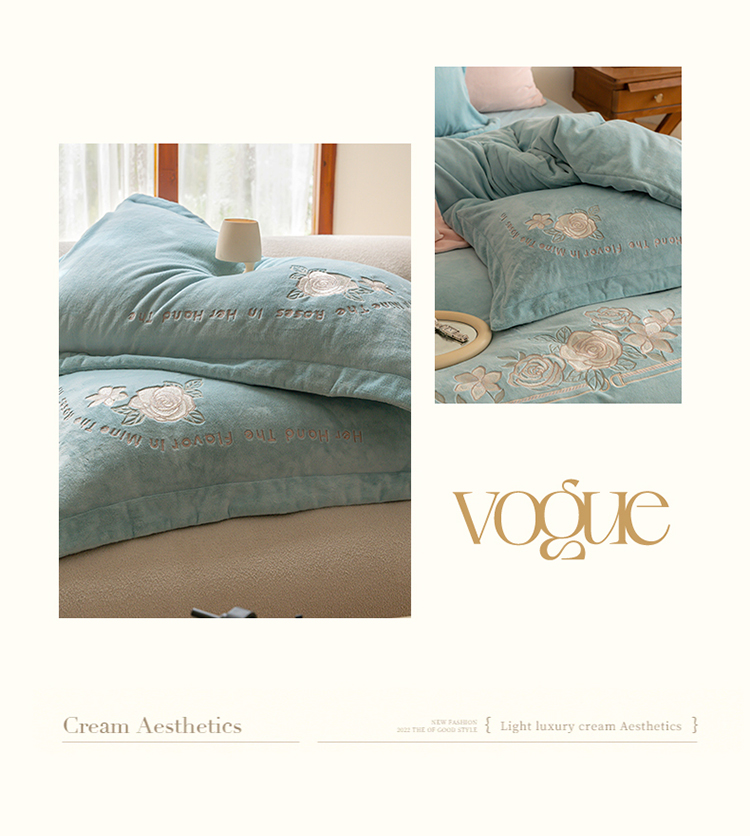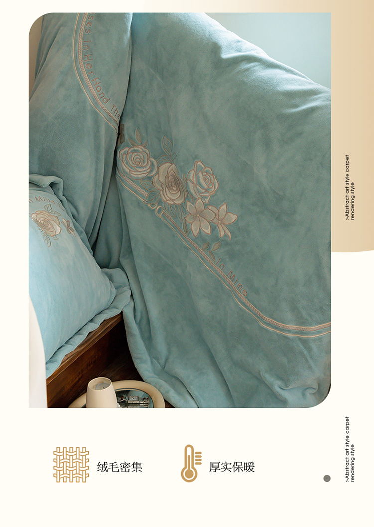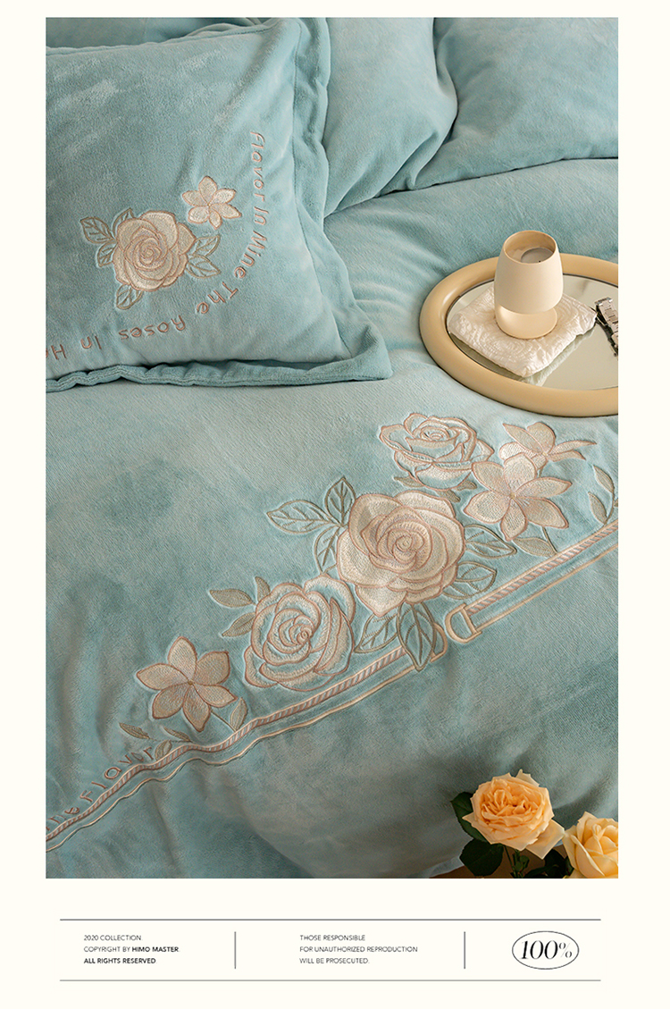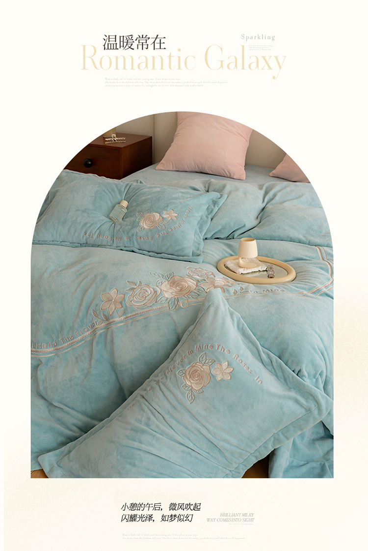 商品名称:名品优仓 2023新款高克重230g牛奶绒绣花蔓璃系列四件套 星清晨蓝