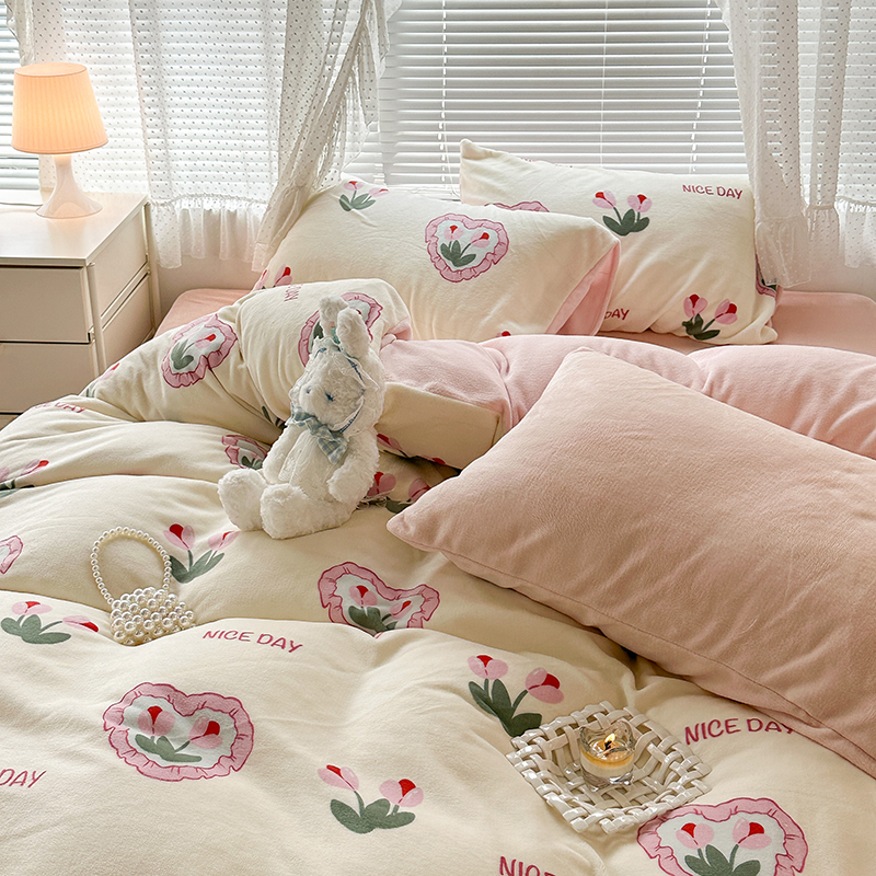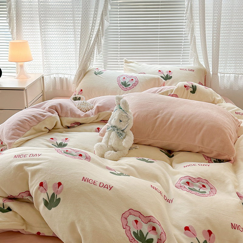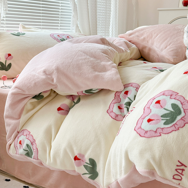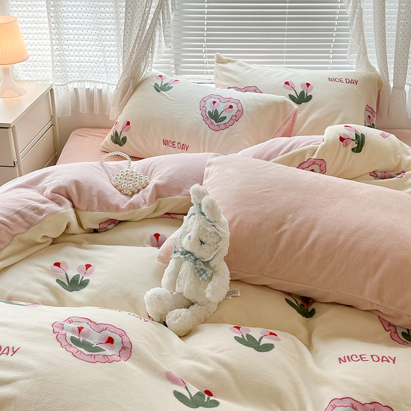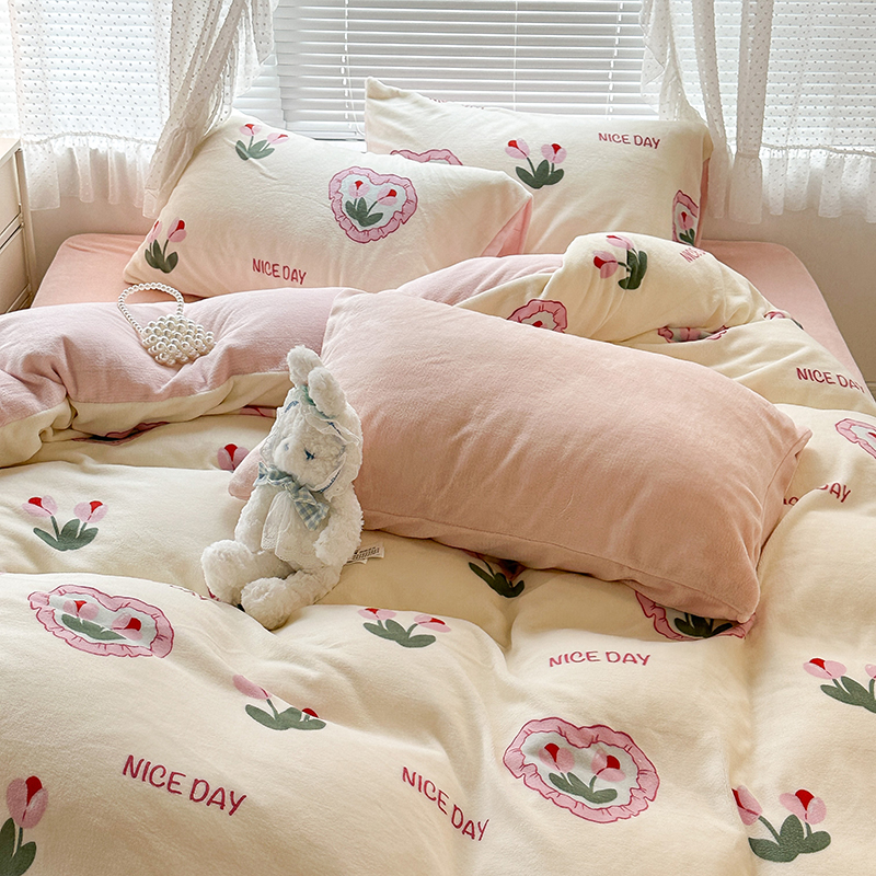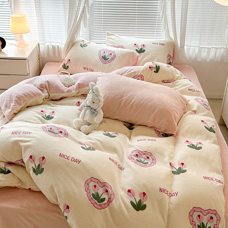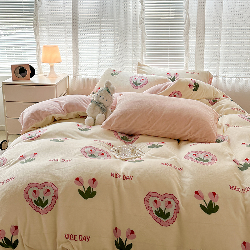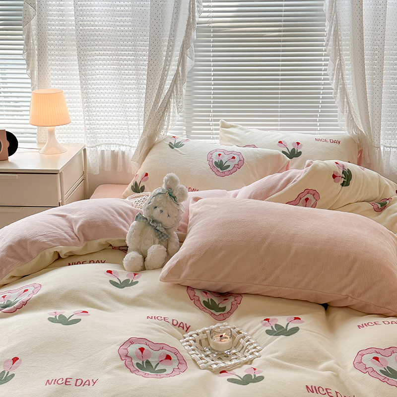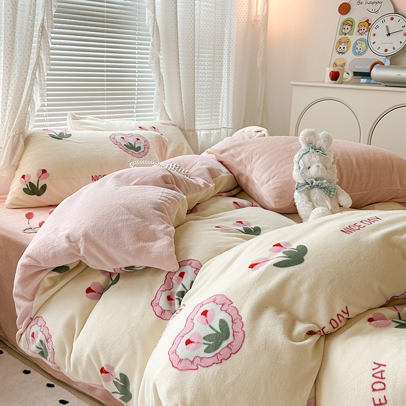 商品名称:昔可家纺 2023新款高克重印花牛奶绒小清新系列四件套 粉心郁金香