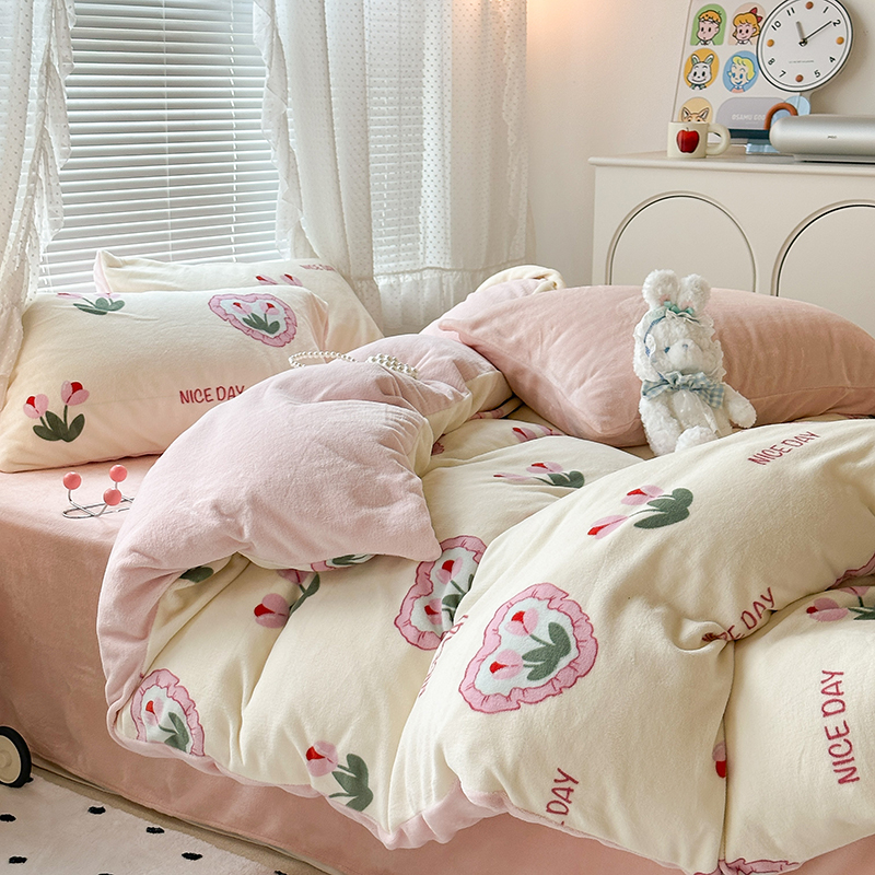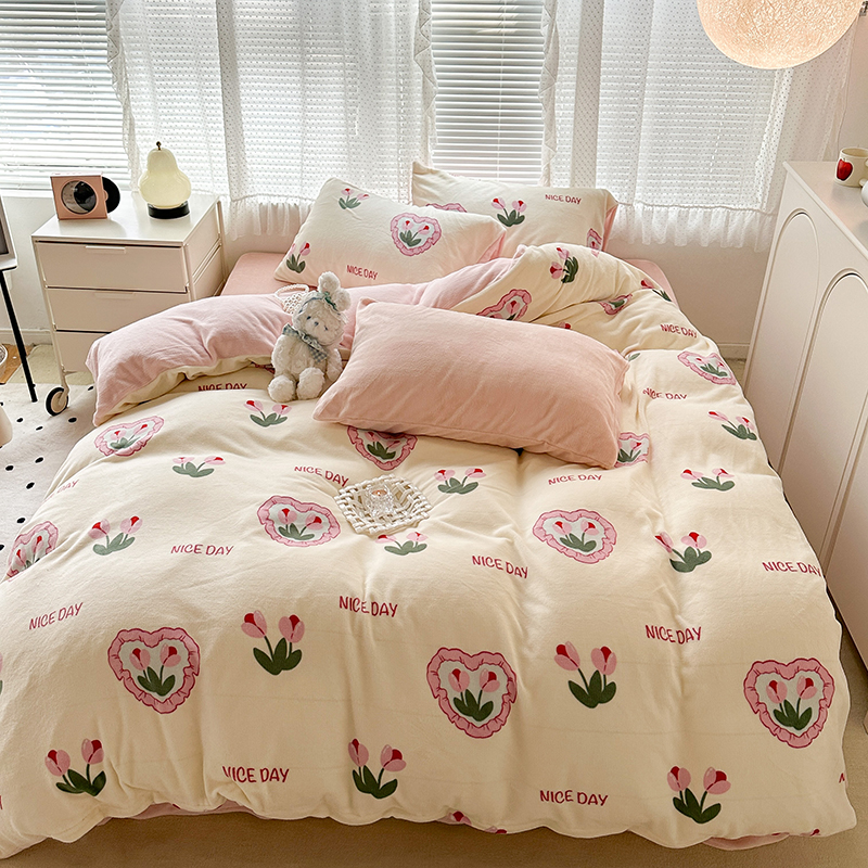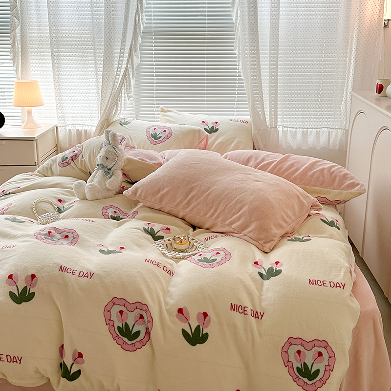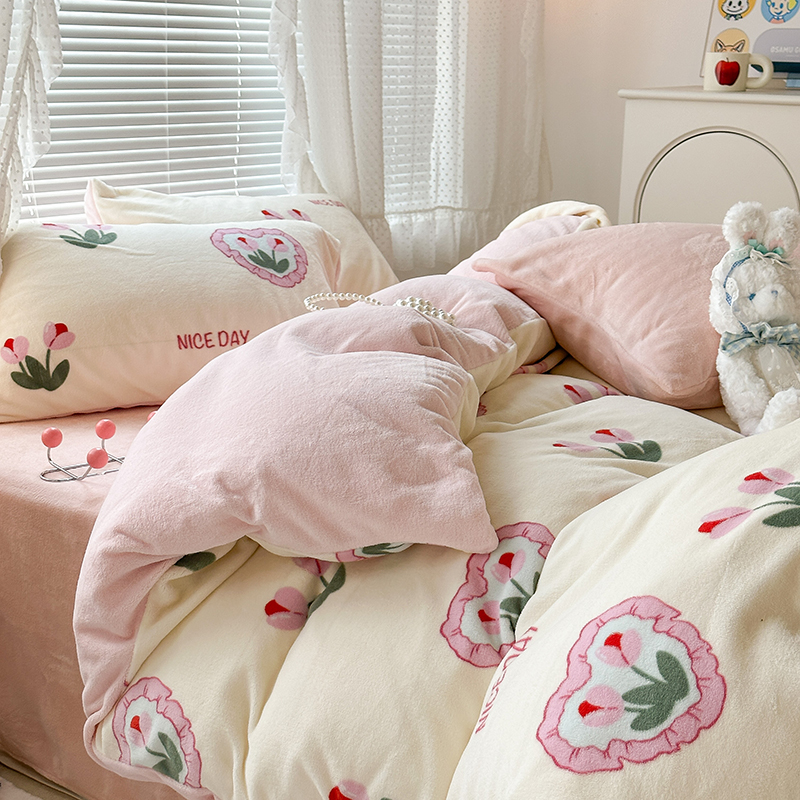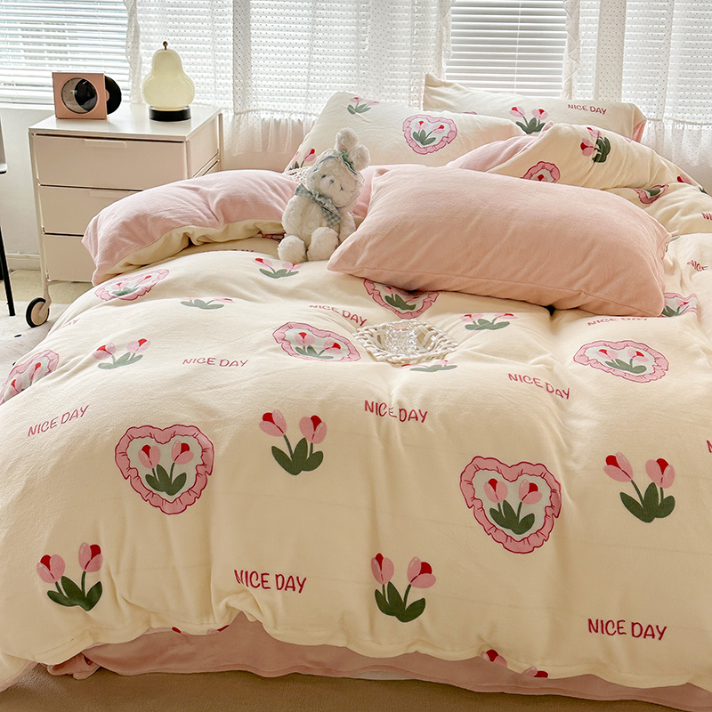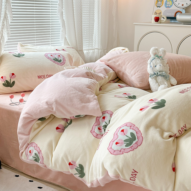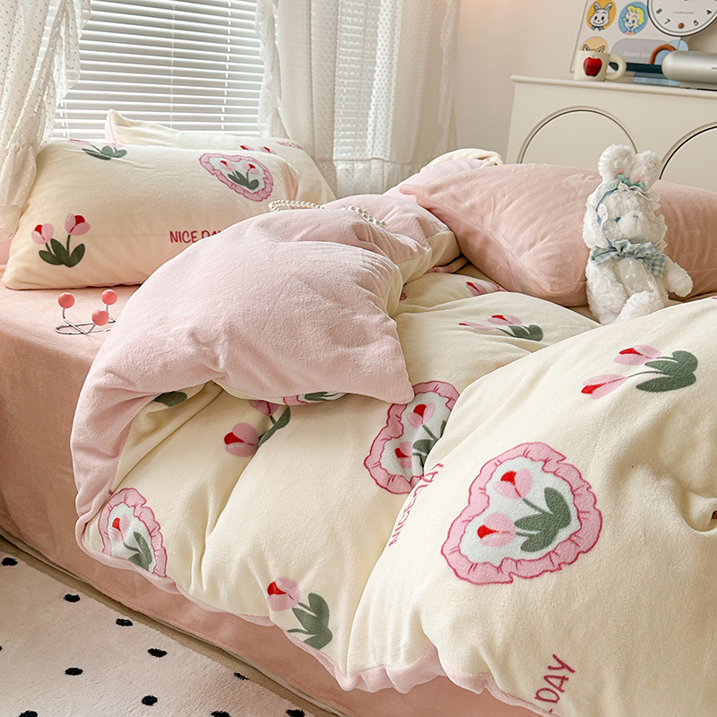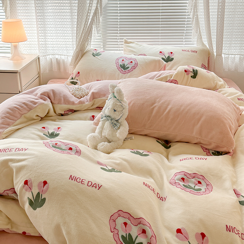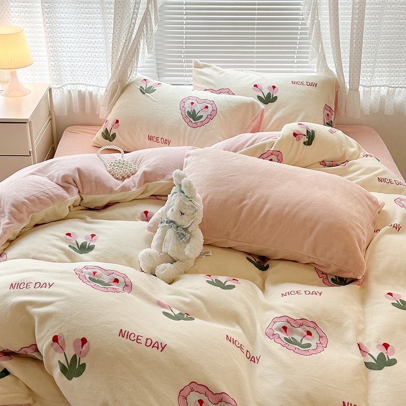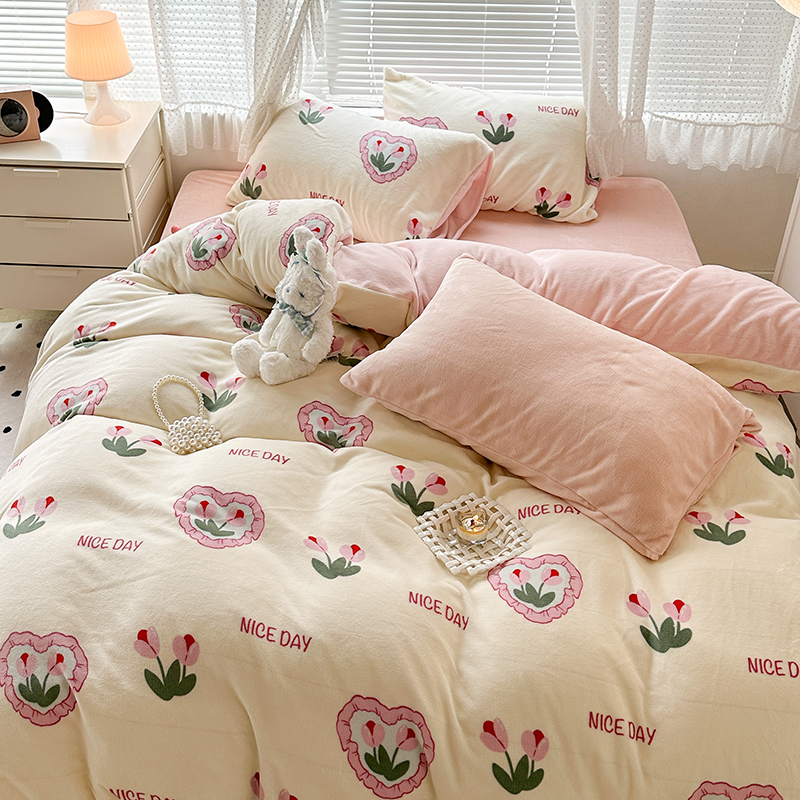 商品名称:昔可家纺 2023新款高克重印花牛奶绒小清新系列四件套 粉心郁金香