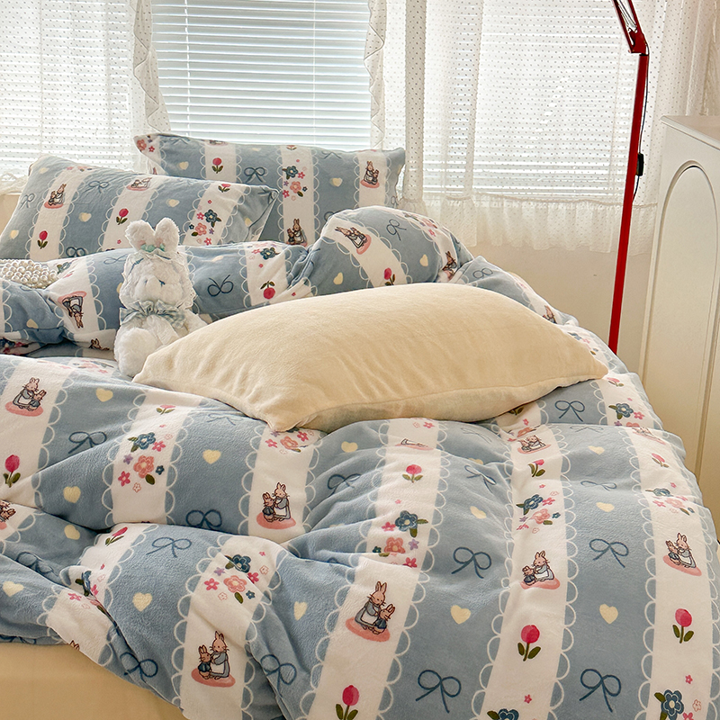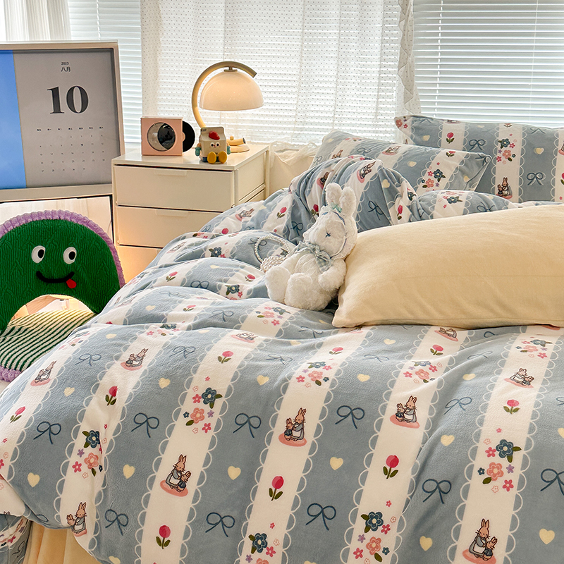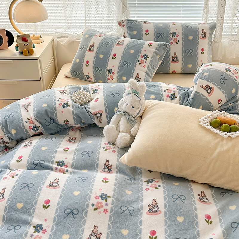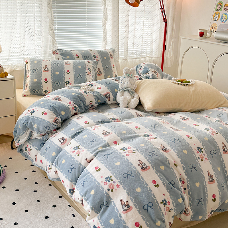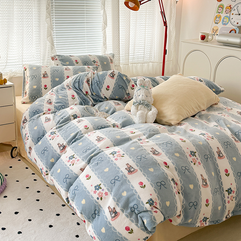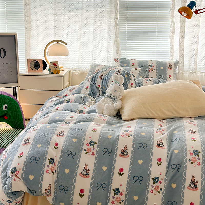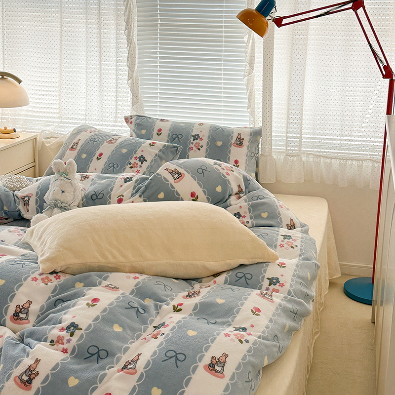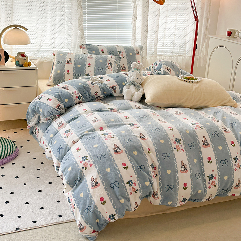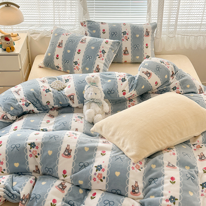 商品名称:昔可家纺 2023新款高克重印花牛奶绒小清新系列四件套 竖条蕾丝兔
