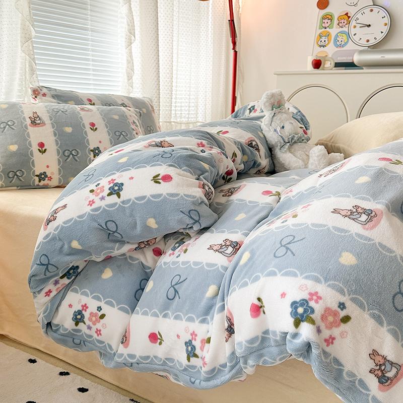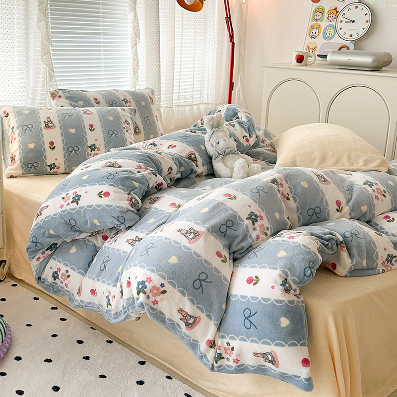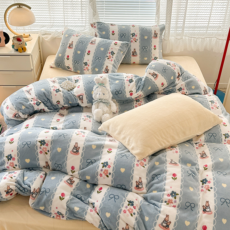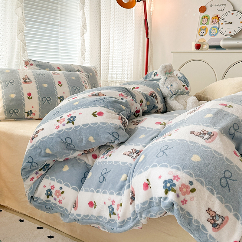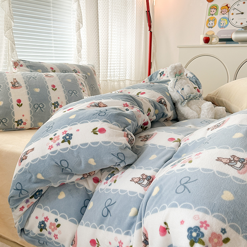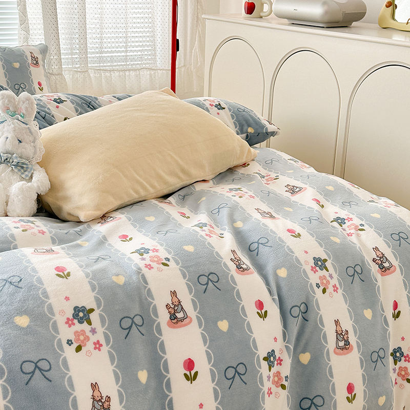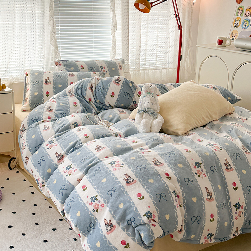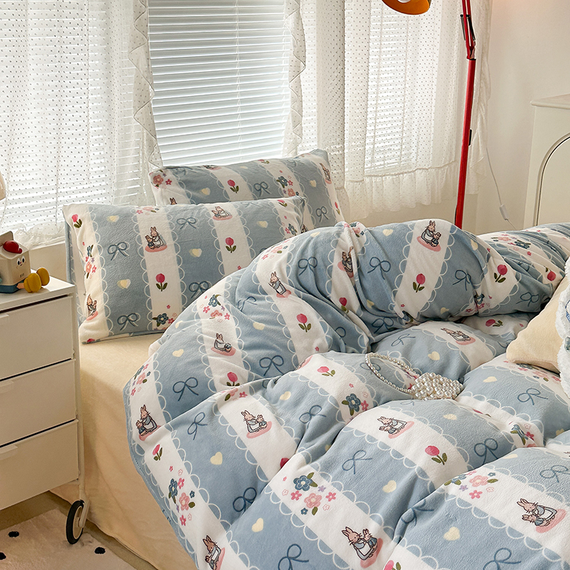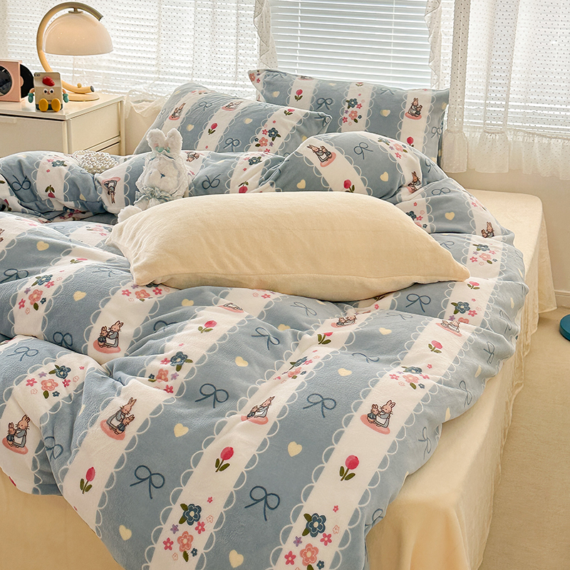 商品名称:昔可家纺 2023新款高克重印花牛奶绒小清新系列四件套 竖条蕾丝兔