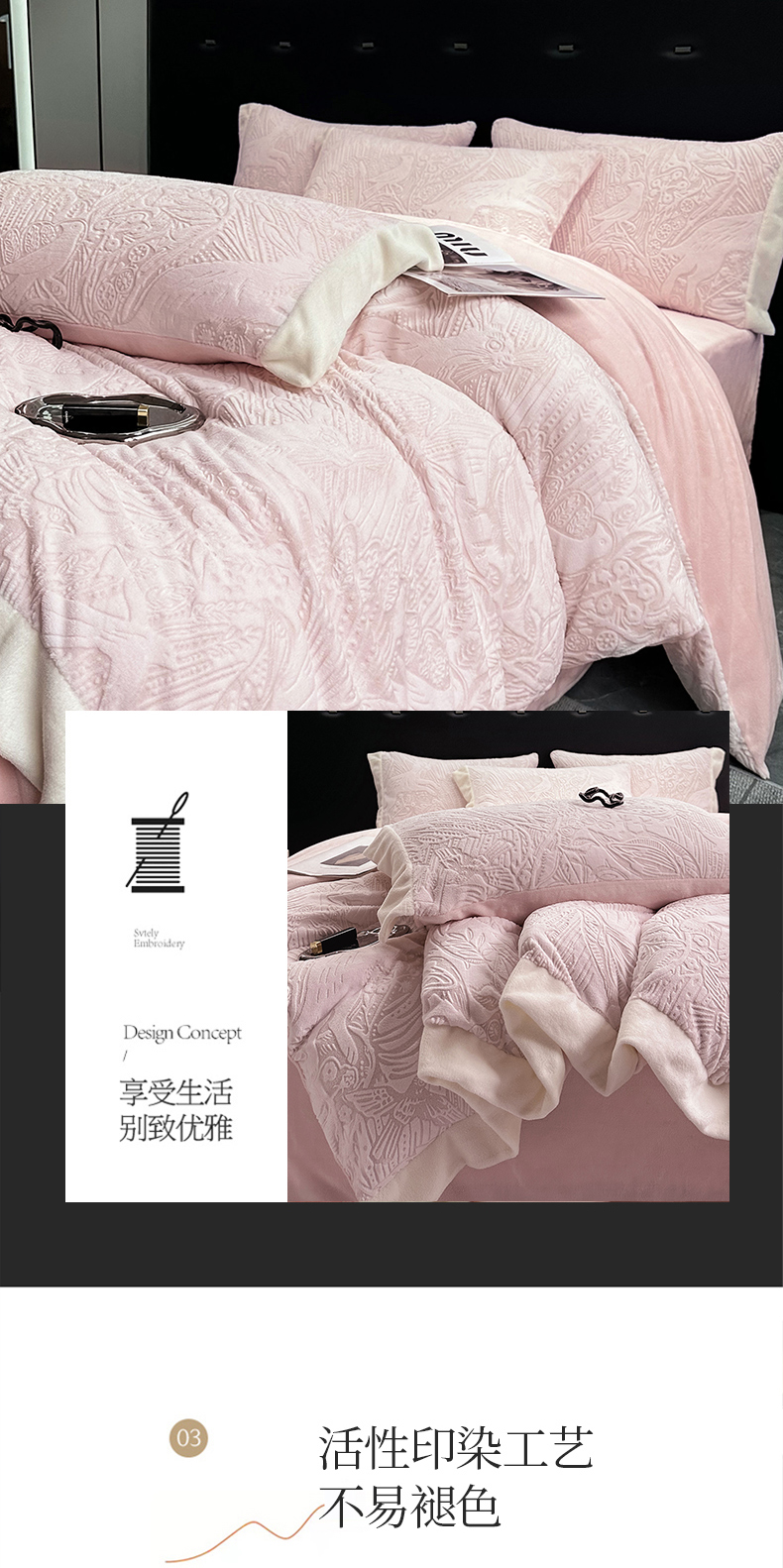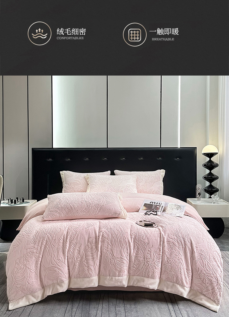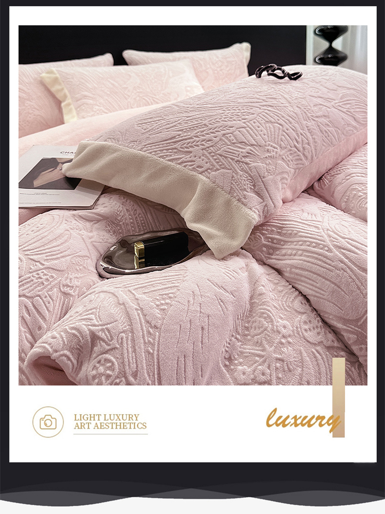床品套件 > 宅家居 2023新款高奢加厚A类高克重浮雕花绒剪花烂花牛奶绒四件套 布鲁斯-粉色
