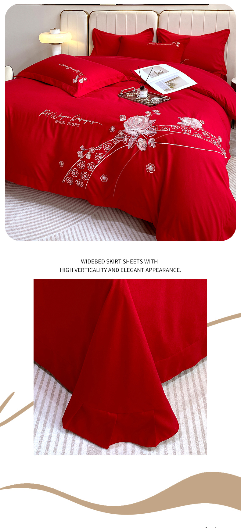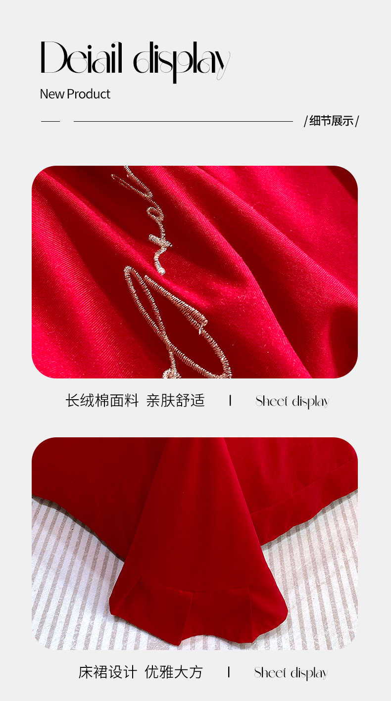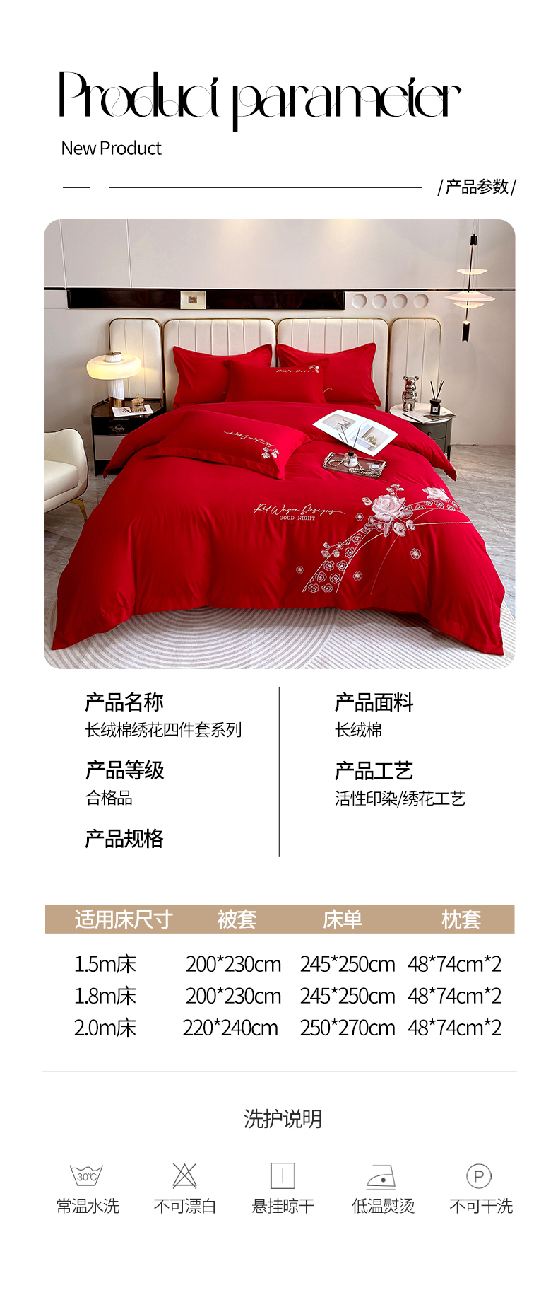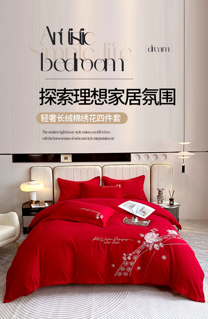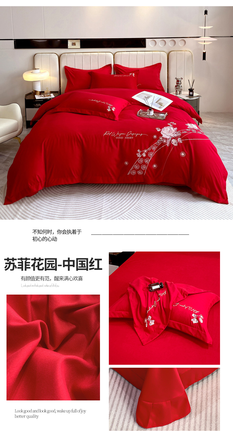 商品名称:帛缔思 2023新款轻奢长绒棉宽边绣花四件套-苏菲花园 苏菲花园-中国红
