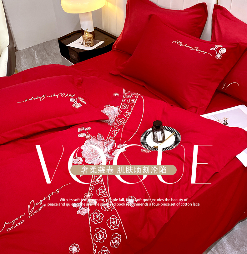 帛缔思 2023新款轻奢长绒棉宽边绣花四件套-苏菲花园 苏菲花园-中国红