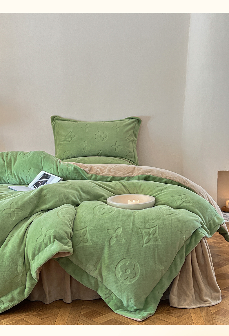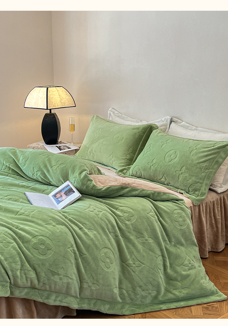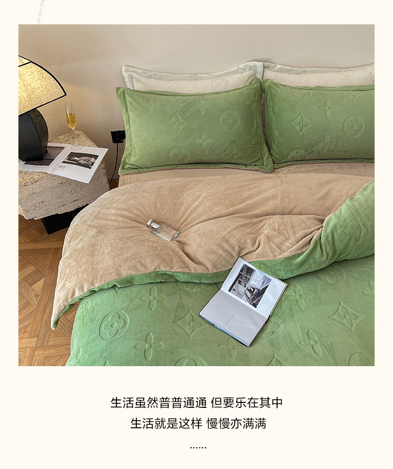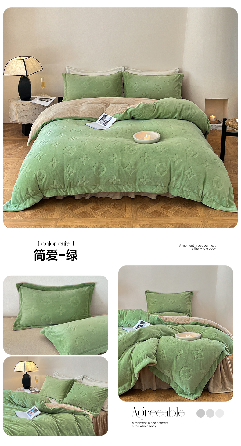 当前位置: 91家纺网 > 商品网购 > 床品套件 > 四件套 > 牛奶绒四件套 > 金麦家纺 2023新款230g高克重牛奶绒雕花四件套 简爱-绿