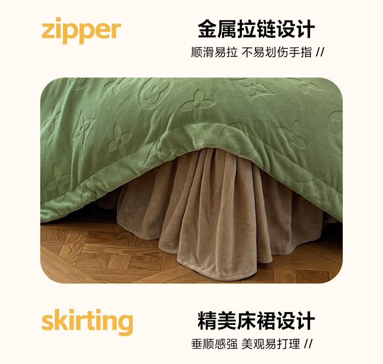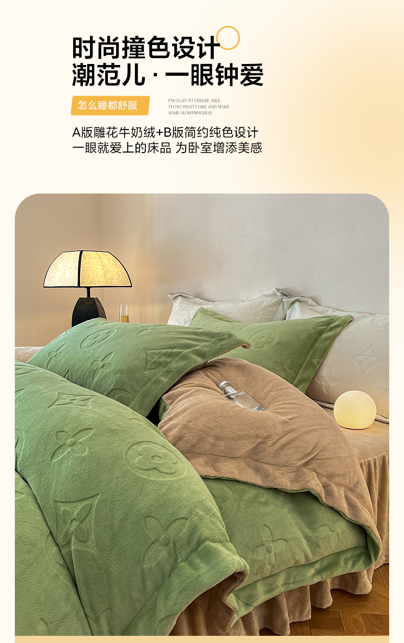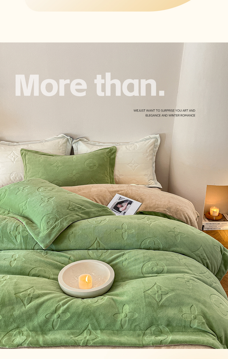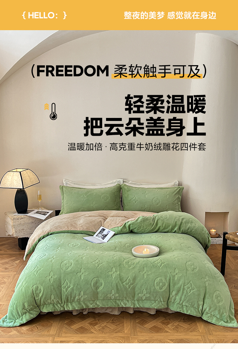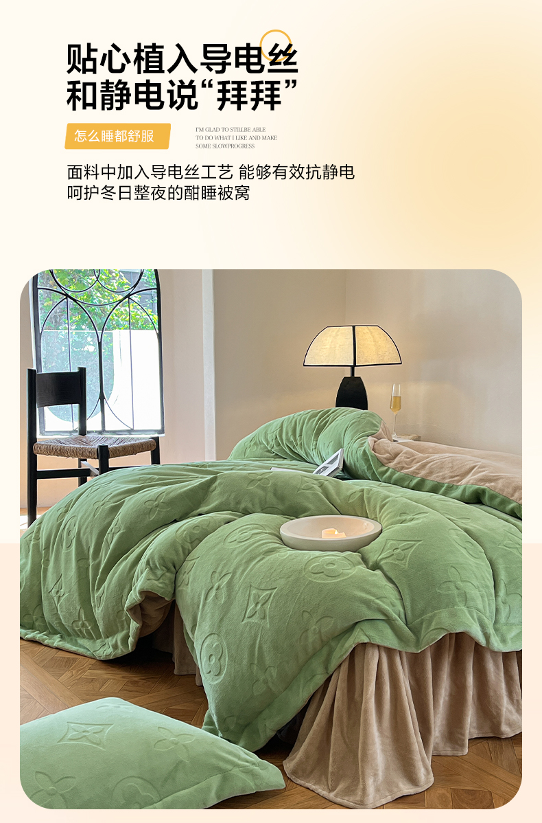 当前位置: 91家纺网 > 商品网购 > 床品套件 > 四件套 > 牛奶绒四件套 > 金麦家纺 2023新款230g高克重牛奶绒雕花四件套 简爱-绿