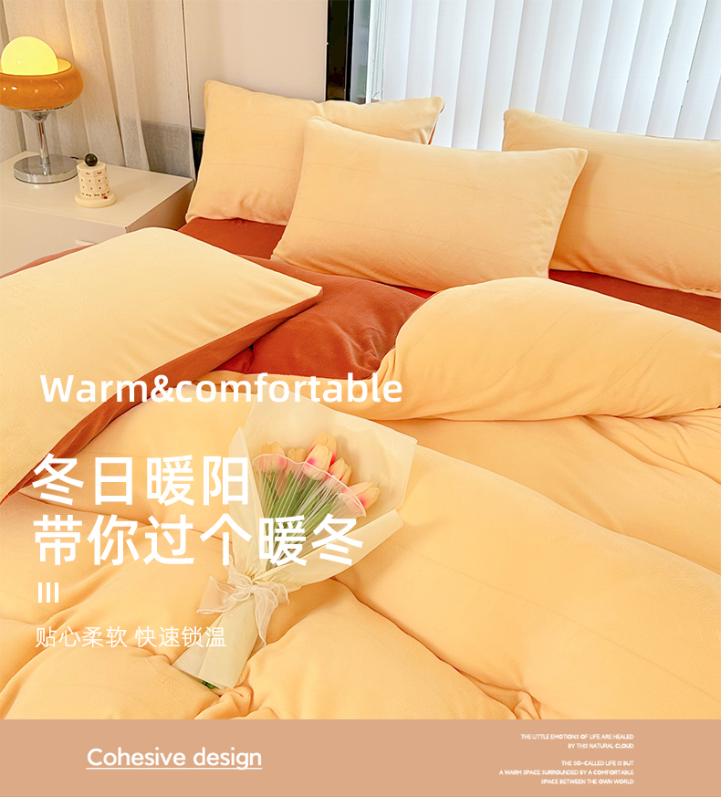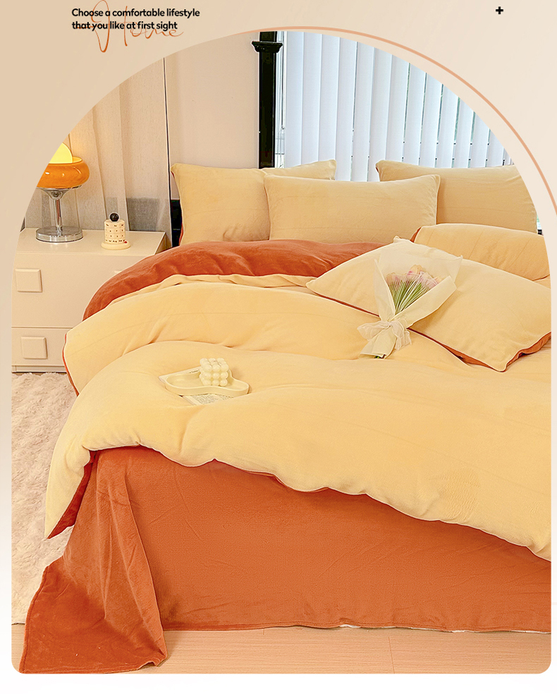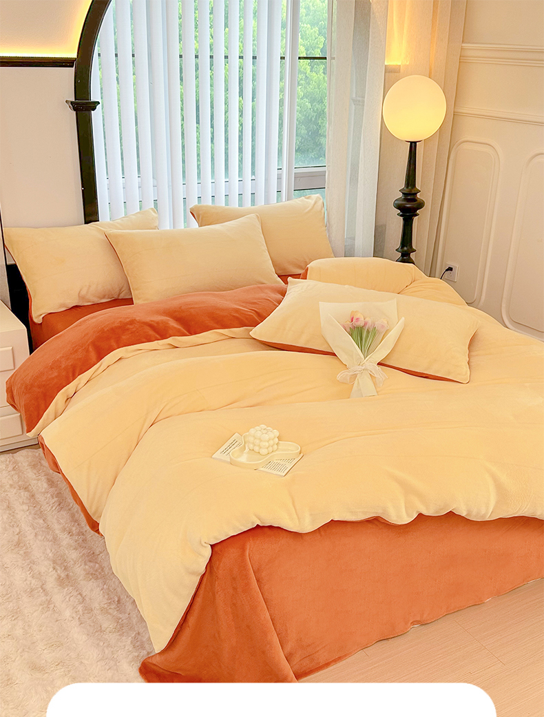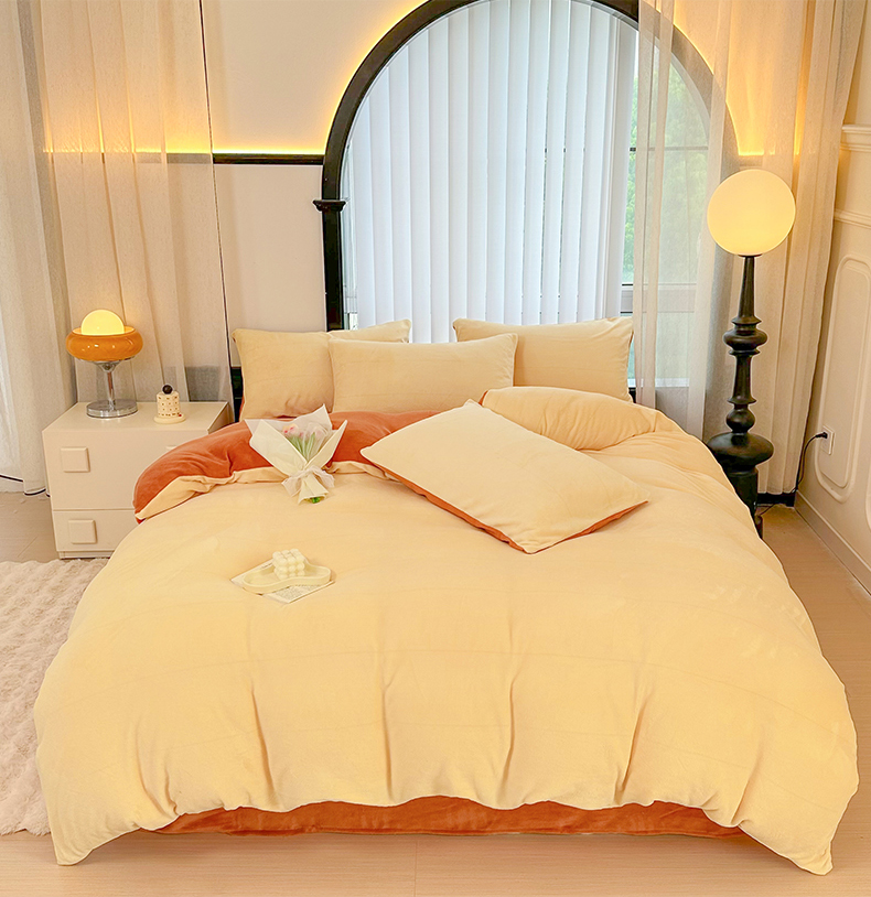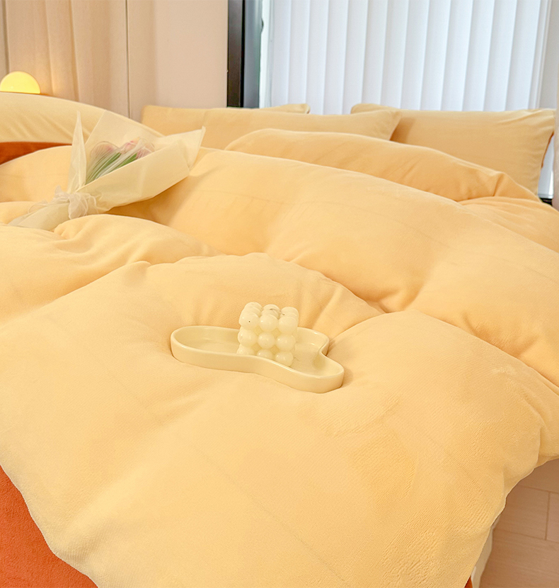 商品名称:迷仙巢家纺 2023新款双拼牛奶绒四件套 奶油黄加焦糖
