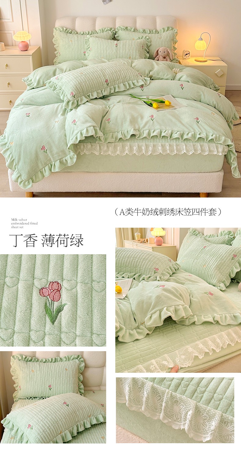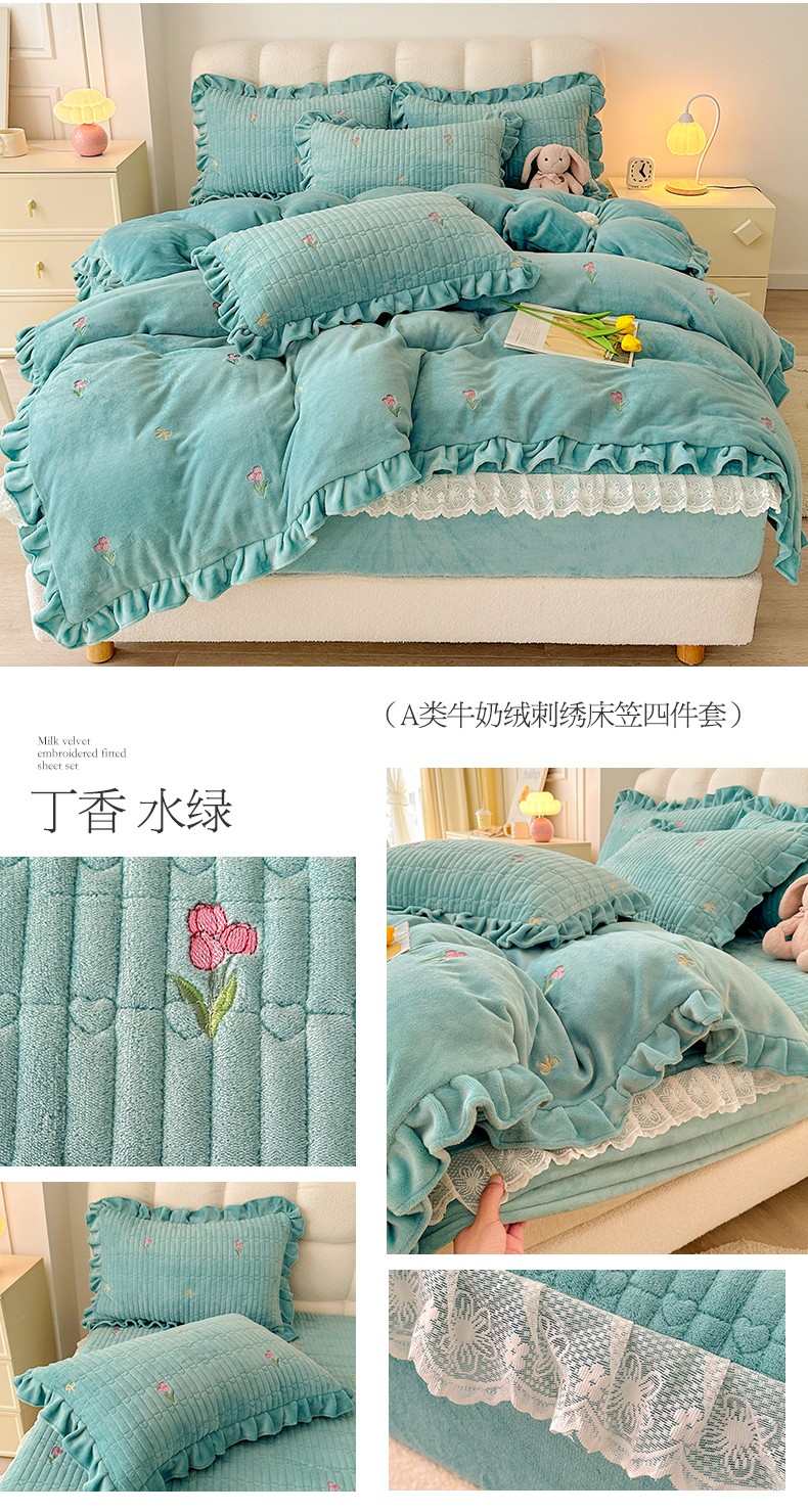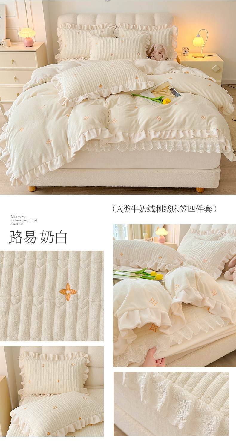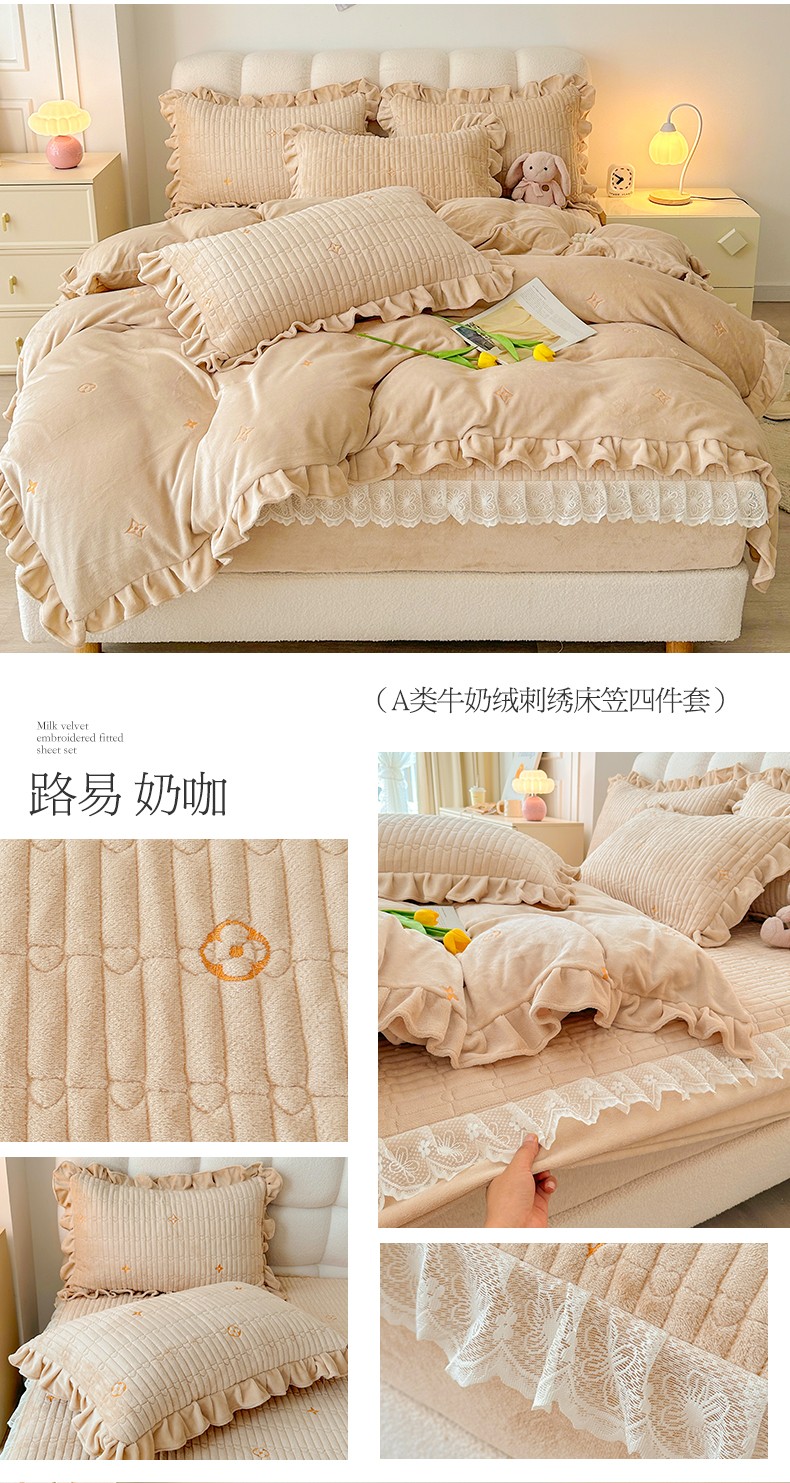 (总)宜凡 2023新款牛奶绒夹棉绗缝绣花床笠四件套