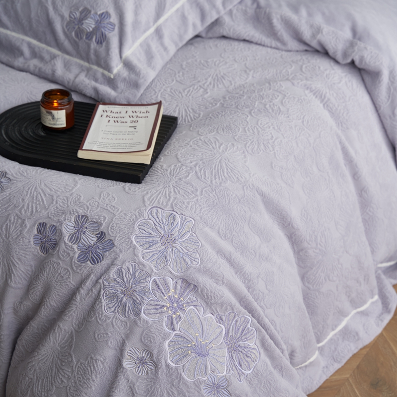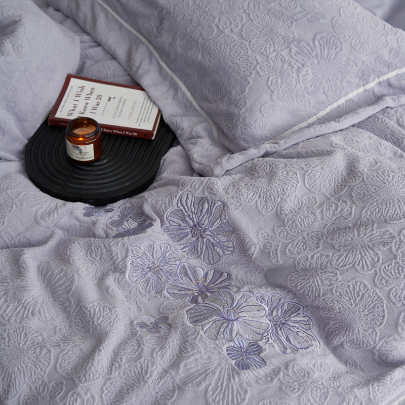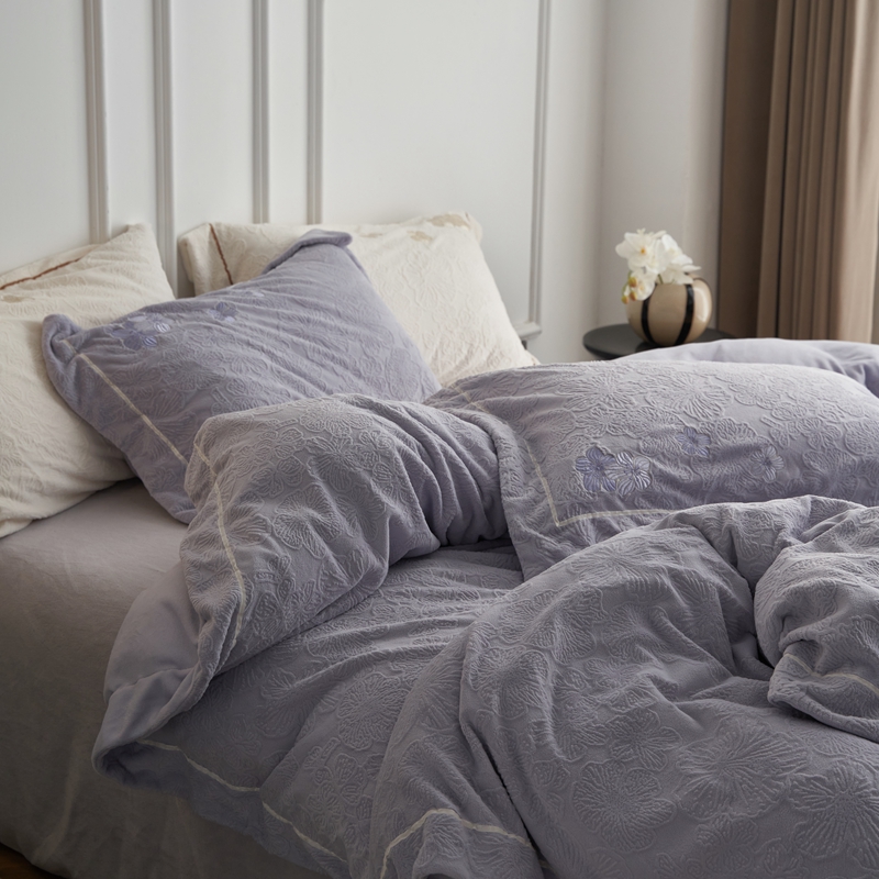 商品名称:云胡 2023新款230克雕花牛奶绒绣花贴线宽边工艺款四件套馥郁紫