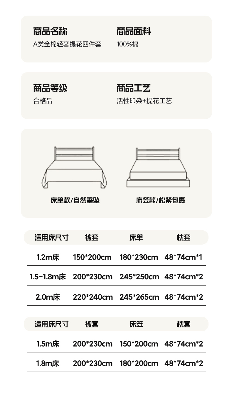 [{"sp_id":11,"sp_name":"\u989c\u8272\u5206\u7c7b","sp_format":2,"sp_list":[{"sp_value_id":59,"sp_value_name":"\u6770\u897f-\u4f18\u96c5\u7c89","sp_value_image":{"id":999,"path":"https:\/\/img3.91jf.com\/ghelp\/2024\/20240303\/1186d3f6-6755-4df8-9cb7-aadd621e9f6620240303193622360.jpg_30_30.jpg"},"sp_value_video":{"id":0,"img":"","path":"","time":0,"download_num":0,"play_num":0},"price":"100.00","storage":600,"weight":"1.510","is_check_weight":0,"plus_price":"","sp_sort":11}]},{"sp_id":10,"sp_name":"\u9002\u7528\u5e8a\u5c3a\u5bf8","sp_format":1,"sp_list":[{"sp_value_id":38,"sp_value_name":"1.2m\u5e8a\u5355\u6b3e\u4e09\u4ef6\u5957","sp_value_image":{"id":0,"path":""},"sp_value_video":{"id":0,"img":"","path":"","time":0,"download_num":0,"play_num":0},"price":"100.00","storage":100,"weight":"1.510","is_check_weight":0,"plus_price":"","sp_sort":2},{"sp_value_id":40,"sp_value_name":"1.5m\u5e8a\u5355\u6b3e\u56db\u4ef6\u5957","sp_value_image":{"id":0,"path":""},"sp_value_video":{"id":0,"img":"","path":"","time":0,"download_num":0,"play_num":0},"price":"130.00","storage":100,"weight":"2.210","is_check_weight":0,"plus_price":"","sp_sort":4},{"sp_value_id":41,"sp_value_name":"1.8m\u5e8a\u5355\u6b3e\u56db\u4ef6\u5957","sp_value_image":{"id":0,"path":""},"sp_value_video":{"id":0,"img":"","path":"","time":0,"download_num":0,"play_num":0},"price":"130.00","storage":100,"weight":"2.210","is_check_weight":0,"plus_price":"","sp_sort":5},{"sp_value_id":42,"sp_value_name":"2.0m\u5e8a\u5355\u6b3e\u56db\u4ef6\u5957","sp_value_image":{"id":0,"path":""},"sp_value_video":{"id":0,"img":"","path":"","time":0,"download_num":0,"play_num":0},"price":"140.00","storage":100,"weight":"2.450","is_check_weight":0,"plus_price":"","sp_sort":6},{"sp_value_id":736,"sp_value_name":"1.5m\u5e8a\u7b20\u6b3e\u56db\u4ef6\u5957","sp_value_image":{"id":0,"path":""},"sp_value_video":{"id":0,"img":"","path":"","time":0,"download_num":0,"play_num":0},"price":"135.00","storage":100,"weight":"2.070","is_check_weight":0,"plus_price":"","sp_sort":10},{"sp_value_id":766,"sp_value_name":"1.8m\u5e8a\u7b20\u6b3e\u56db\u4ef6\u5957","sp_value_image":{"id":0,"path":""},"sp_value_video":{"id":0,"img":"","path":"","time":0,"download_num":0,"play_num":0},"price":"135.00","storage":100,"weight":"2.170","is_check_weight":0,"plus_price":"","sp_sort":14}]}]