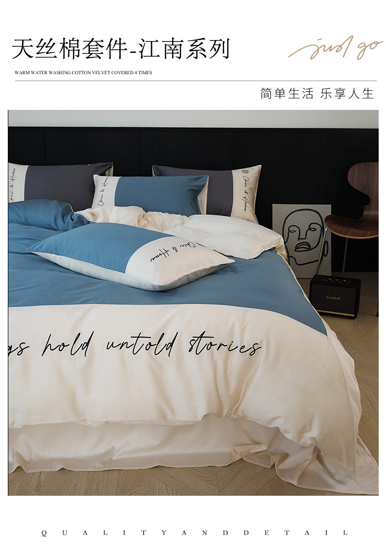 当前位置: 91家纺网 > 商品网购 > 床品套件 > 四件套 > 全棉普通四件套 > 2024春夏新款天丝棉四件套--江南系列(常规图) 江南-湖蓝