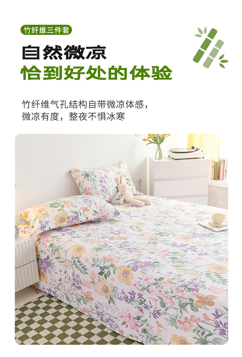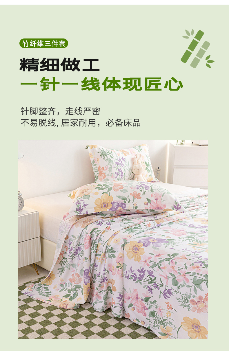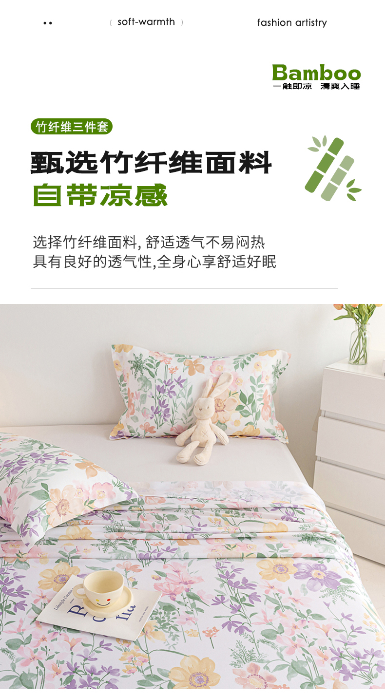 金泰莱 2025新款印花竹纤维凉席三件套软凉席竹席盖毯子 鸿韵-粉