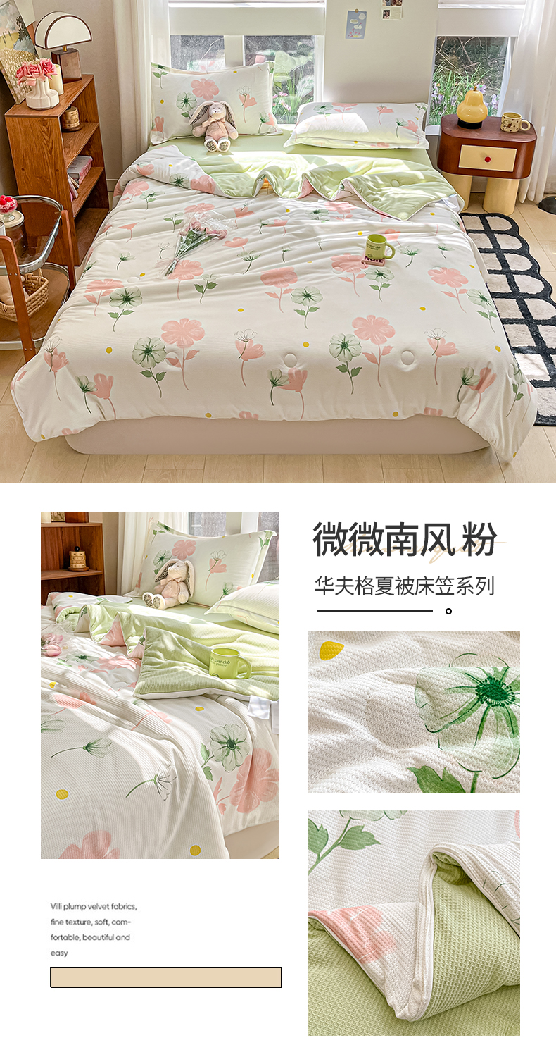 • 91家纺网 家纺一手货源 找家纺 吉祥家纺 2024新款华夫格夏被床笠四件套 微微南风 粉