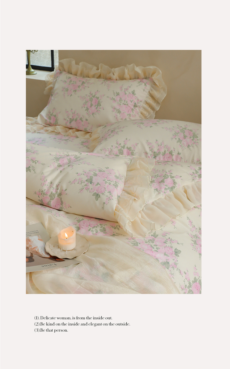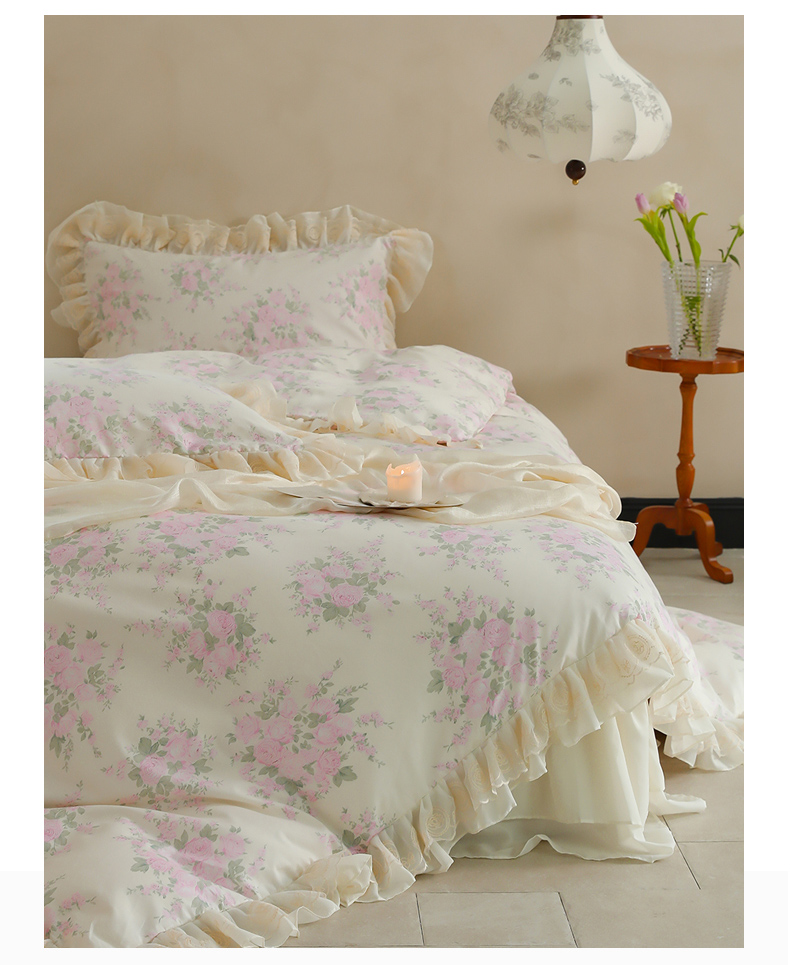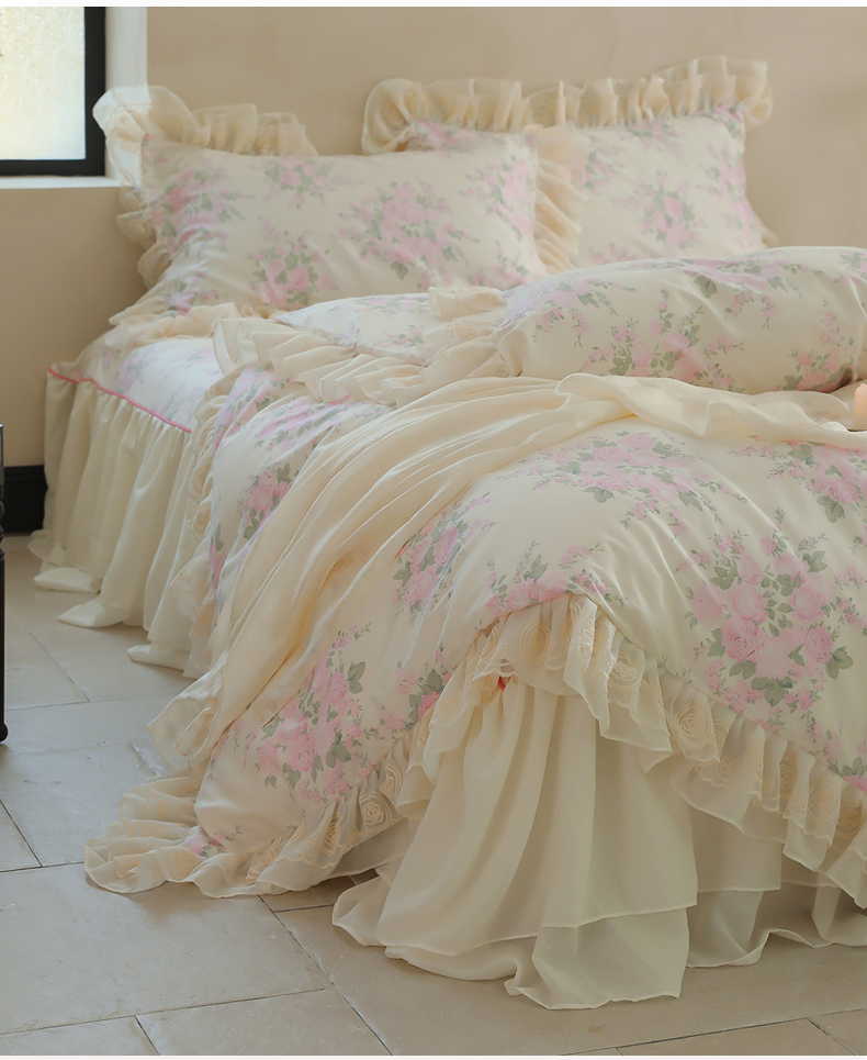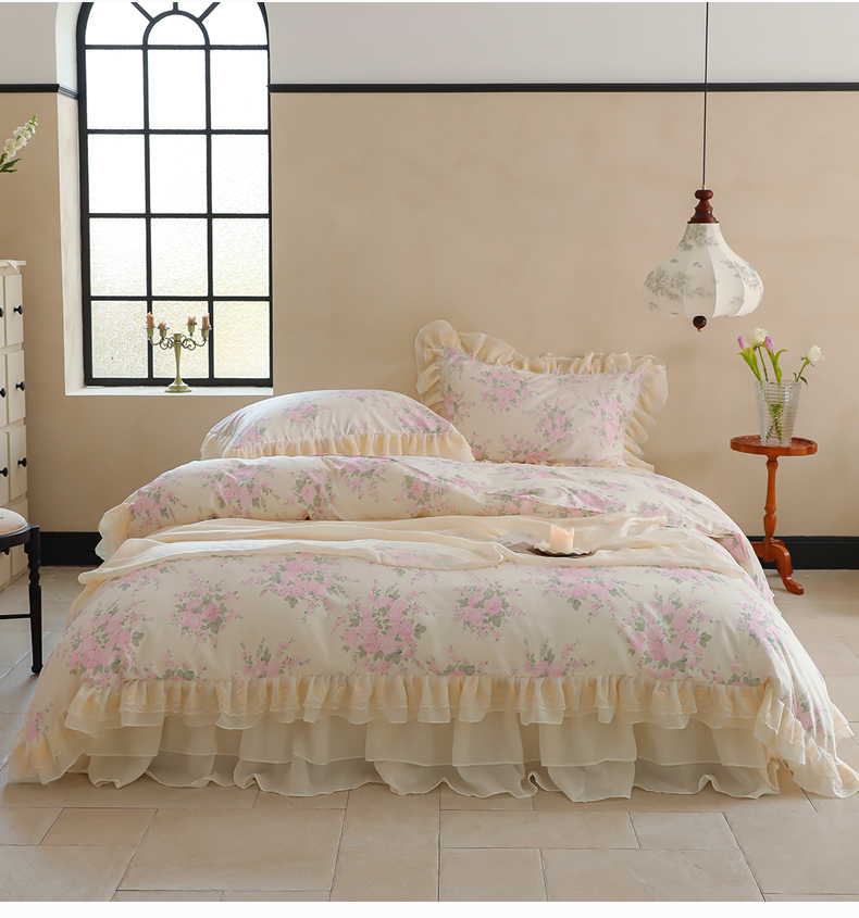菊上家纺 2024新款40s全棉复古法式雪纺蕾丝花边印花床裙款四件套粉黛