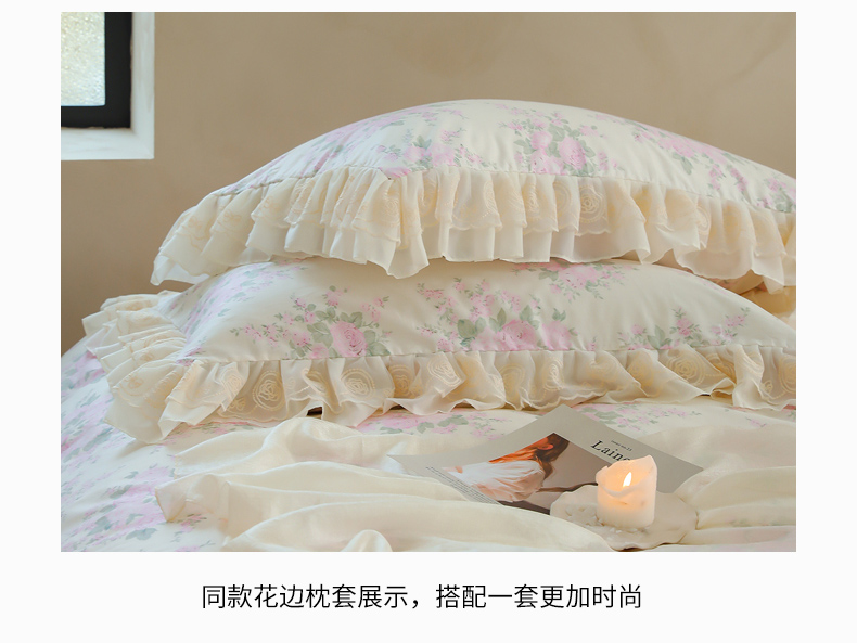 商品名称:菊上家纺 2024新款40s全棉复古法式雪纺蕾丝花边印花床裙款四件套粉黛