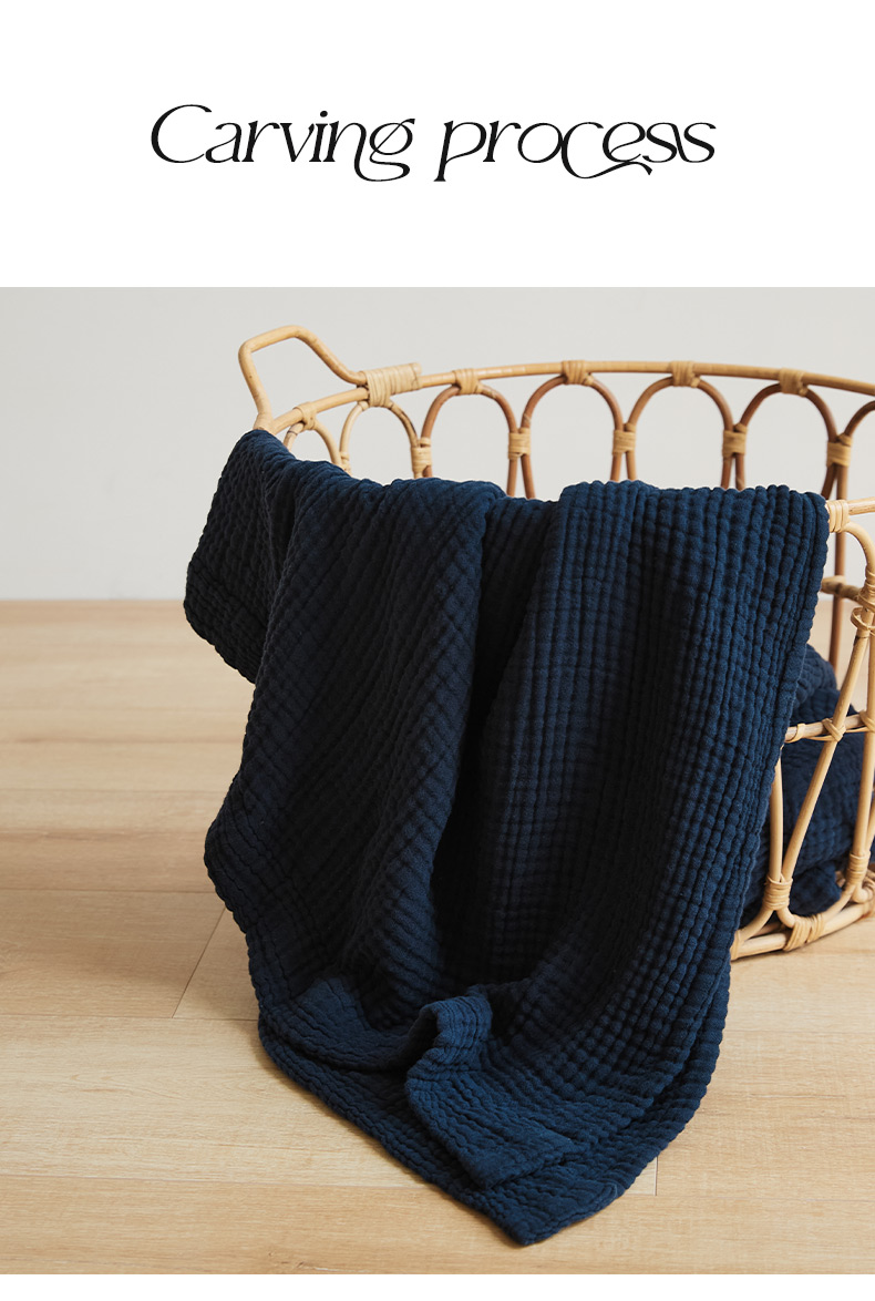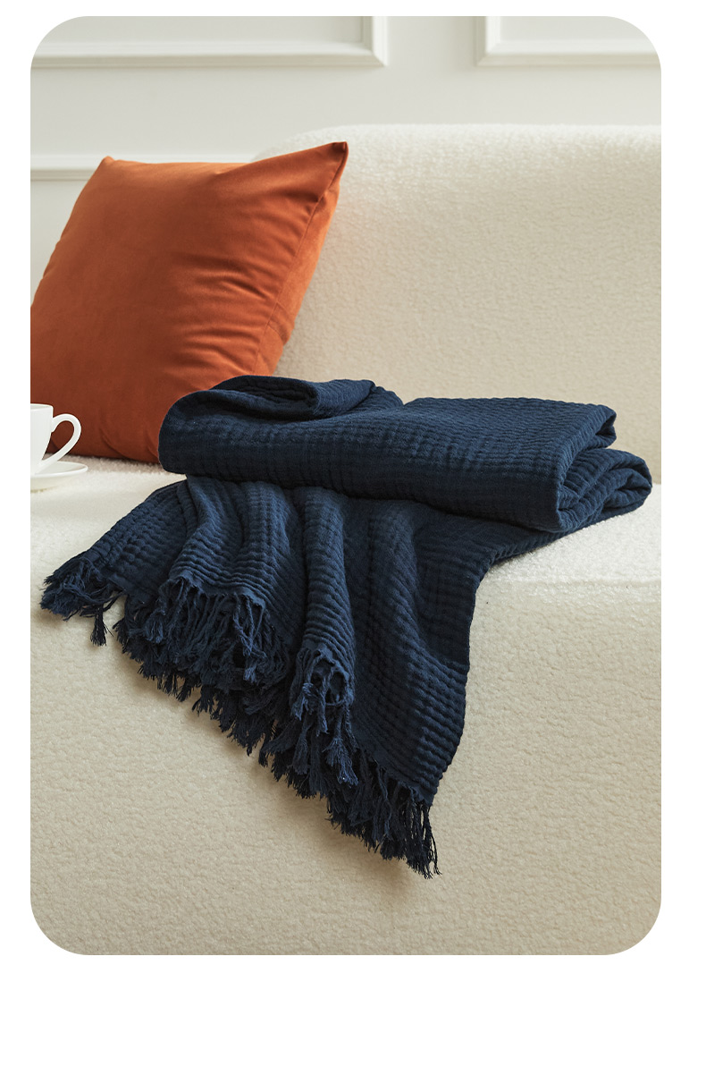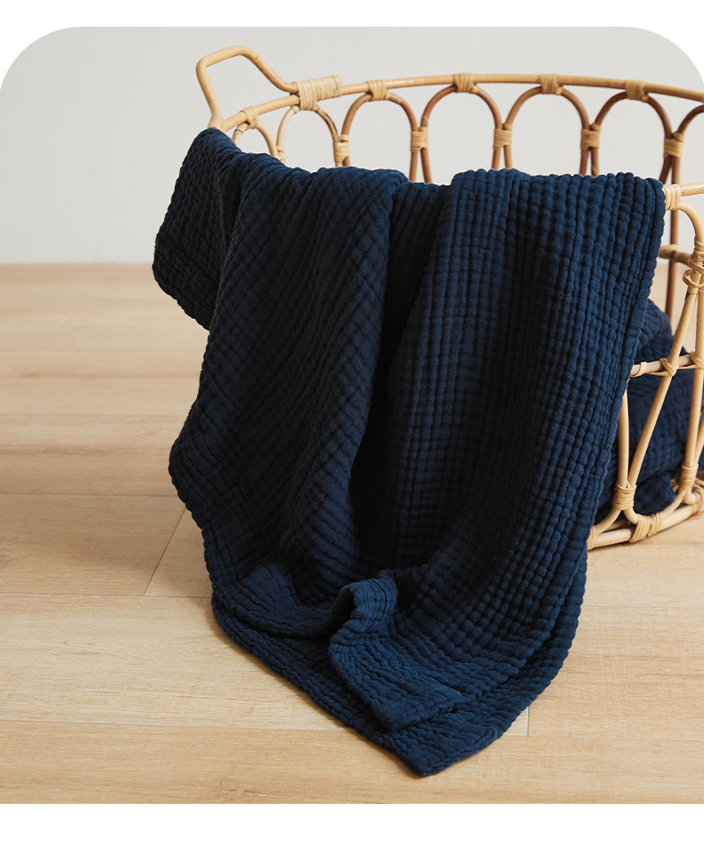 EH家居 2024新款纯棉四层皱皱纱毯盖毯休闲毯 包边款-深蓝