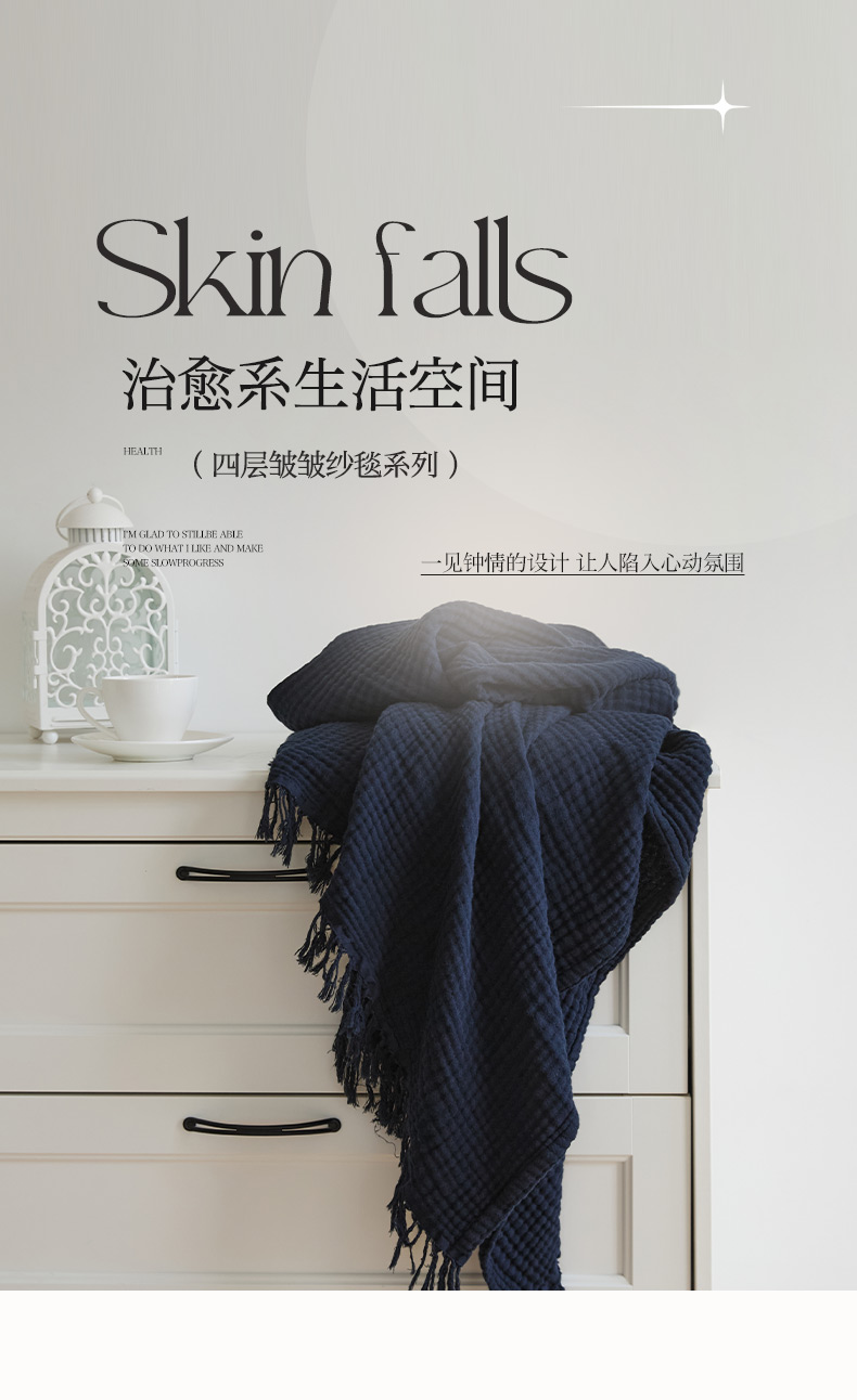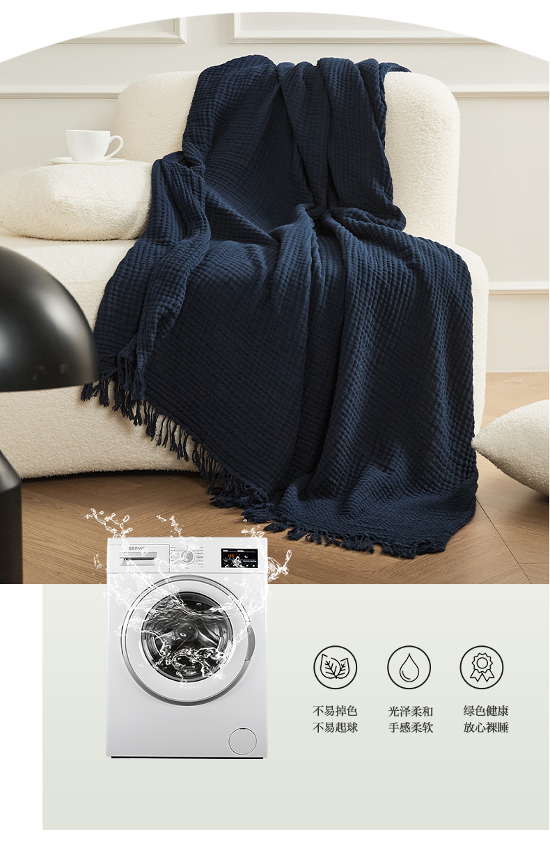 商品名称:EH家居 2024新款纯棉四层皱皱纱毯盖毯休闲毯 包边款-深蓝