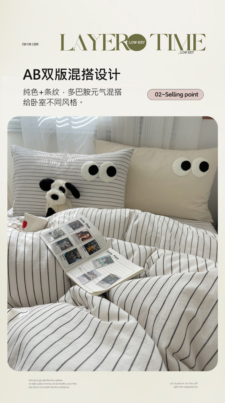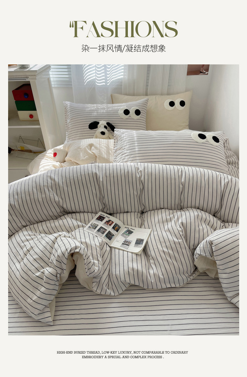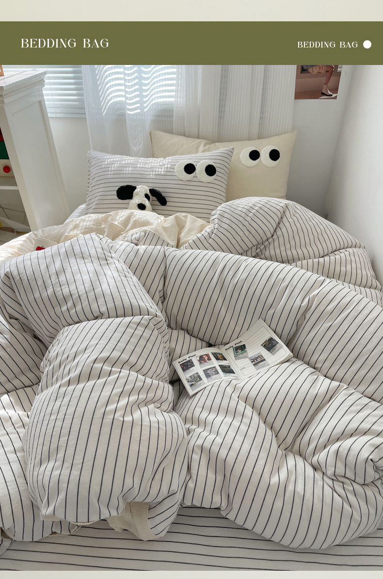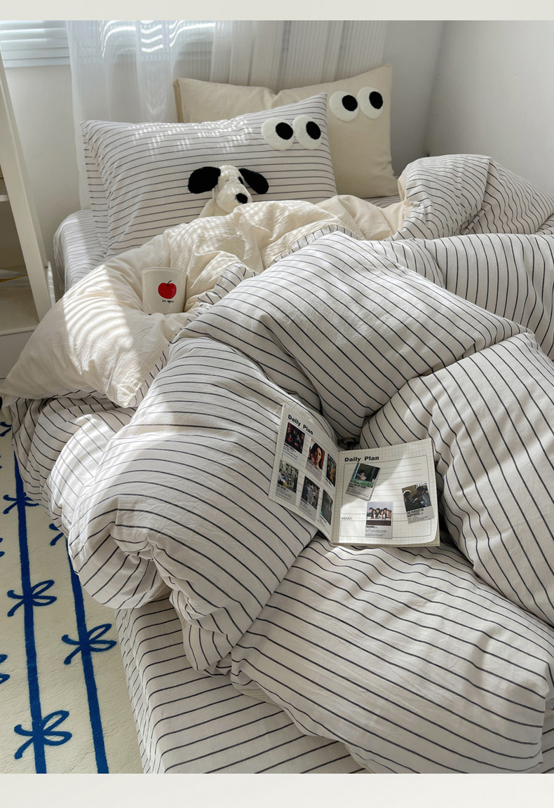 丽涵家纺 2024新款全棉混搭色织水洗棉大眼学生四件套纯棉三件套 大眼密条浅米2