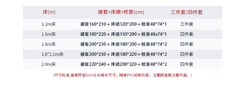 1.8床:床裙180x200+被套200x230+枕套2只(四件套)