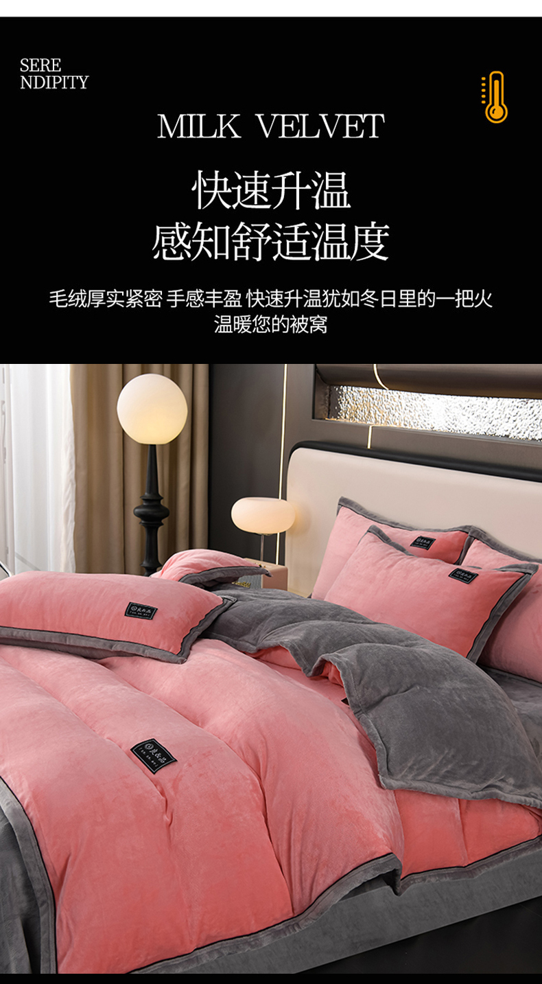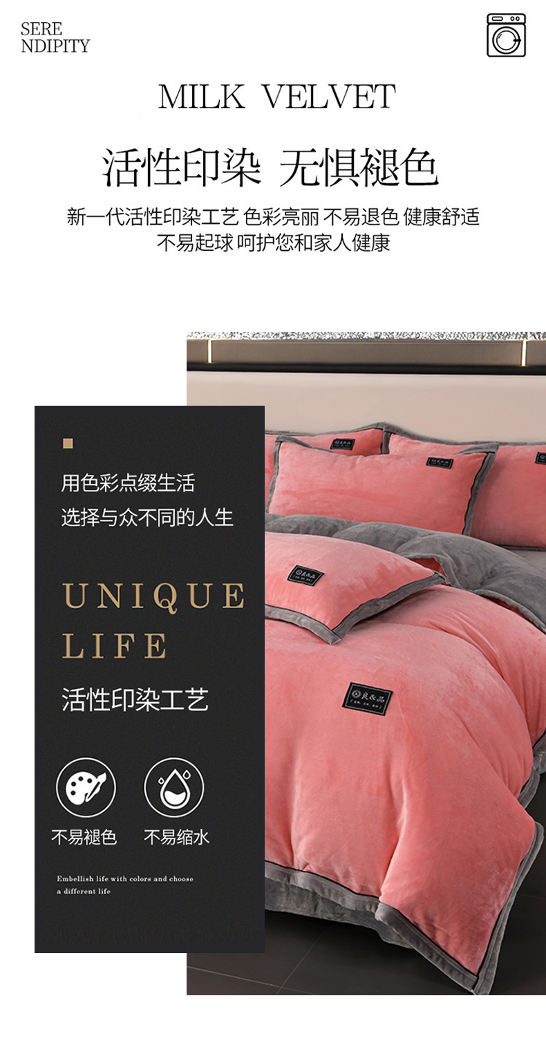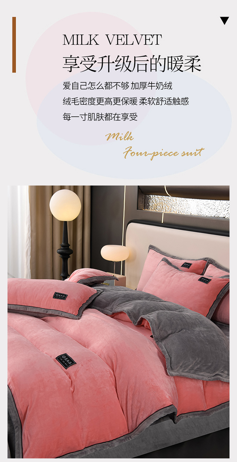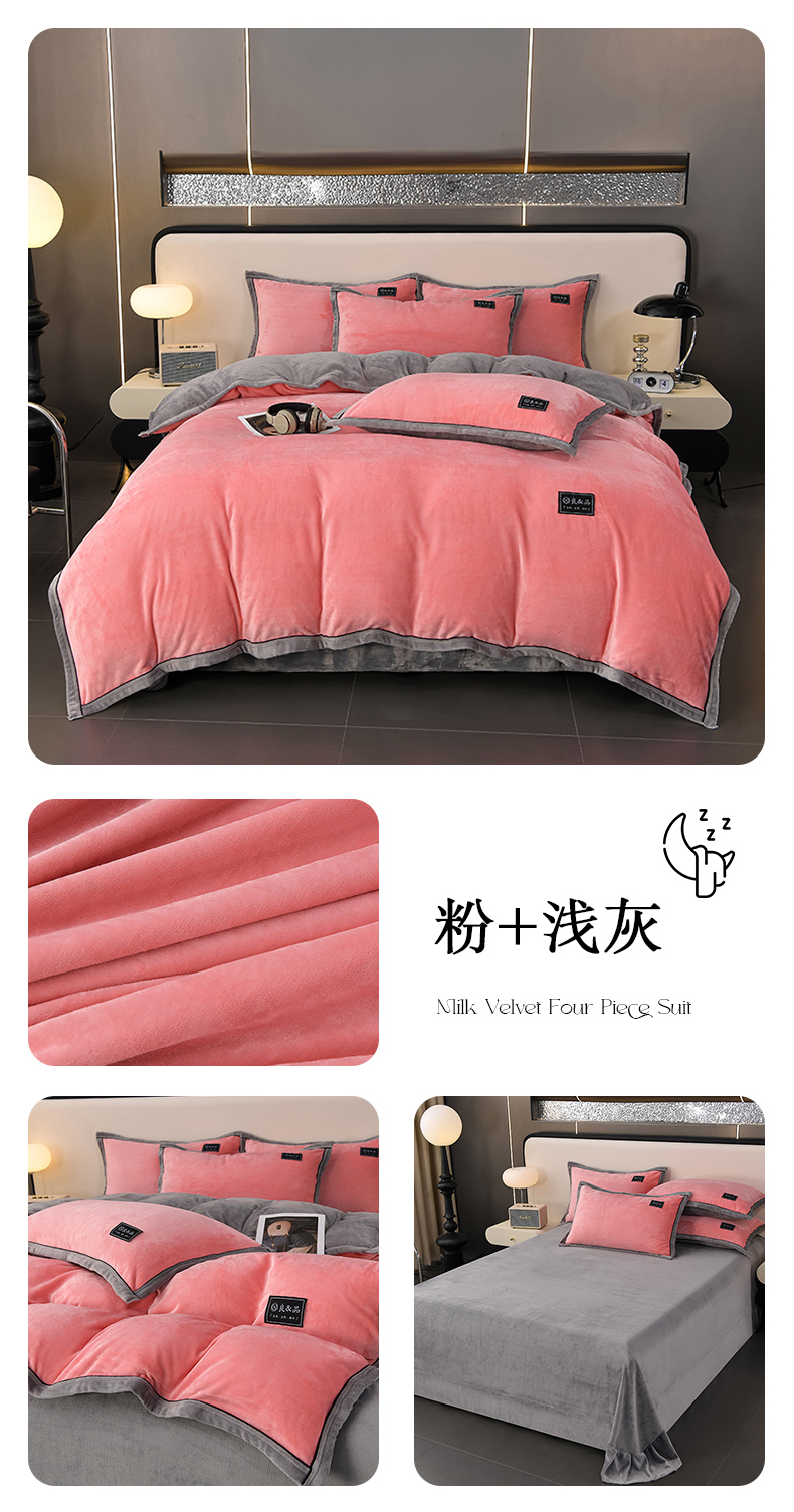 商品名称:绒耀2025纯色加厚牛奶绒四件套轻奢款大包边素色直播爆款 粉+浅灰