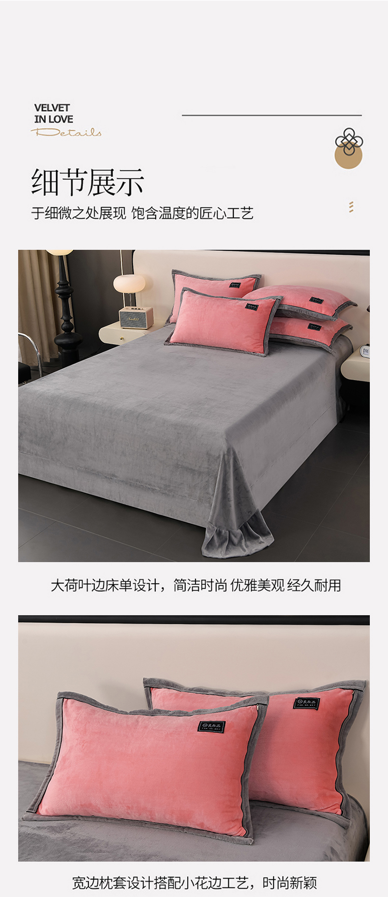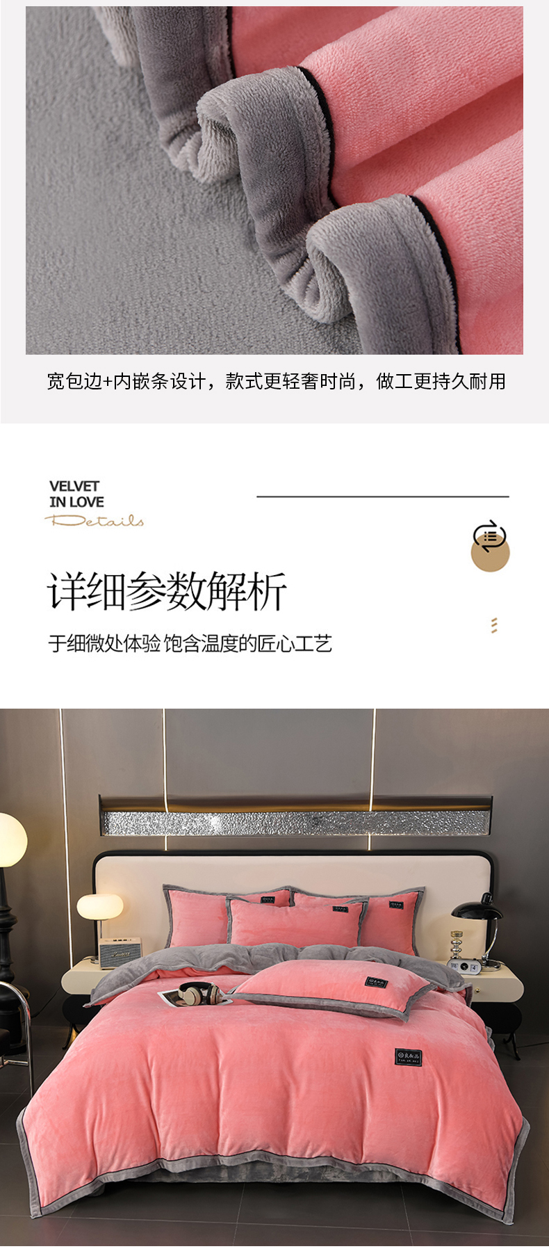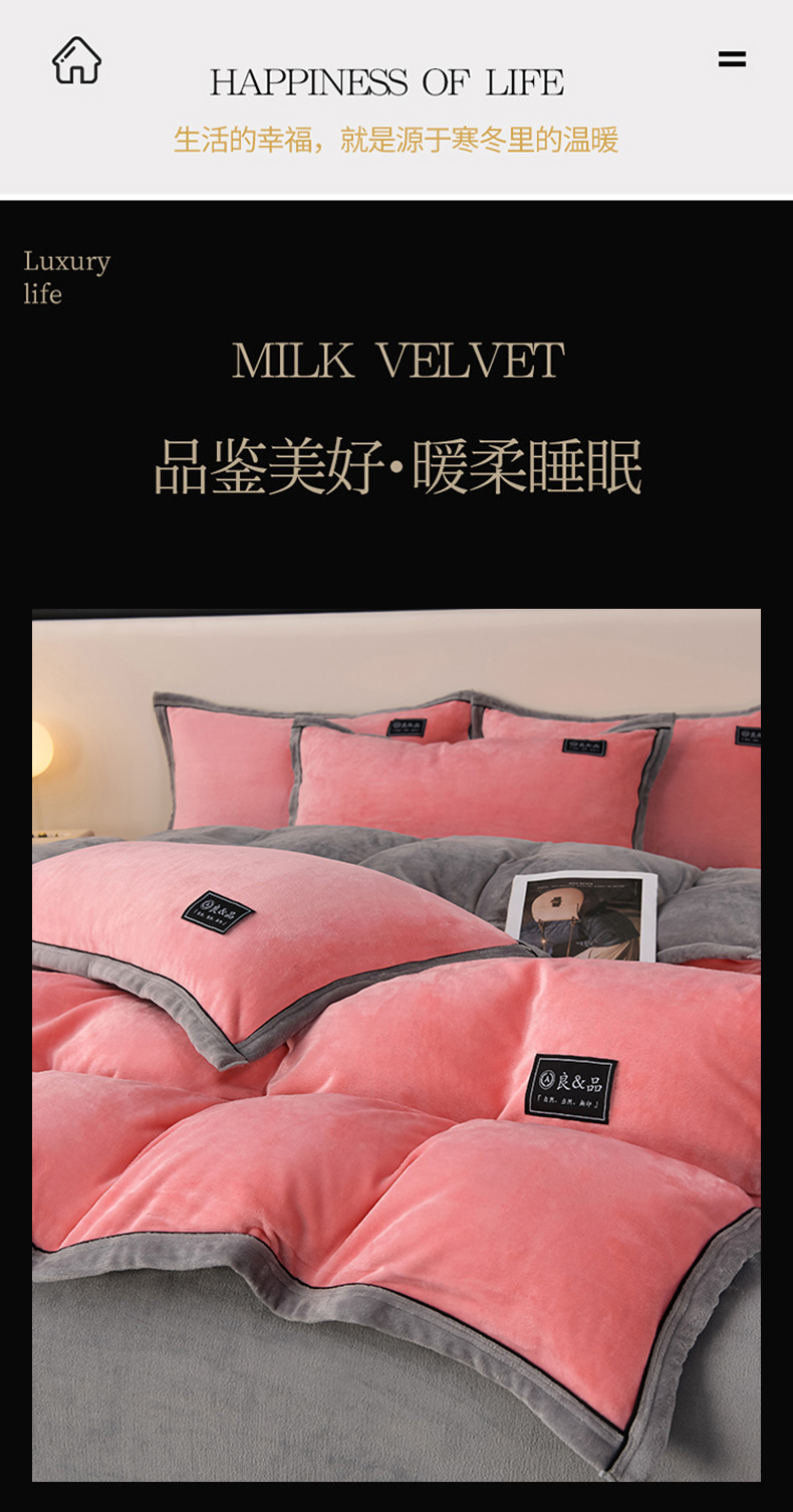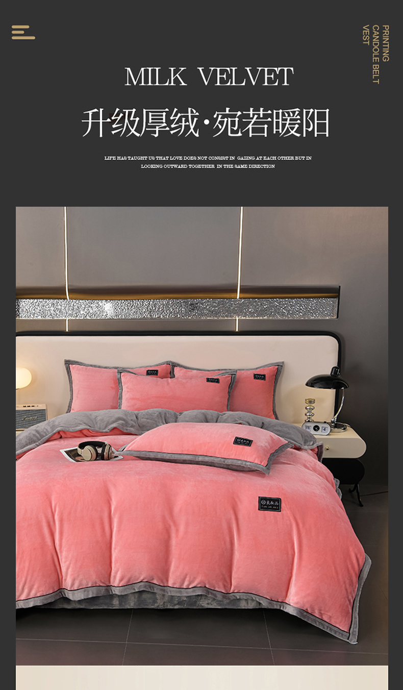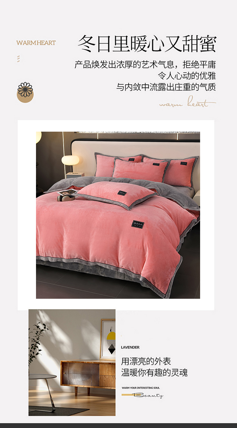 商品名称:绒耀2025纯色加厚牛奶绒四件套轻奢款大包边素色直播爆款 粉+浅灰