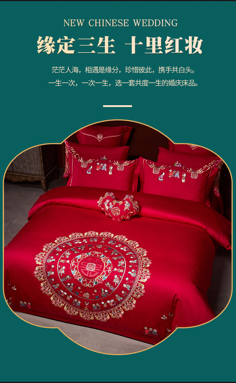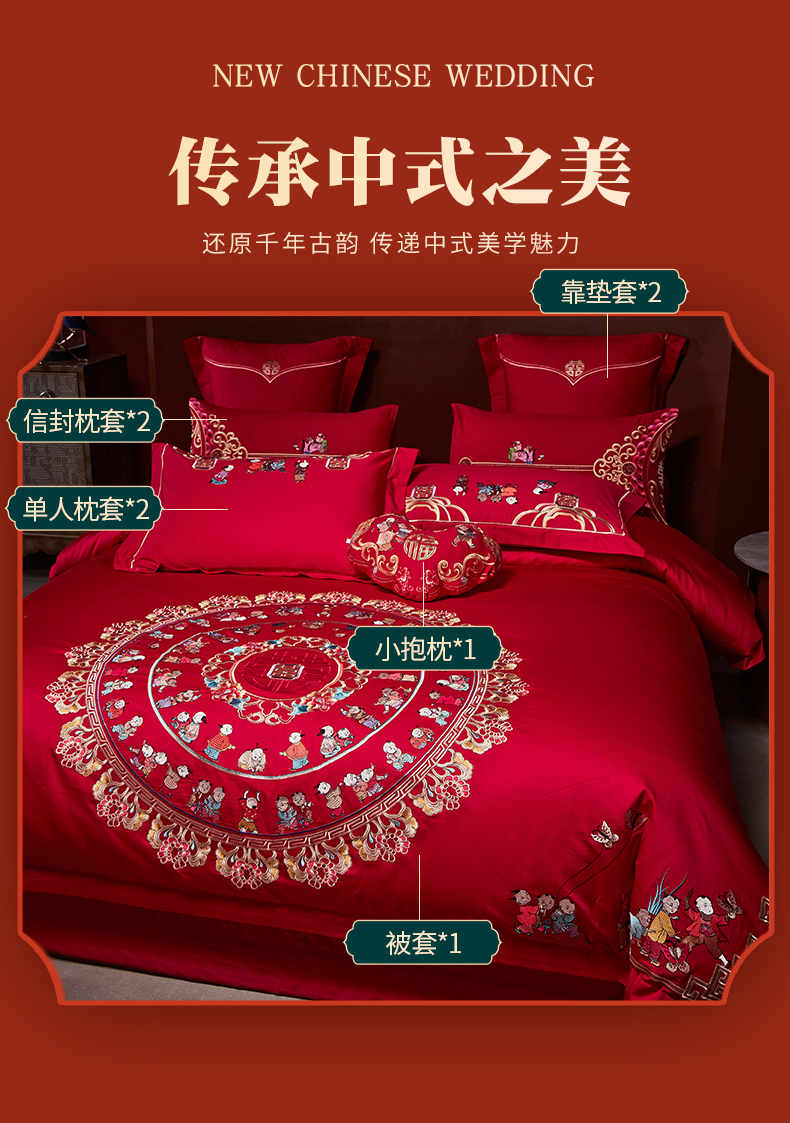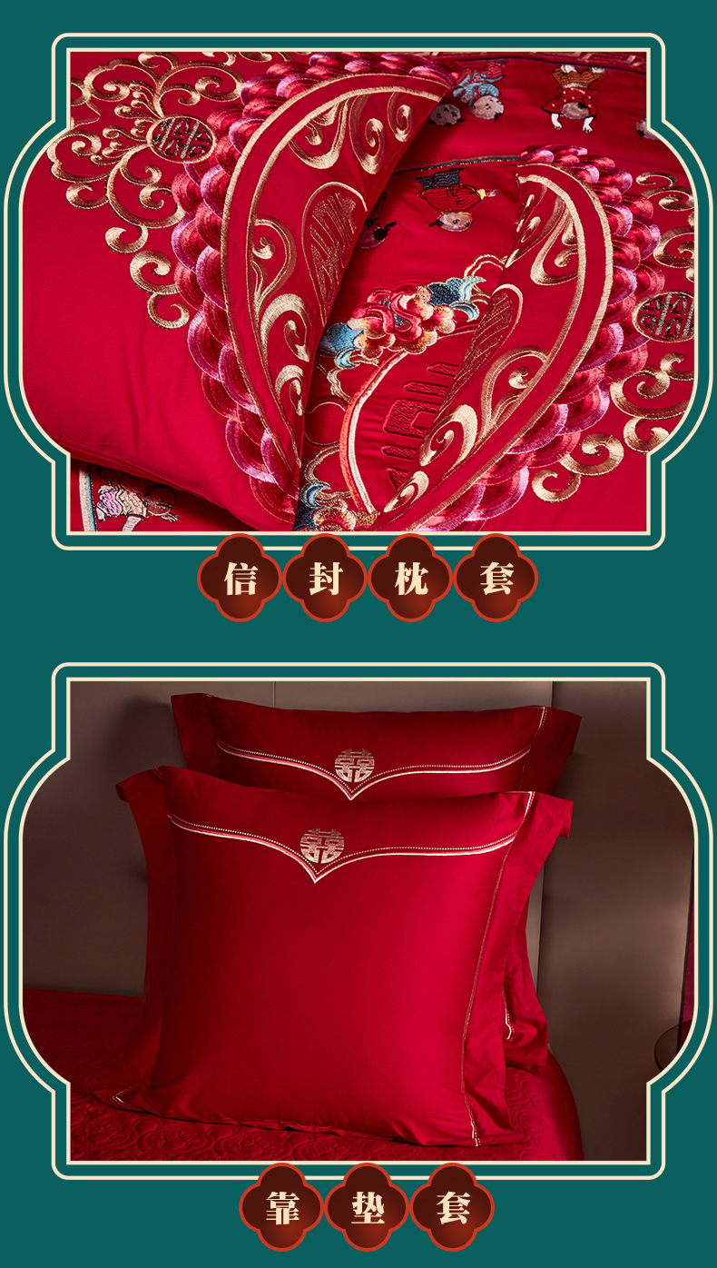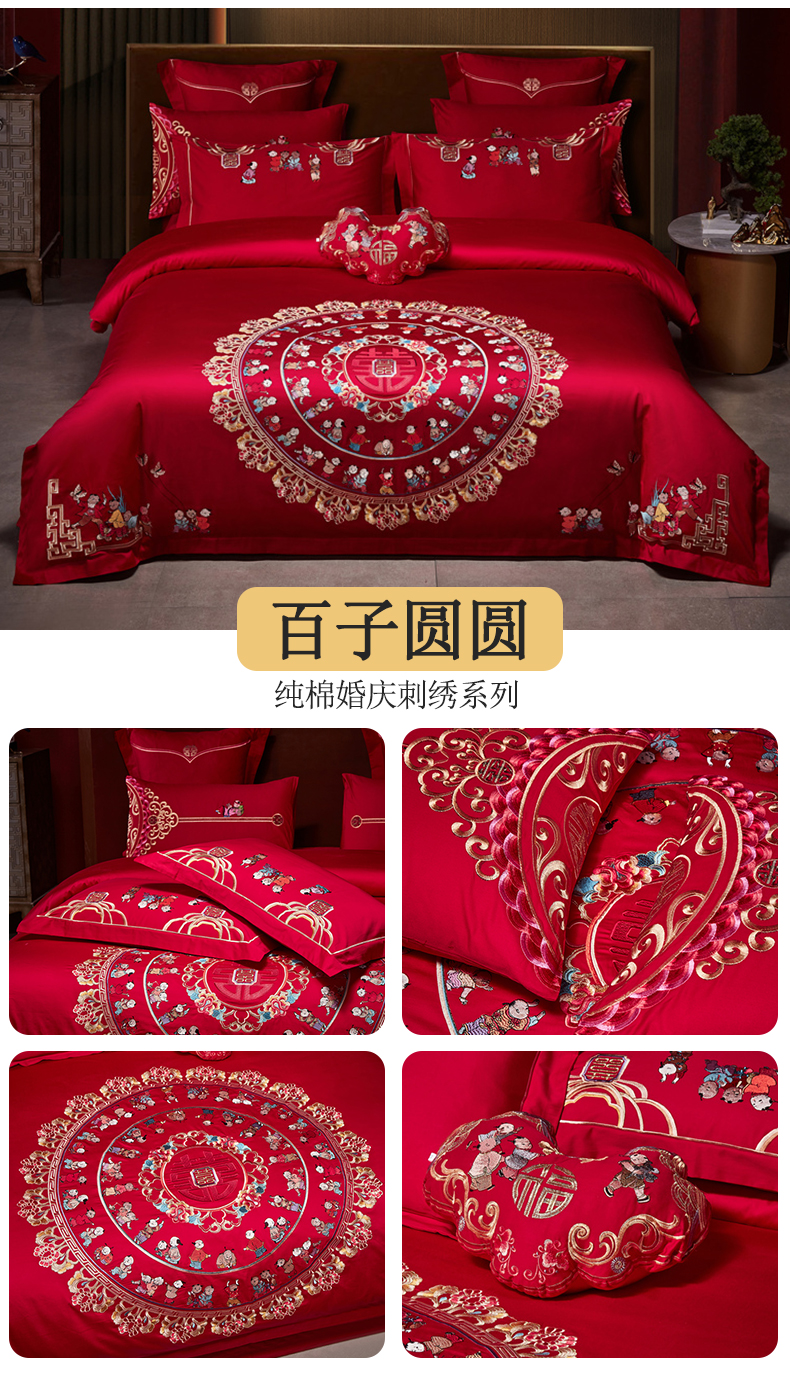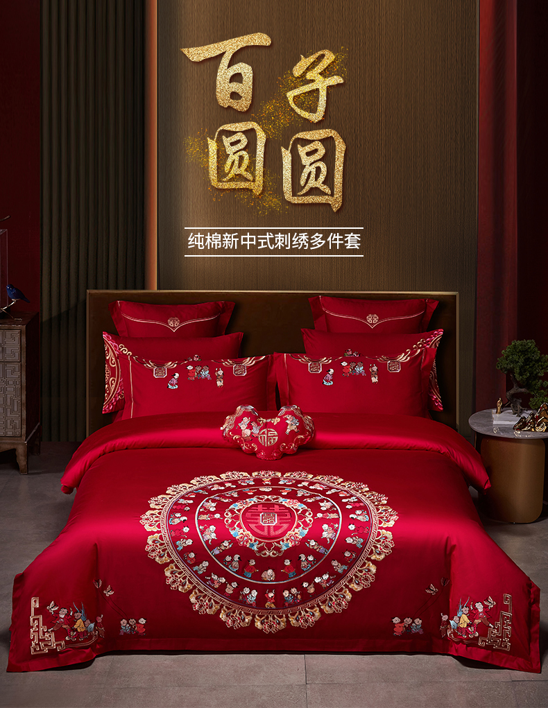 当前位置: 91家纺网 > 商品网购 > 床品套件 > 四件套 > 婚庆四件套 > 宏羽纺家纺 2024新款13372纯棉婚庆套件系列百子圆圆