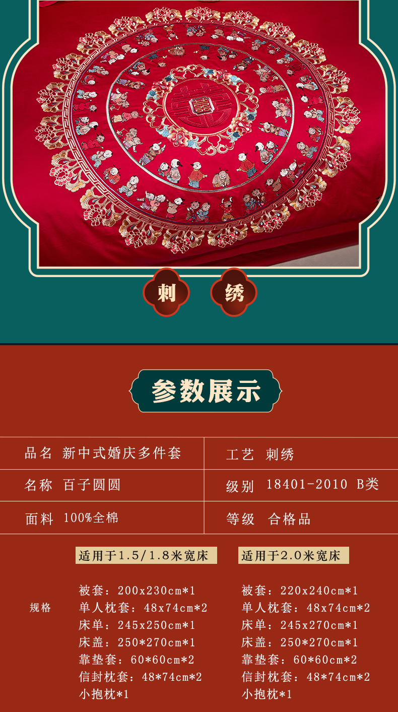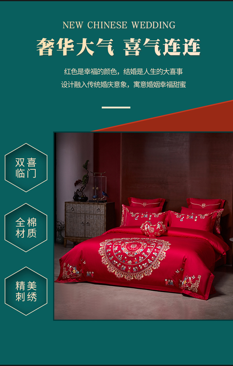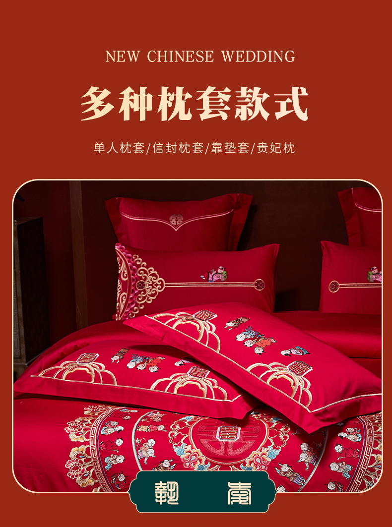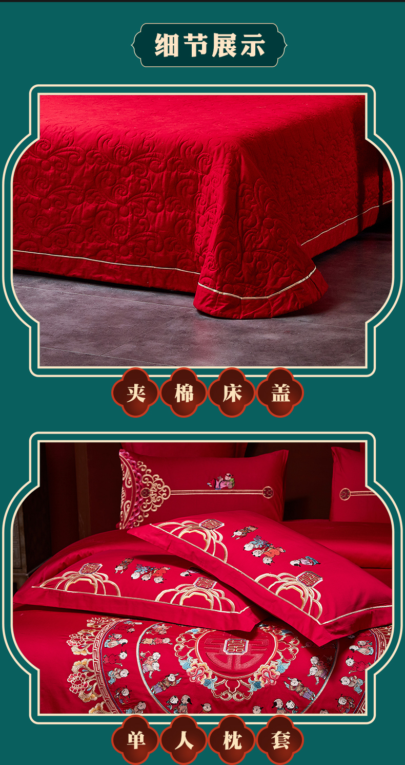 当前位置: 91家纺网 > 商品网购 > 床品套件 > 四件套 > 婚庆四件套 > 宏羽纺家纺 2024新款13372纯棉婚庆套件系列百子圆圆