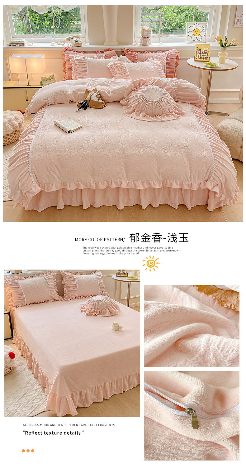 当前位置: 91家纺网 > 商品网购 > 床品套件 > 四件套 > 牛奶绒四件套 > 恩和家纺 2024新款牛奶绒雕花绒法式飞边四件套 郁金香-浅玉