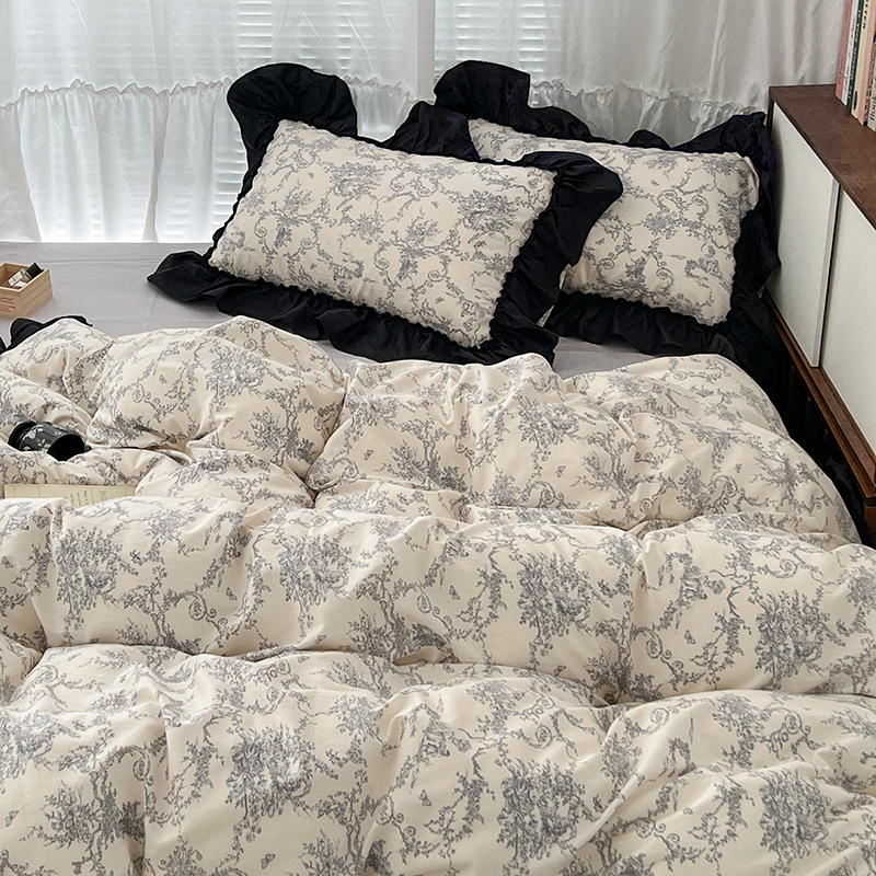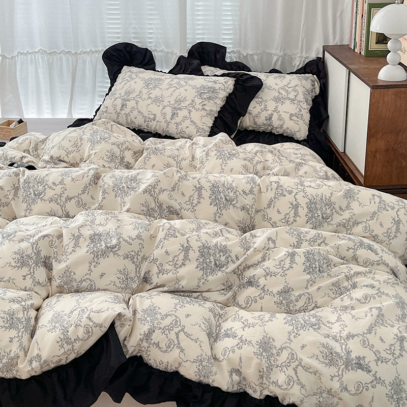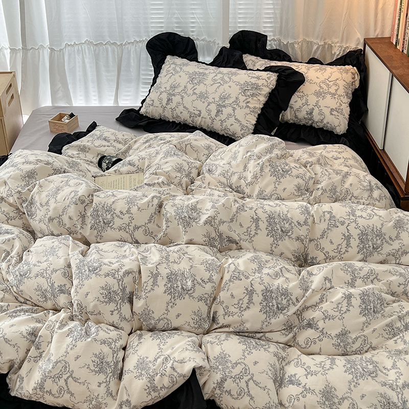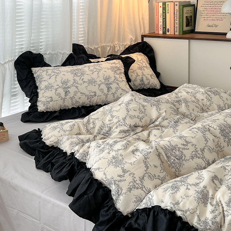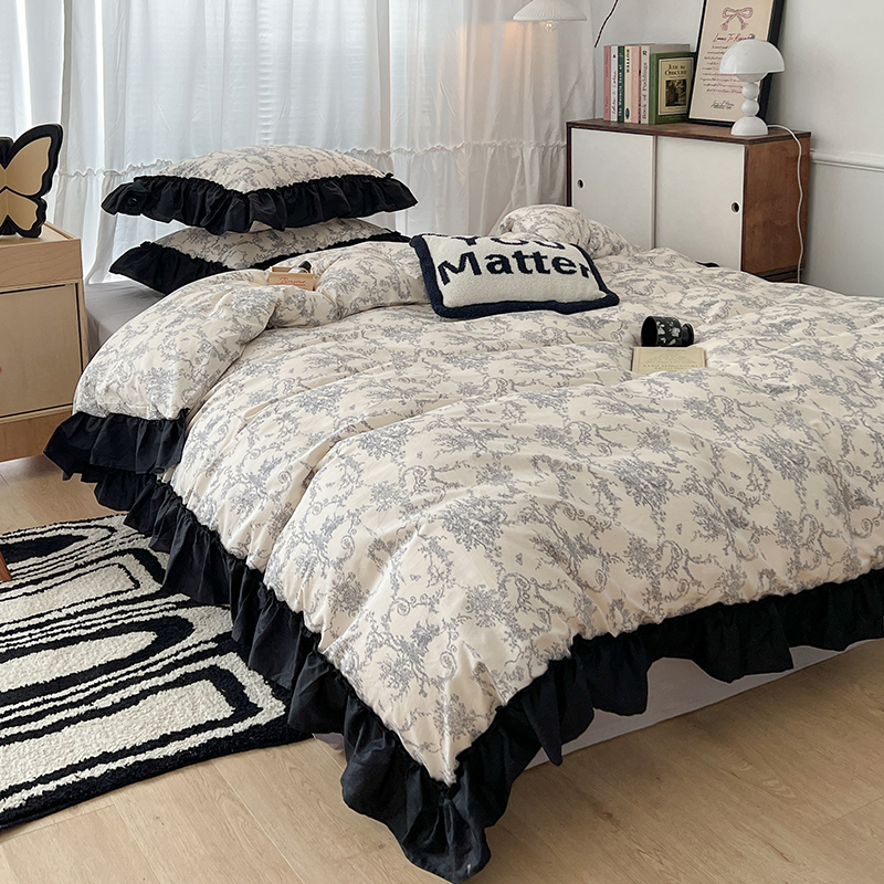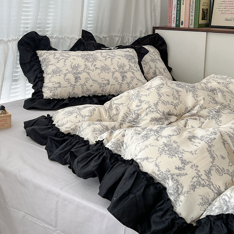 昔可家纺 2024黑色贴边花边全棉款四件套 香榭假日