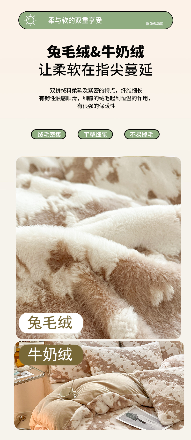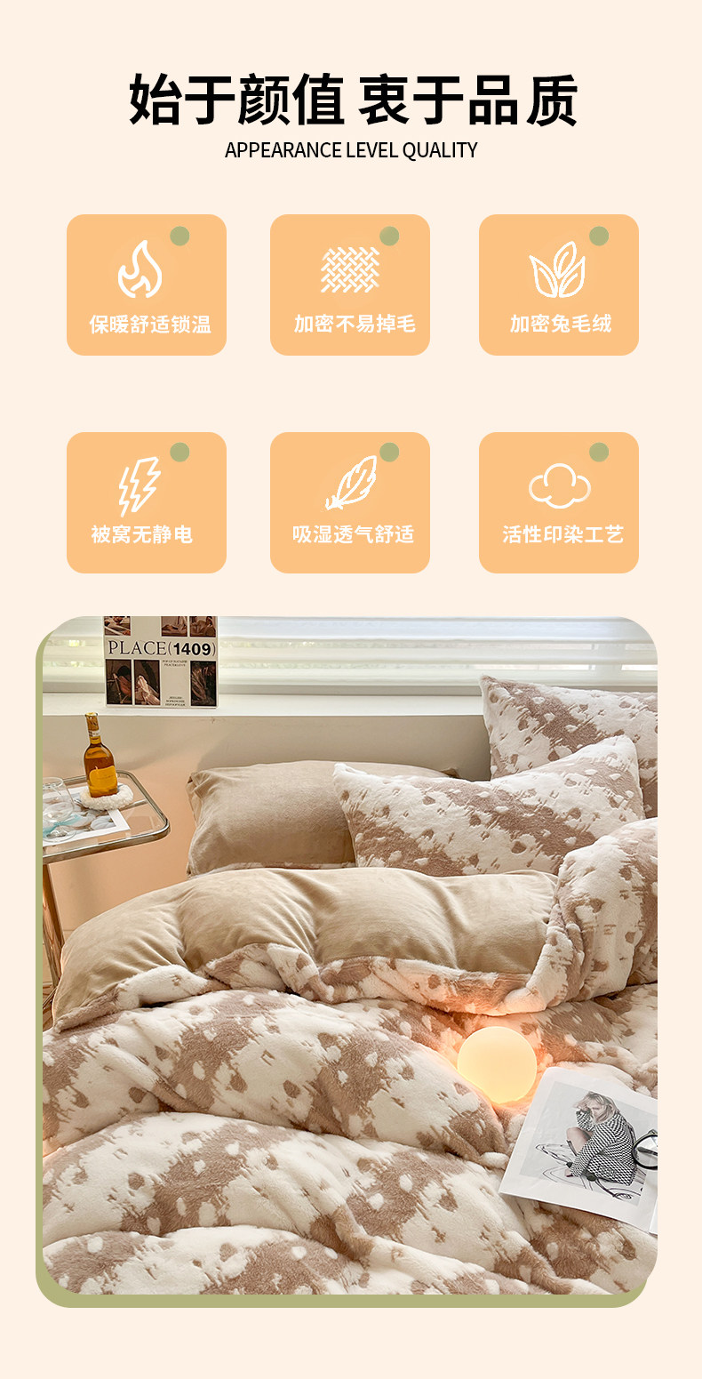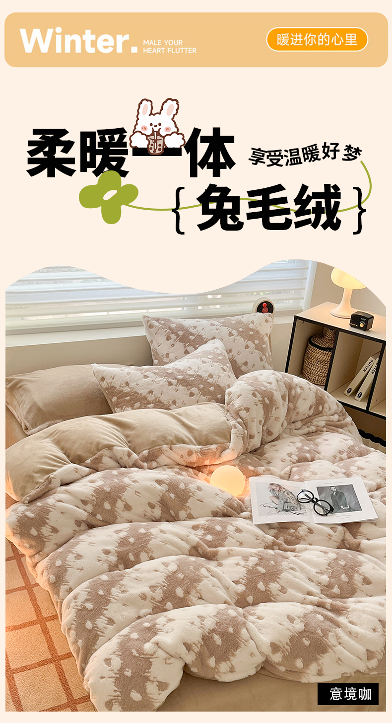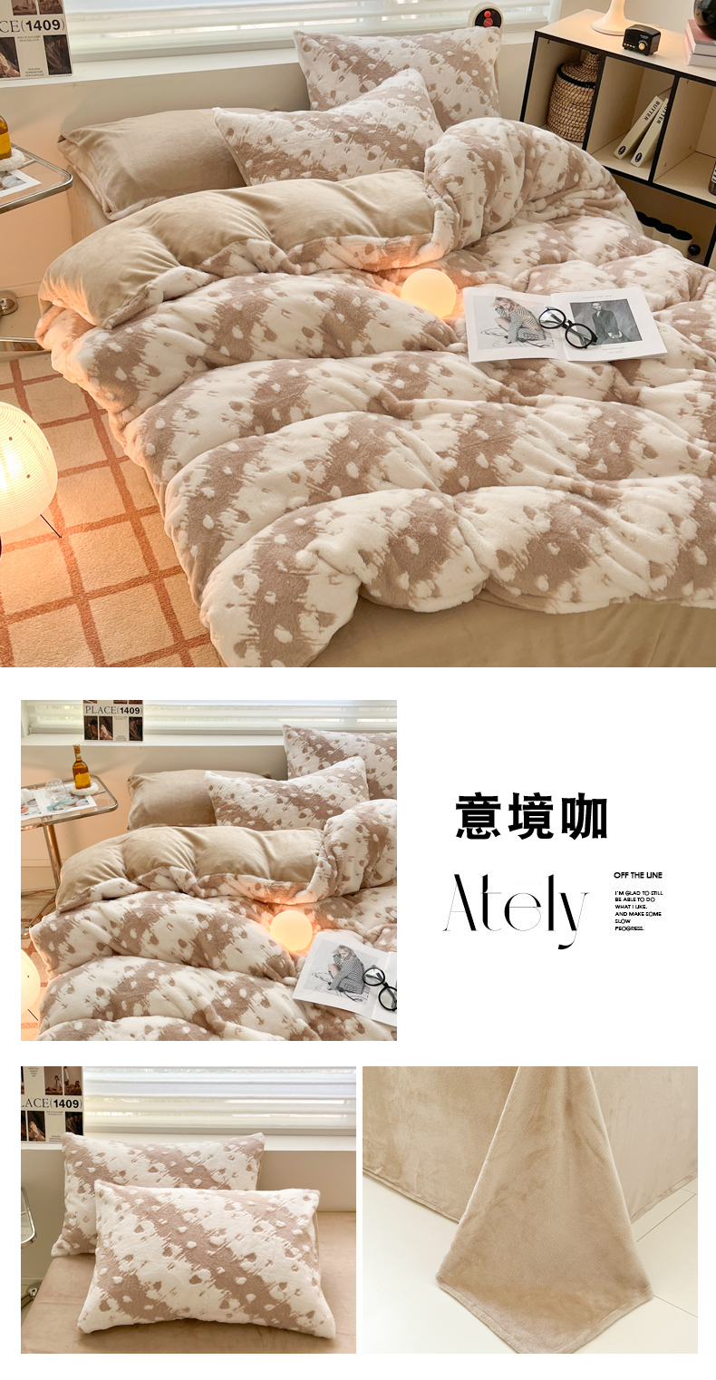 商品名称:金爱家 2024新款全消光牛奶绒A类纯色獭兔毛绒立体雕花牛奶绒四件套 兔毛意境咖
