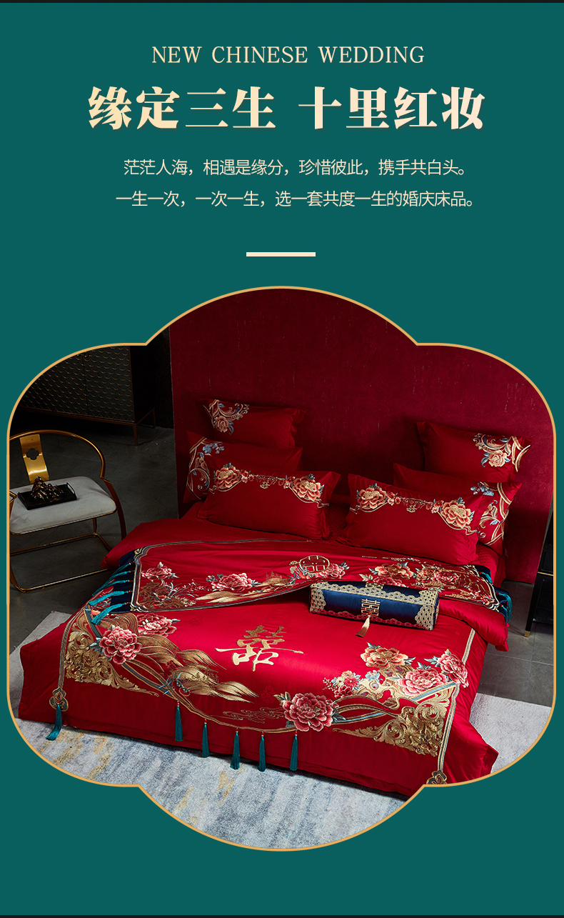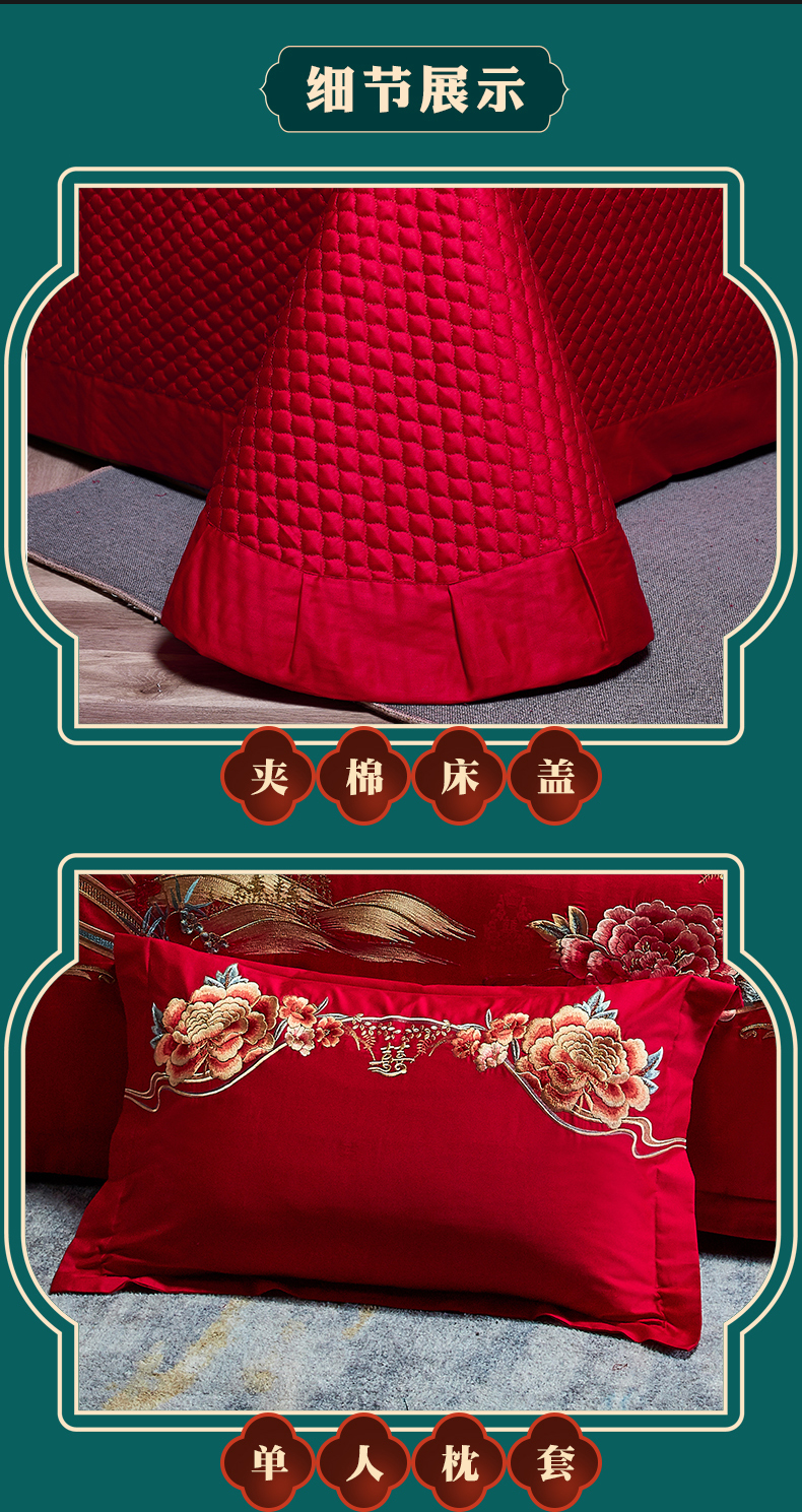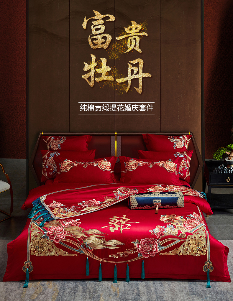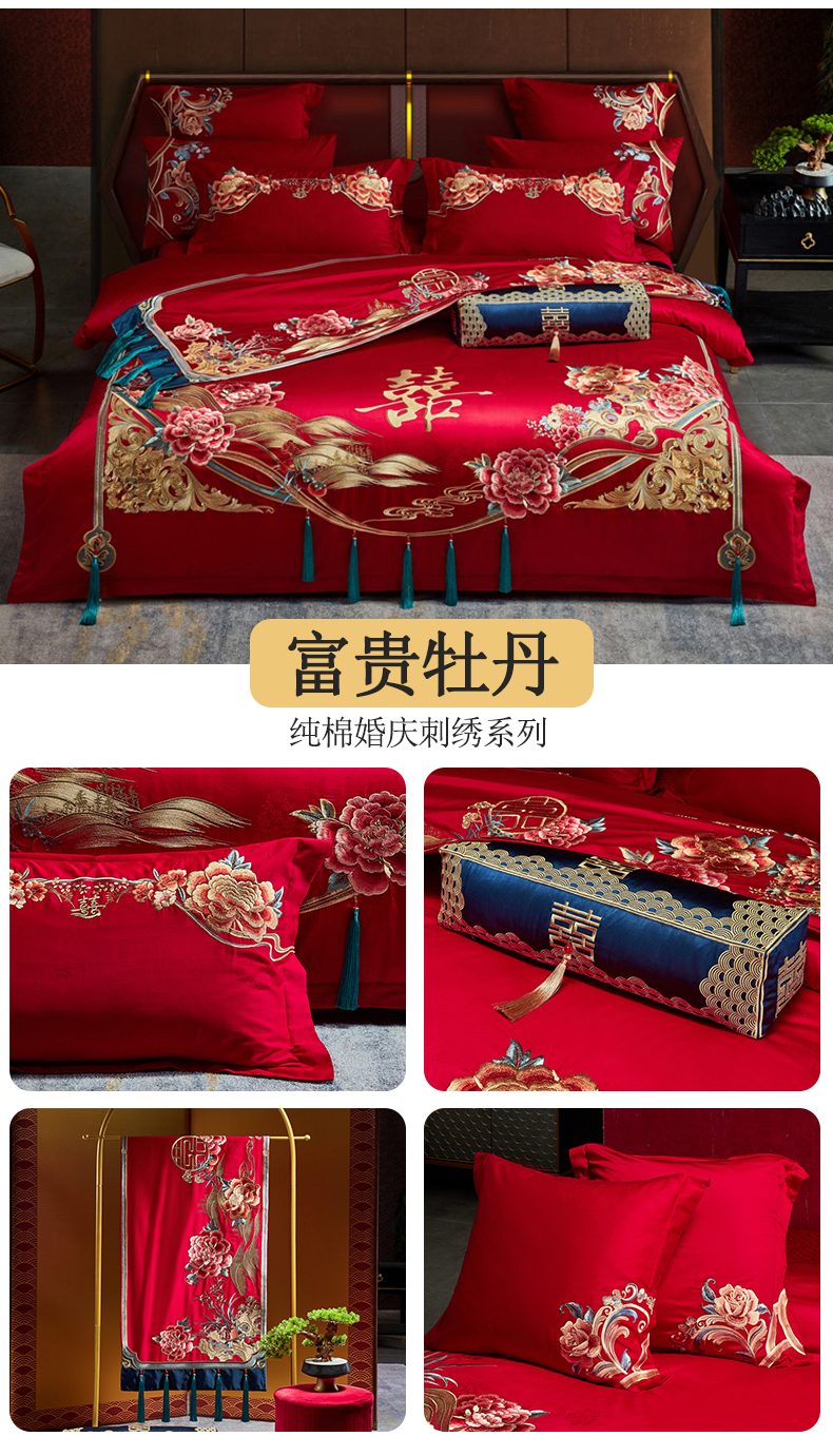 当前位置: 91家纺网 > 商品网购 > 床品套件 > 四件套 > 婚庆四件套 > 宏羽纺家纺 2024新款高支高密纯棉提花婚庆套件系列(控价680)富贵牡丹