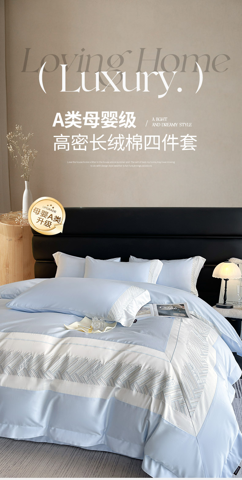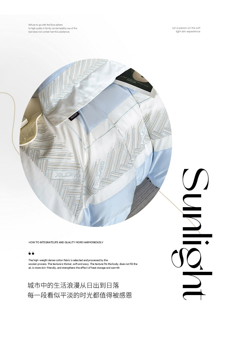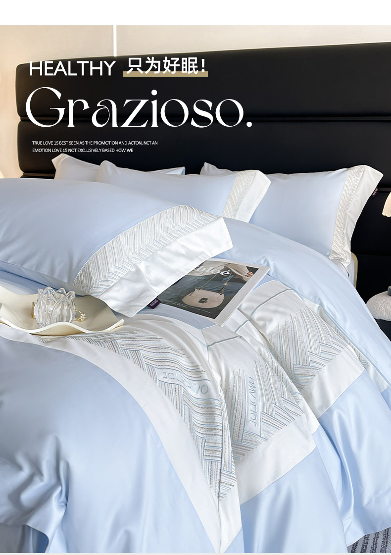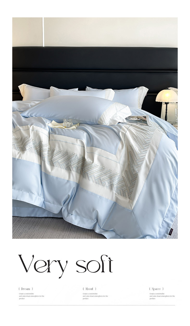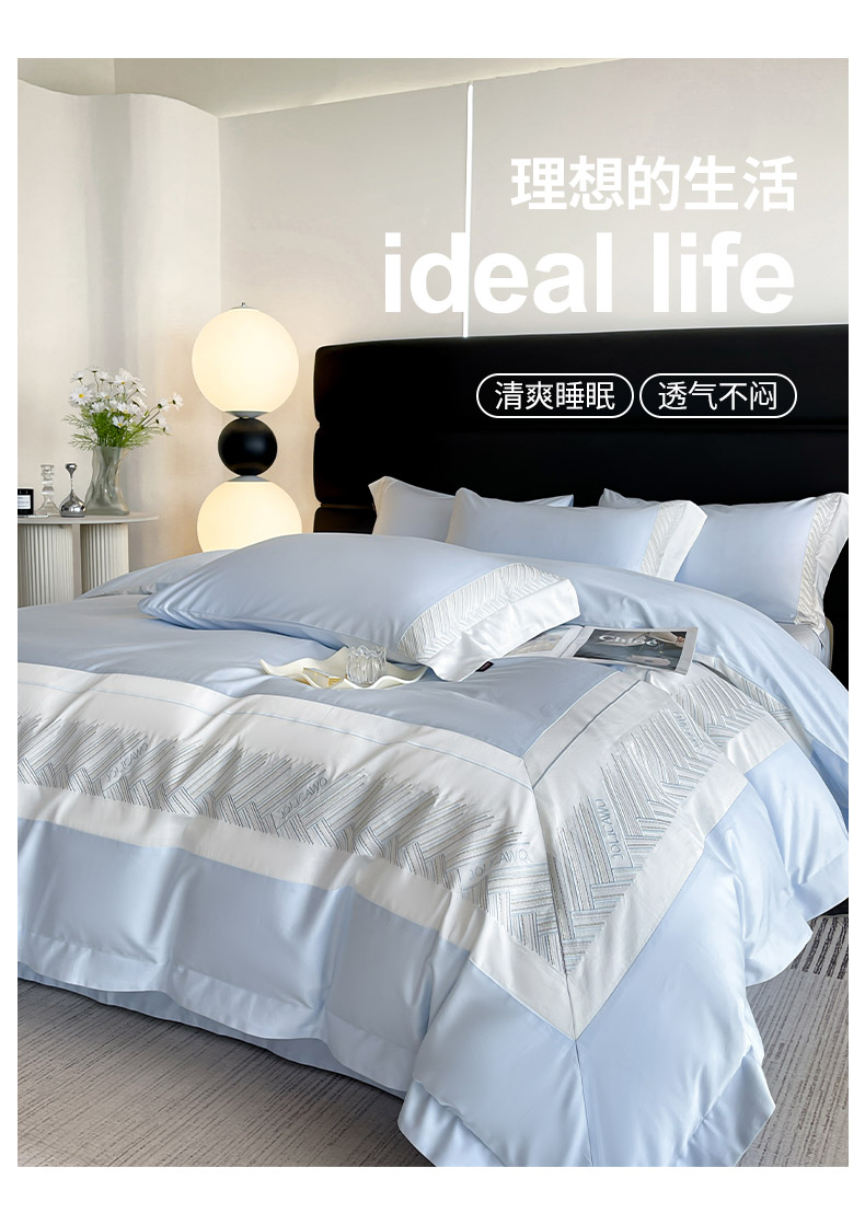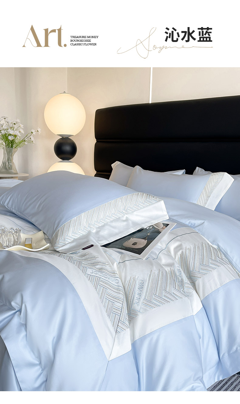 商品名称: 【A类母婴级】100支长绒棉四件套全棉纯棉重工高端刺绣拼接被套简约床单床笠款床上用品 澜梦-沁水蓝