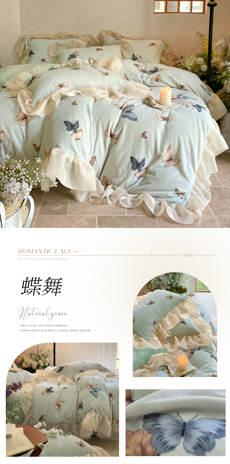 商品名称:慕澄家纺 2024新款高克重花边牛奶绒印花四件套 蝶舞