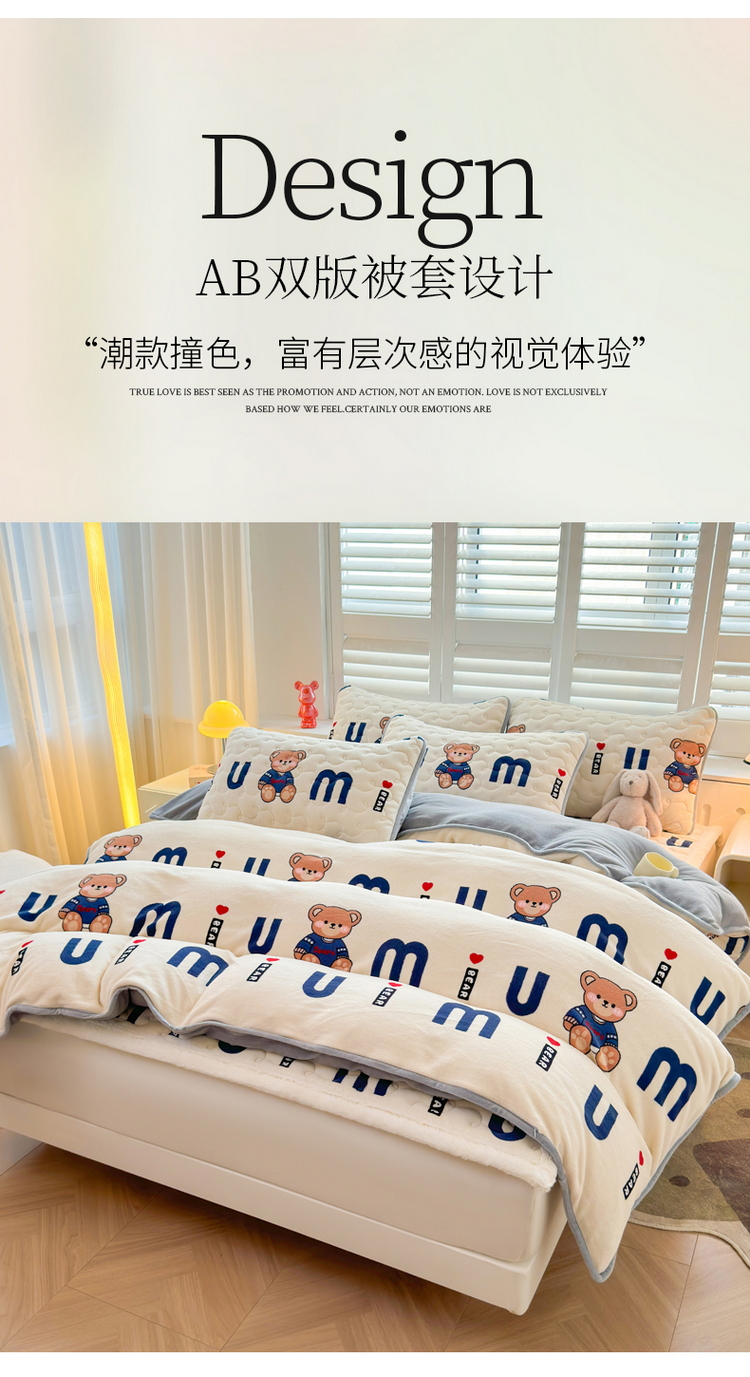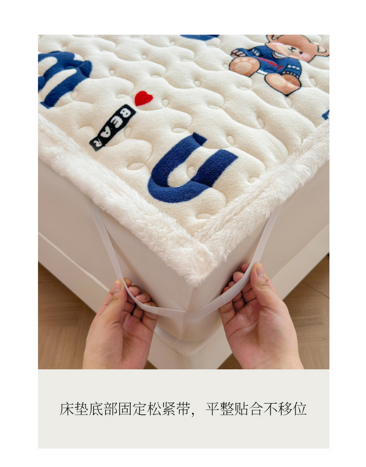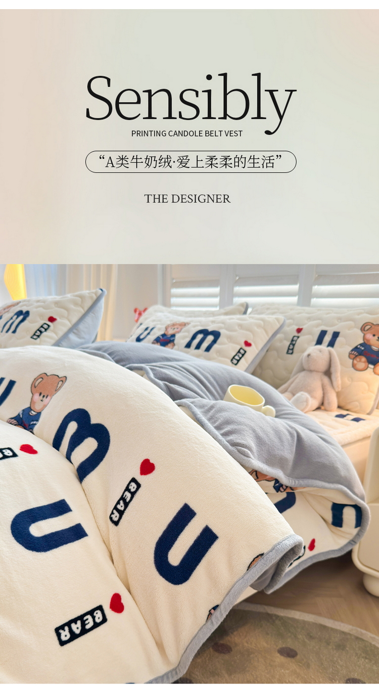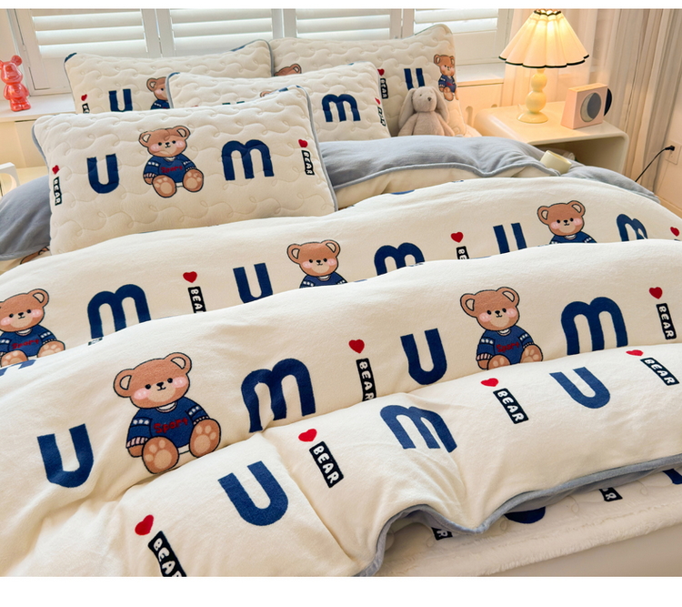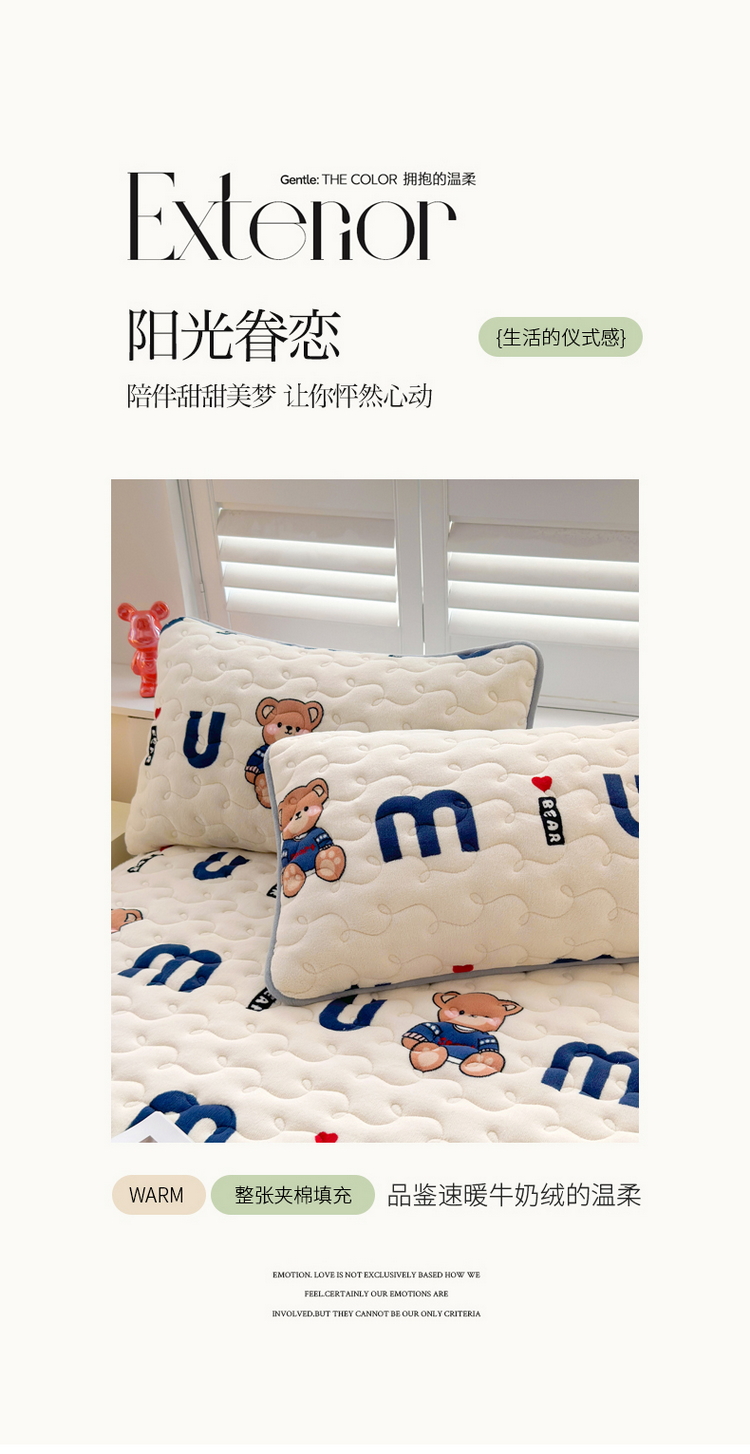 2024秋冬新款牛奶绒加厚夹棉床褥垫+牛奶绒被套四件套妙妙熊