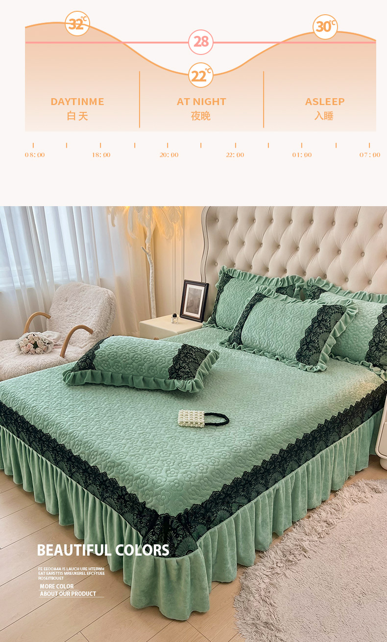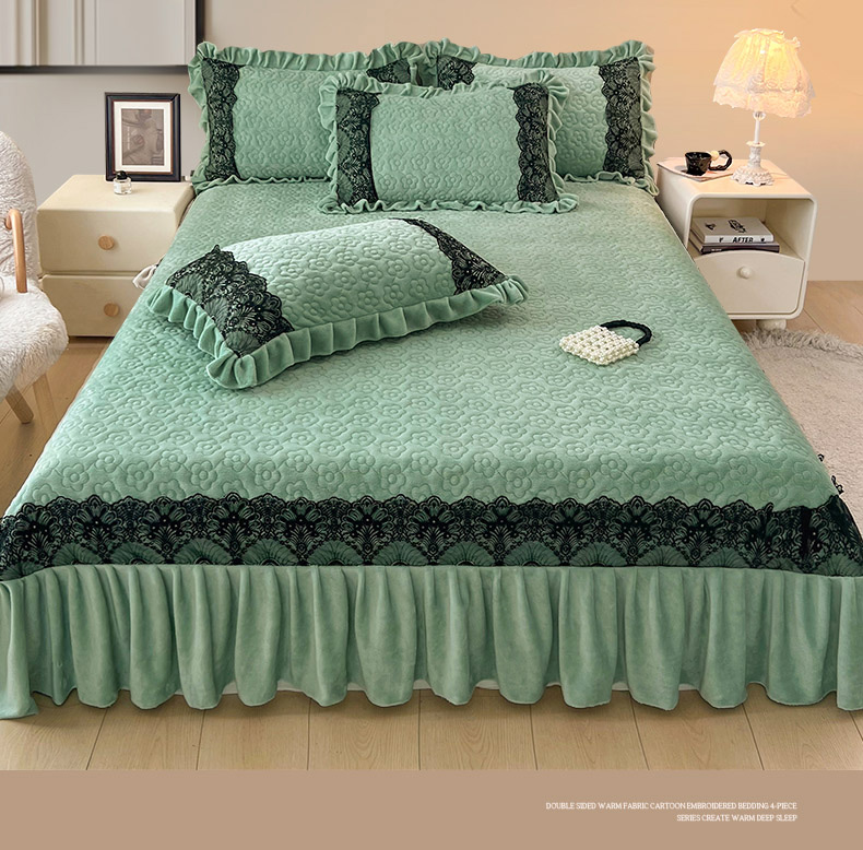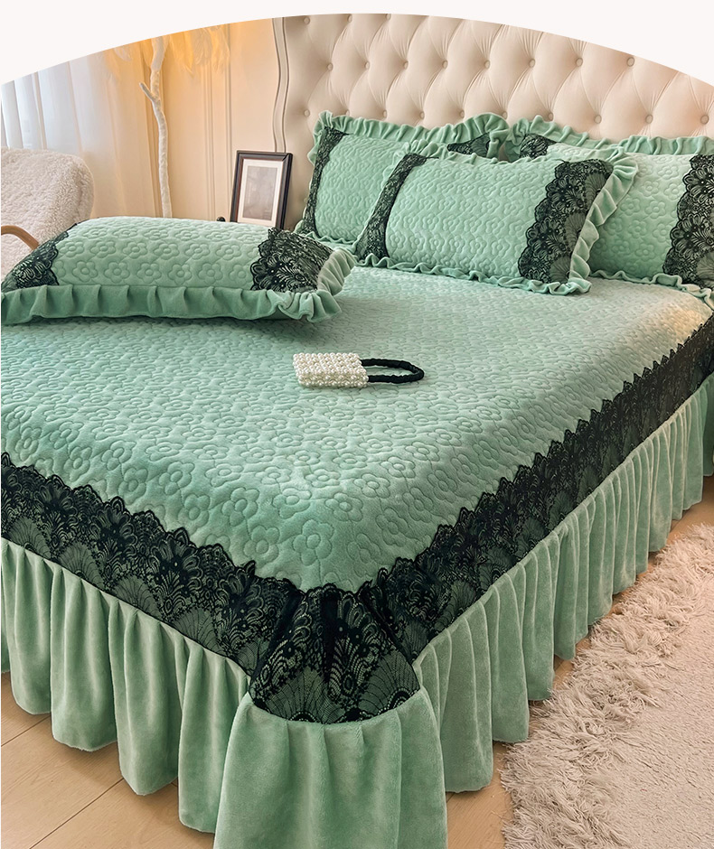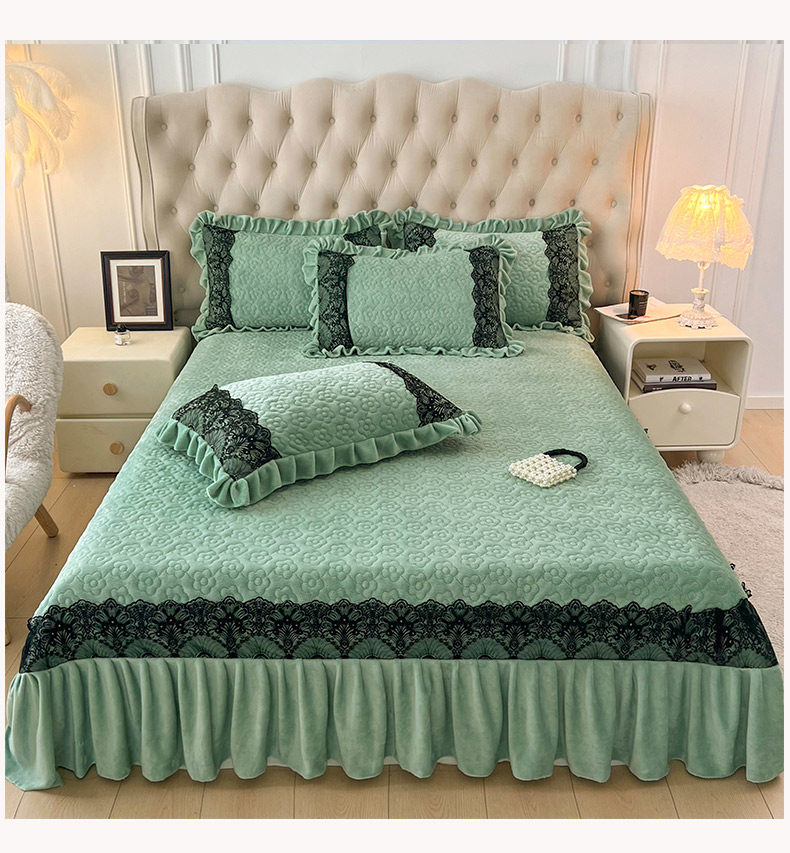 恋尚 2024新款牛奶绒夹棉床盖纯色蕾丝边牛奶绒床盖 洛丽塔 绿色