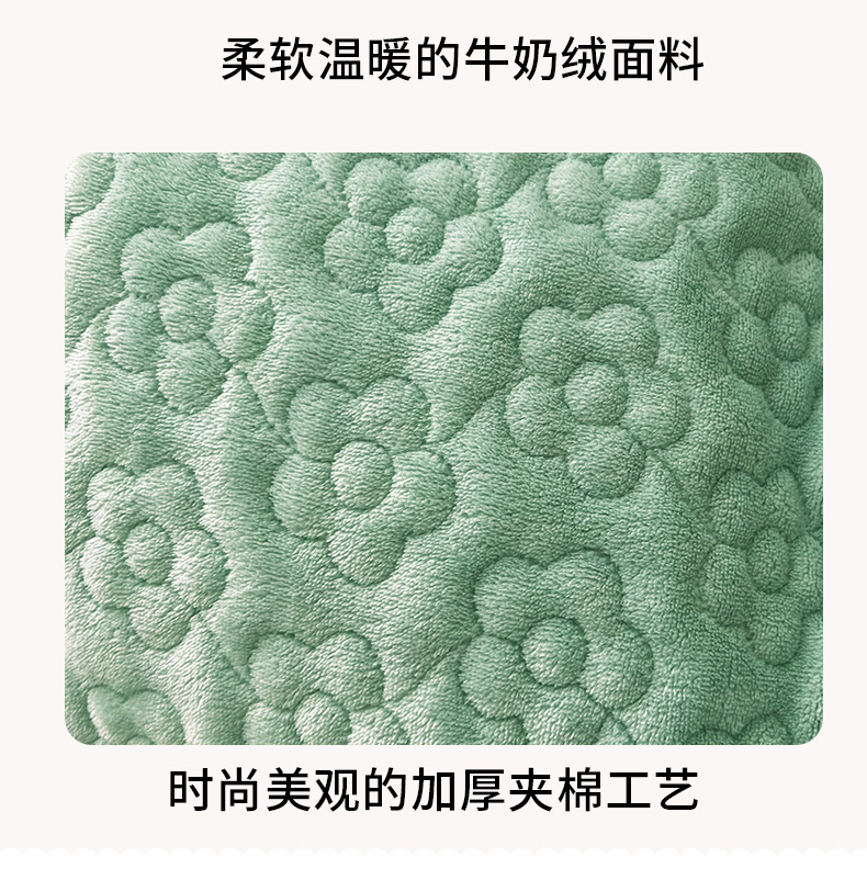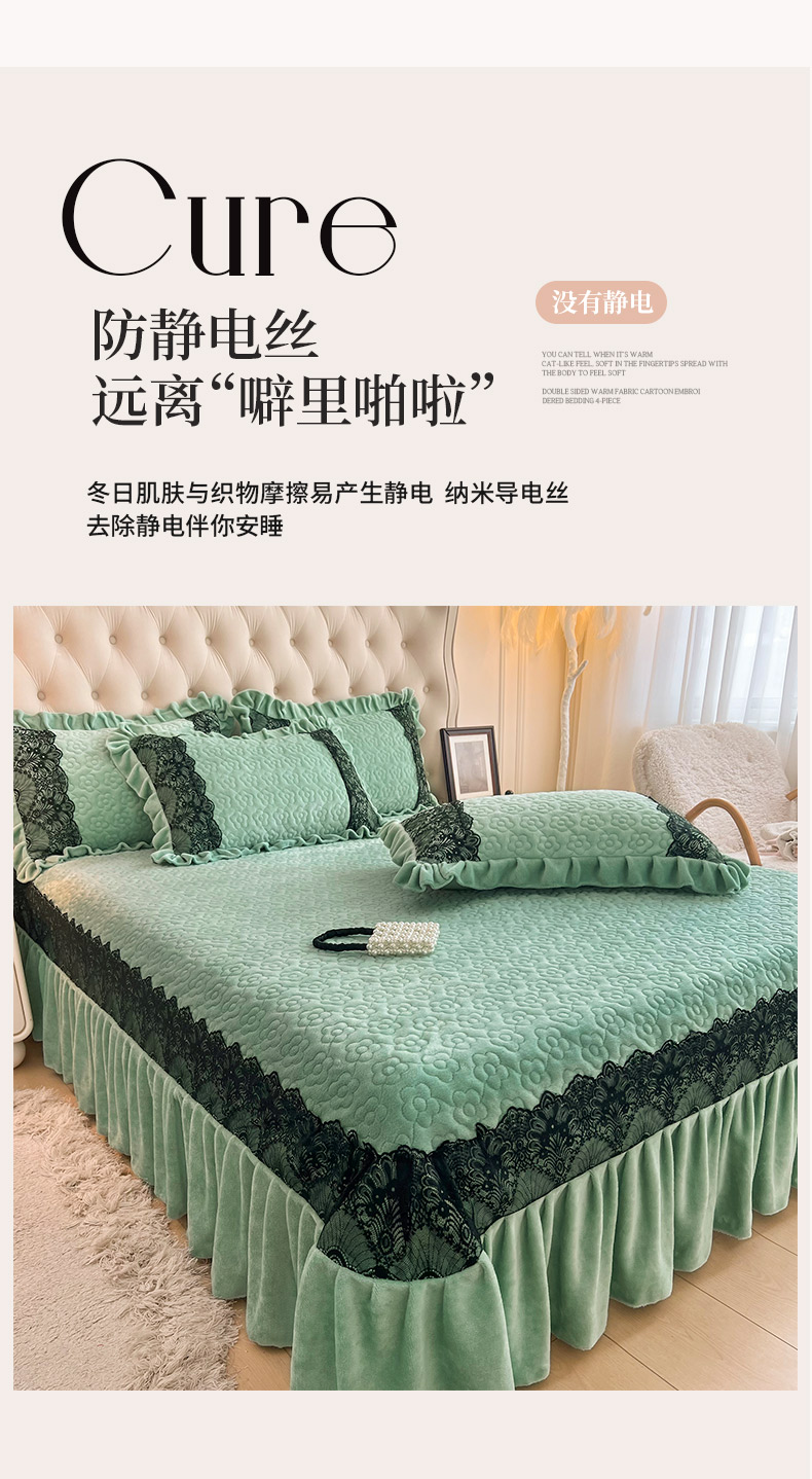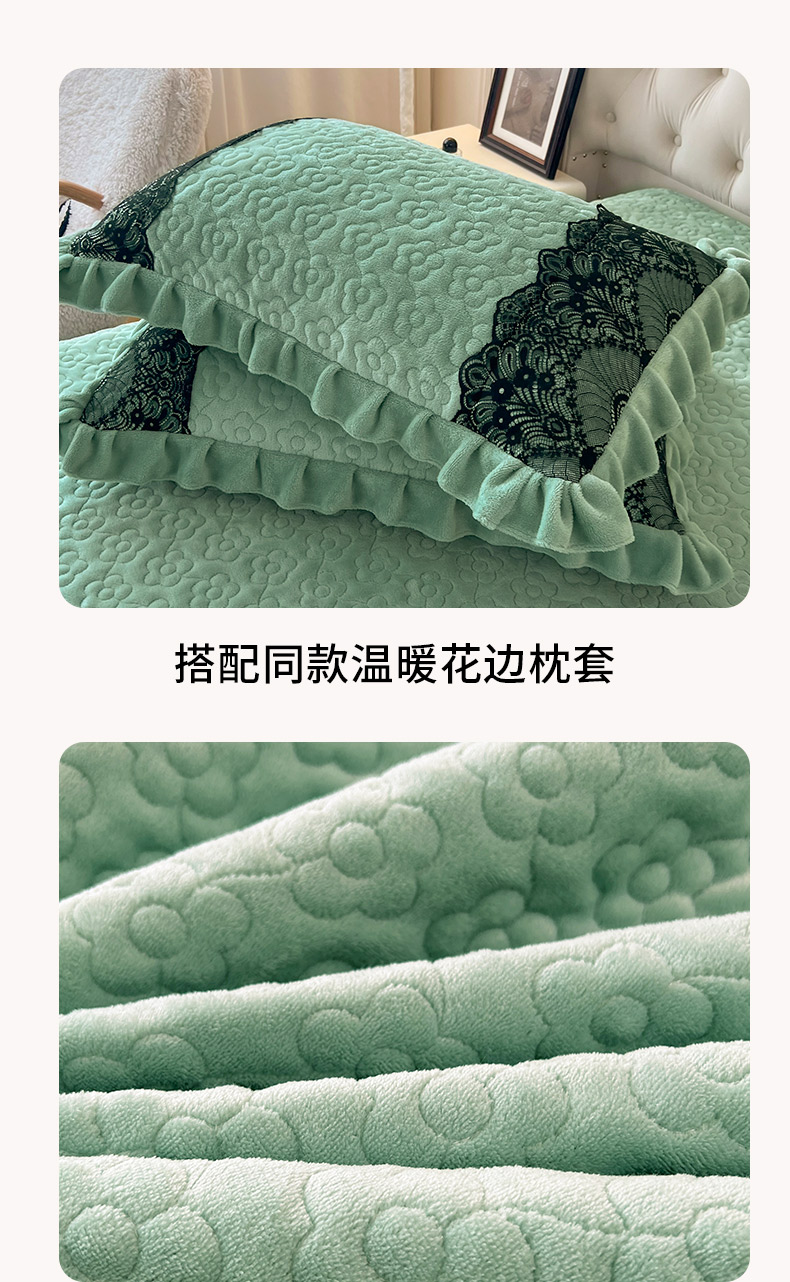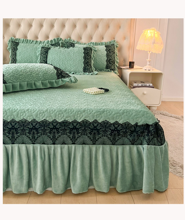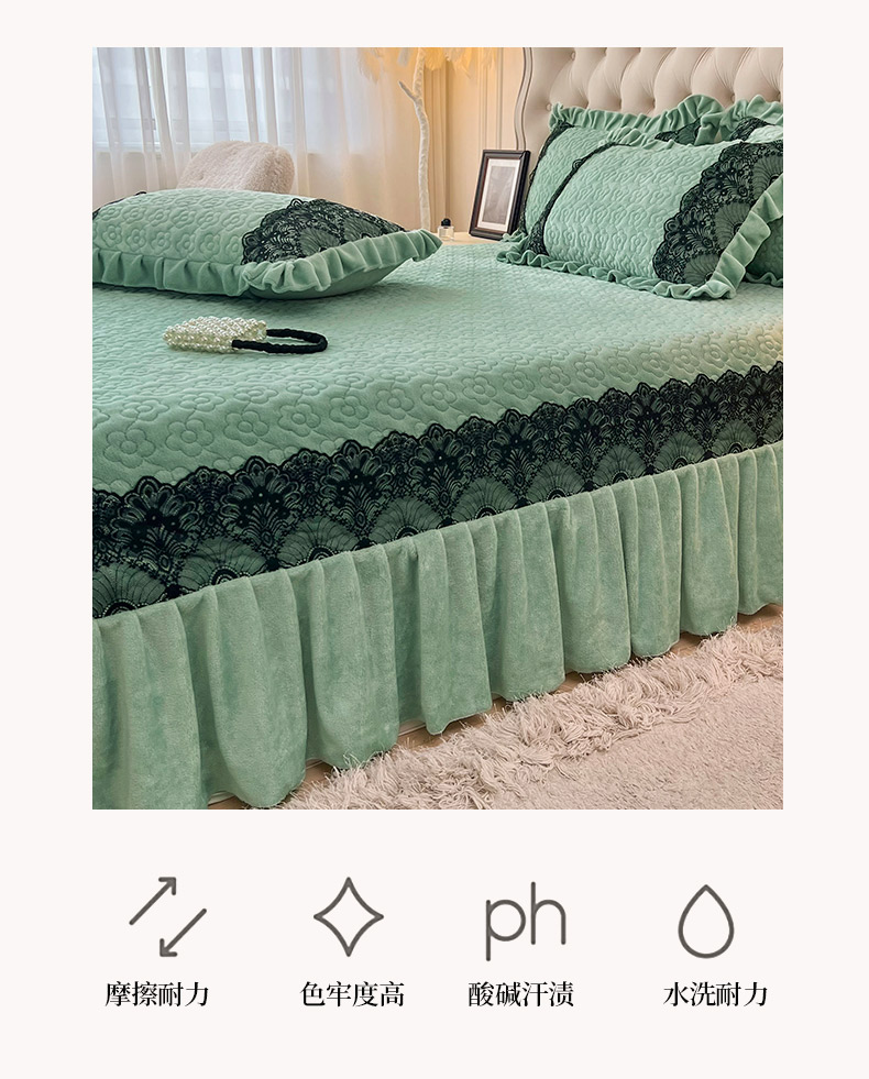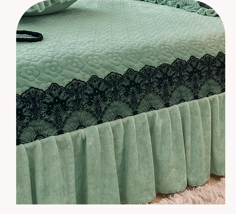 商品名称:恋尚 2024新款牛奶绒夹棉床盖纯色蕾丝边牛奶绒床盖 洛丽塔 绿色