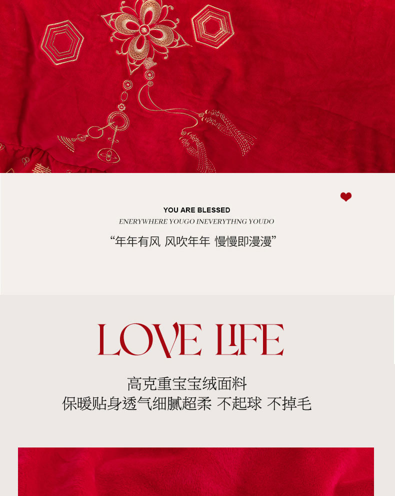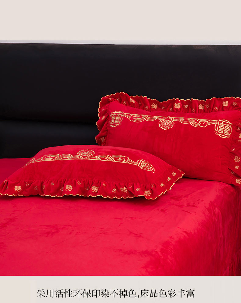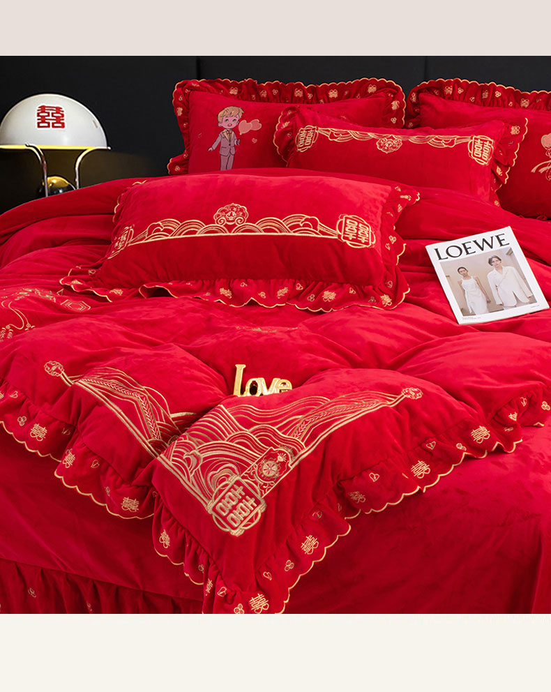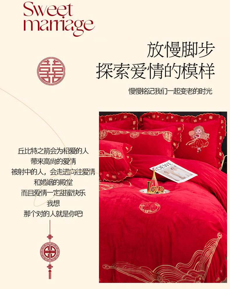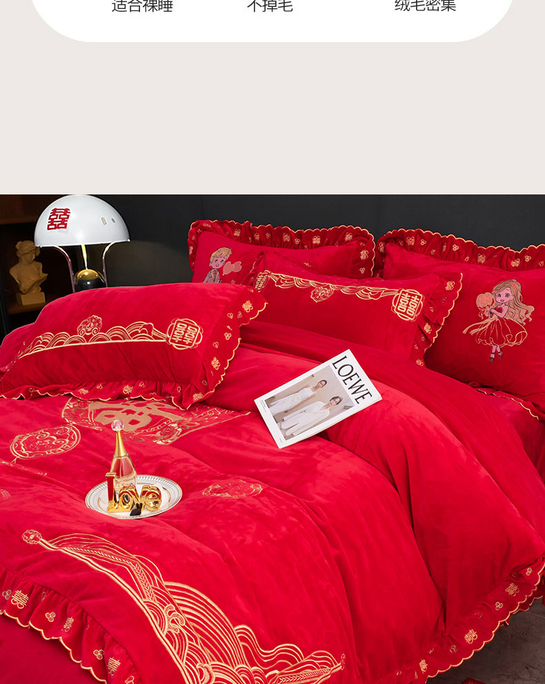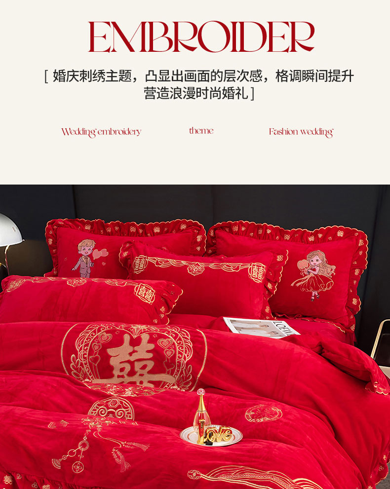 蒂爵 全棉纯棉抗静电宝宝绒婚庆绣花四件套 新婚快乐