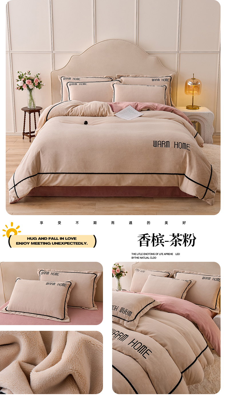 商品名称:同田家纺 2024新款230克蓄暖高克重牛奶绒四件套 香槟-茶粉