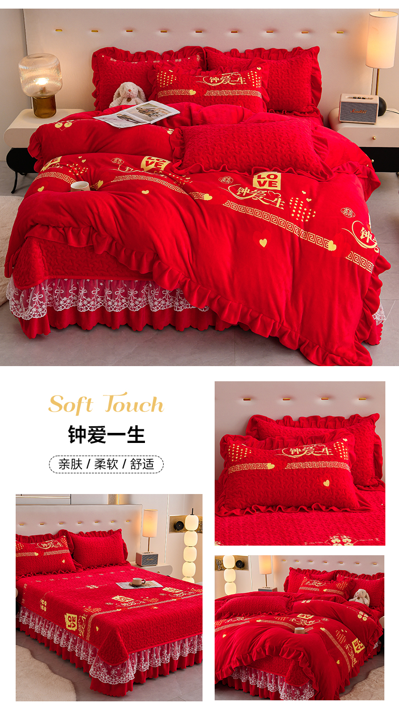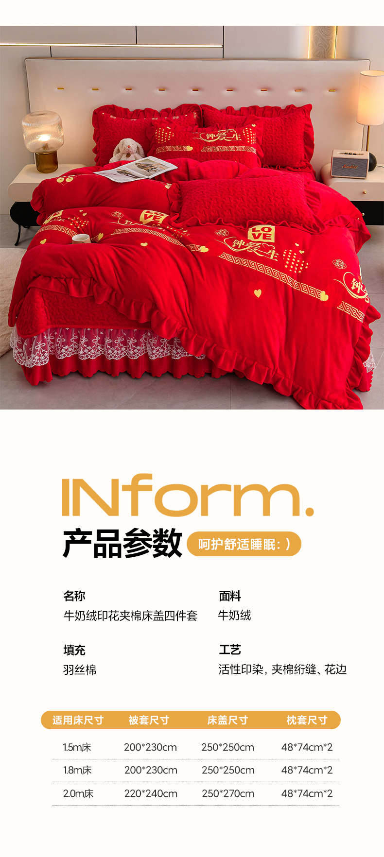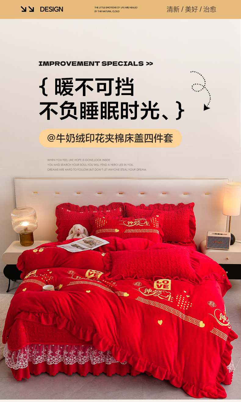 当前位置: 91家纺网 > 商品网购 > 床品套件 > 四件套 > 牛奶绒四件套 > 民新家纺 2025新款牛奶绒印花夹棉床盖四件套 钟爱一生