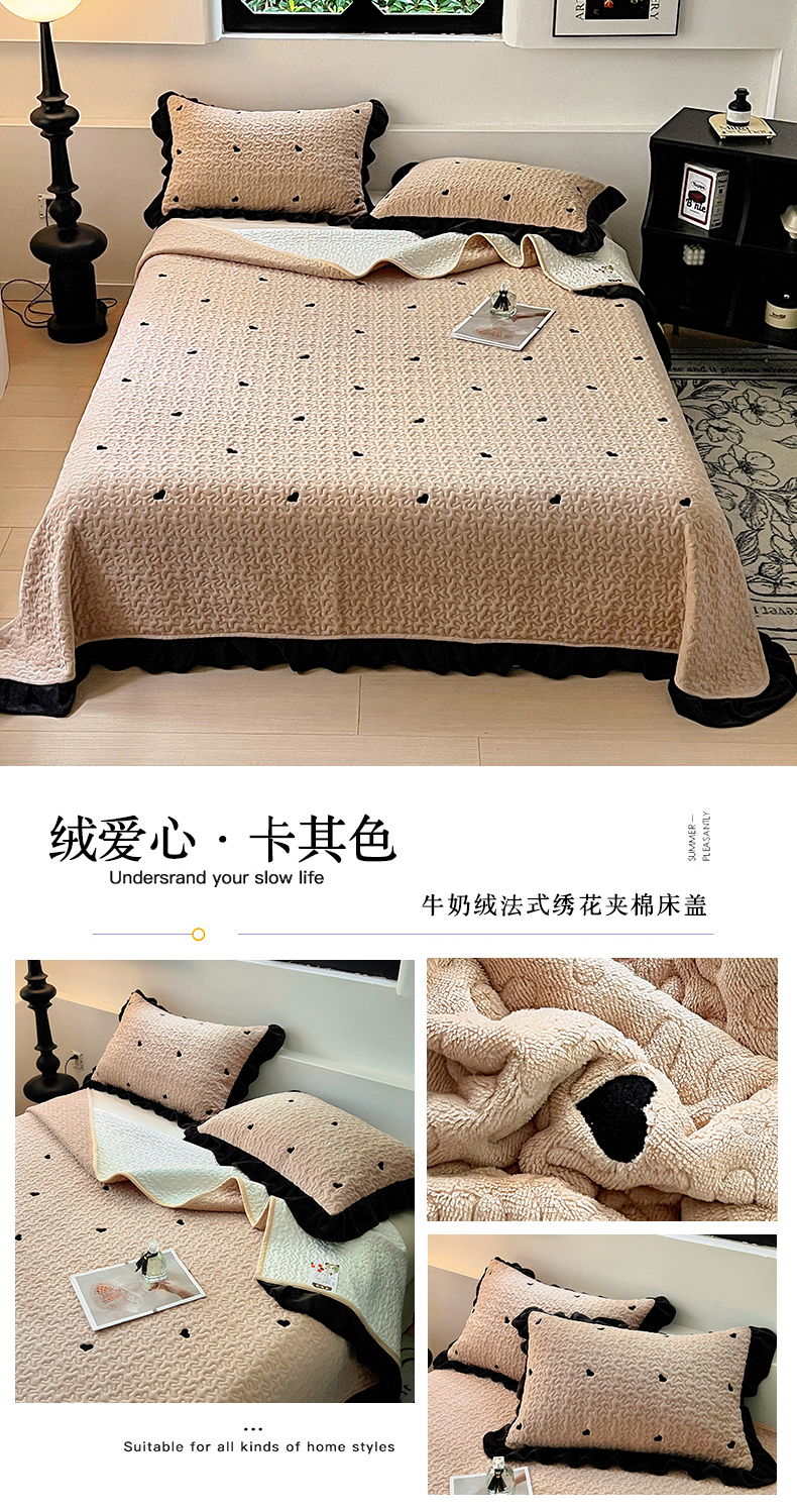 • 91家纺网 家纺一手货源 找家纺 美梦家纺 2024新款牛奶绒法式绣花夹棉床盖 绒爱心·卡其色