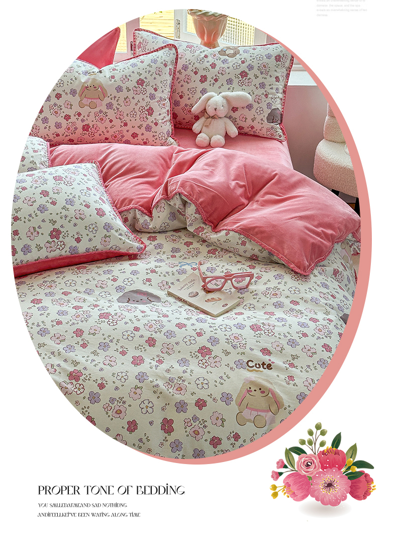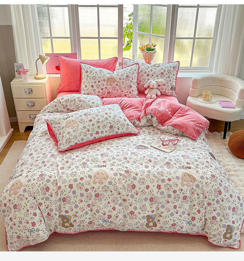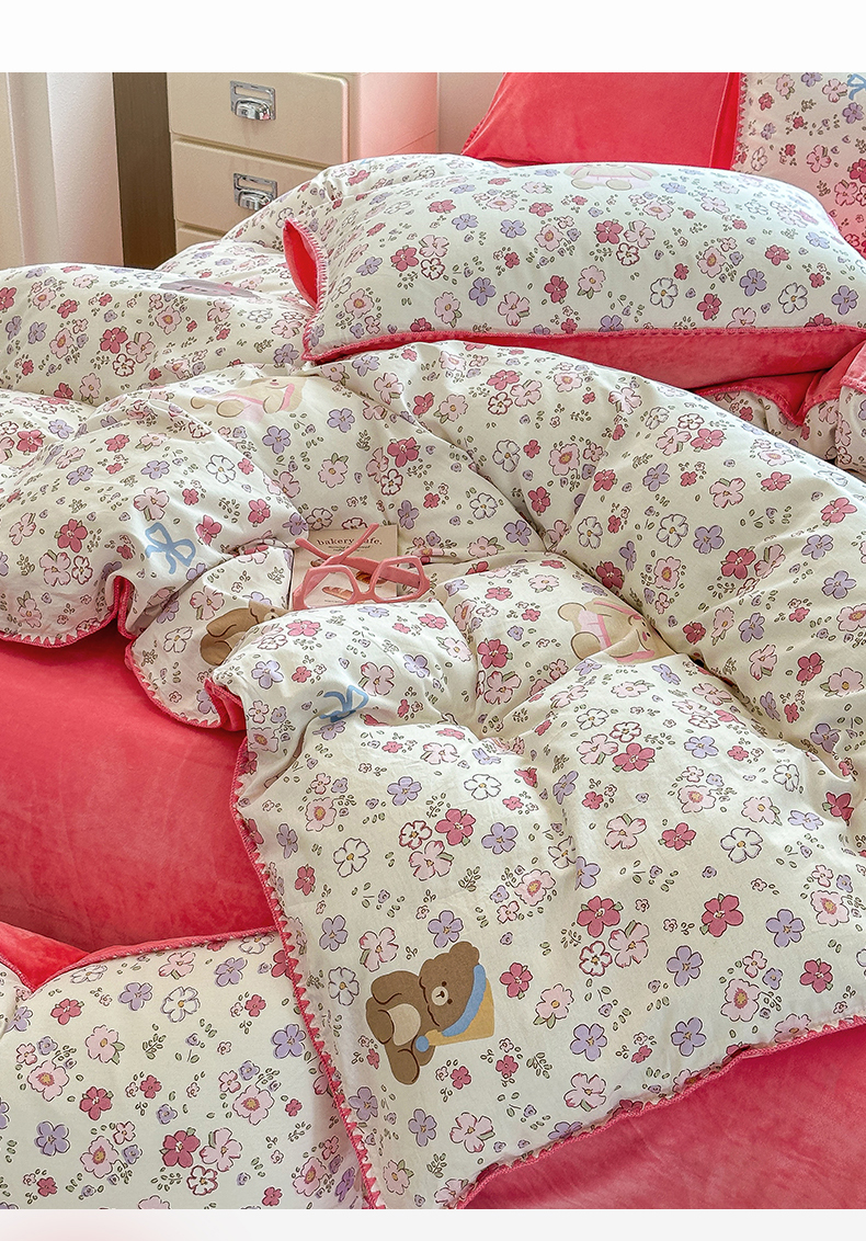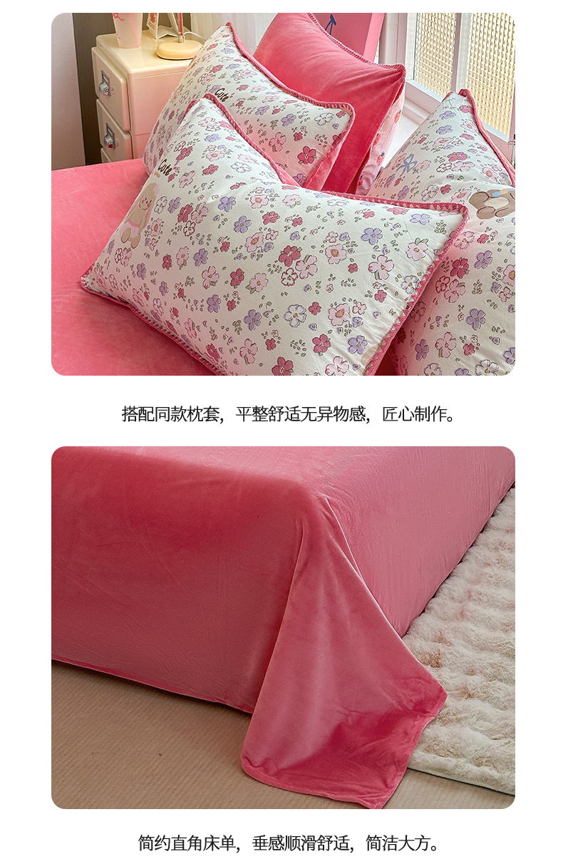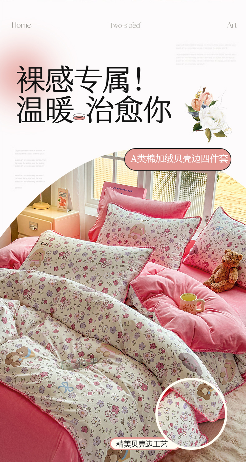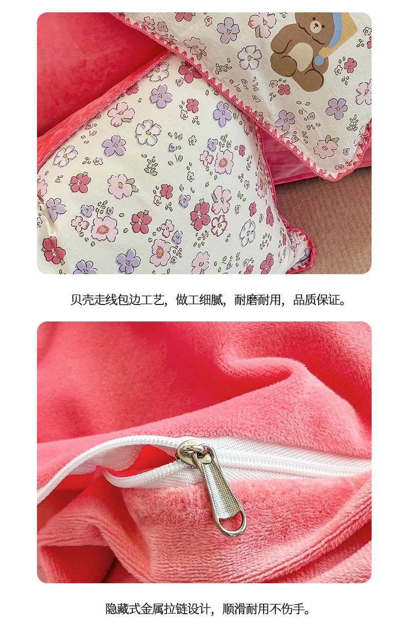 当前位置: 91家纺网 > 商品网购 > 床品套件 > 四件套 > 牛奶绒四件套 > 红粉佳人新款小清新卡通贝壳边三角针棉加绒四件套工艺款牛奶绒四件套甜甜小熊