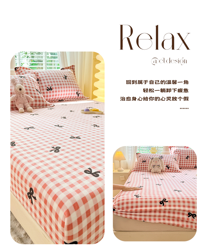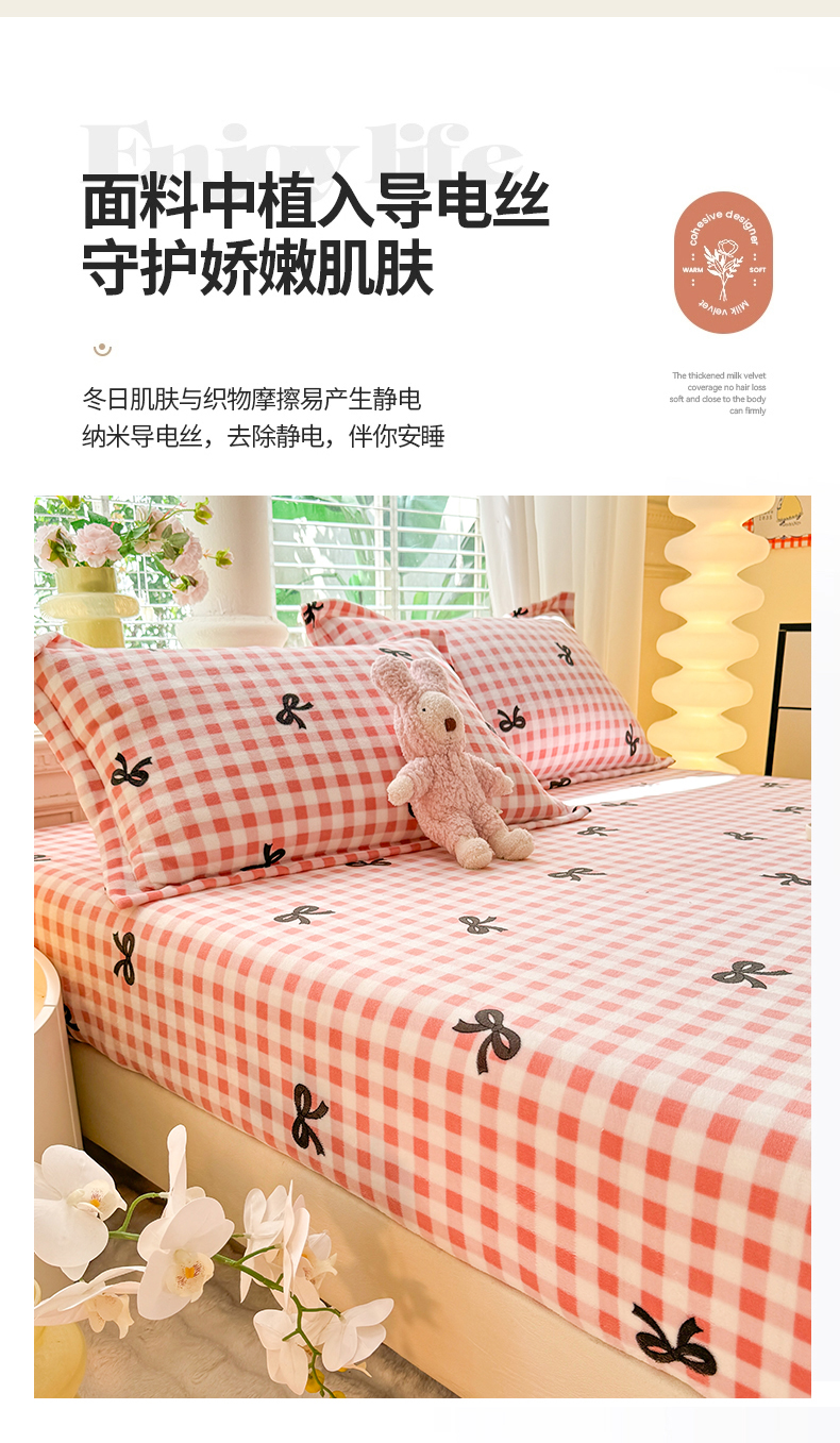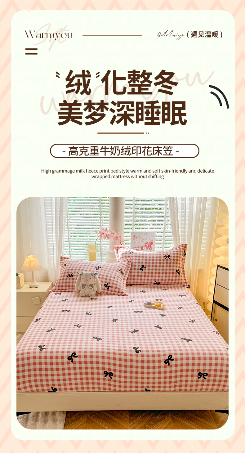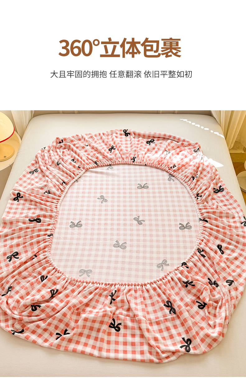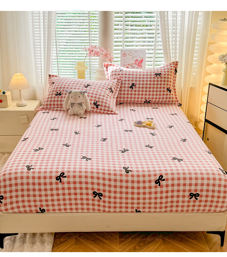 妖妖家纺 2024新款200克牛奶绒单床笠 格子蝴蝶结-粉