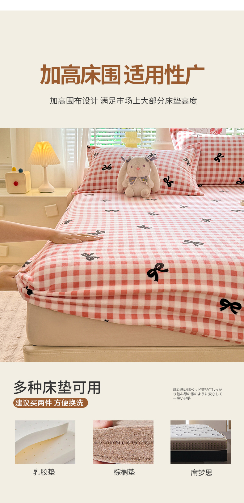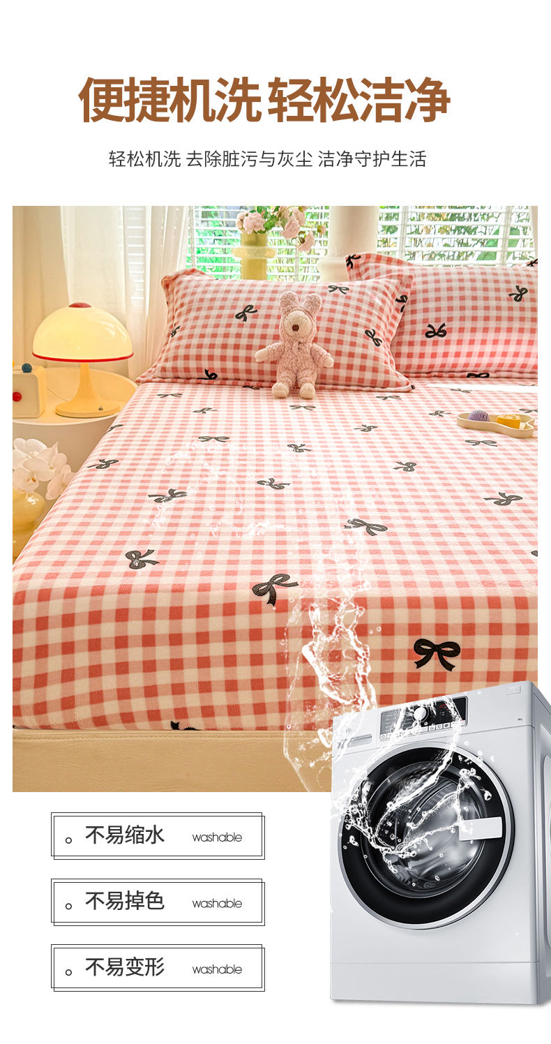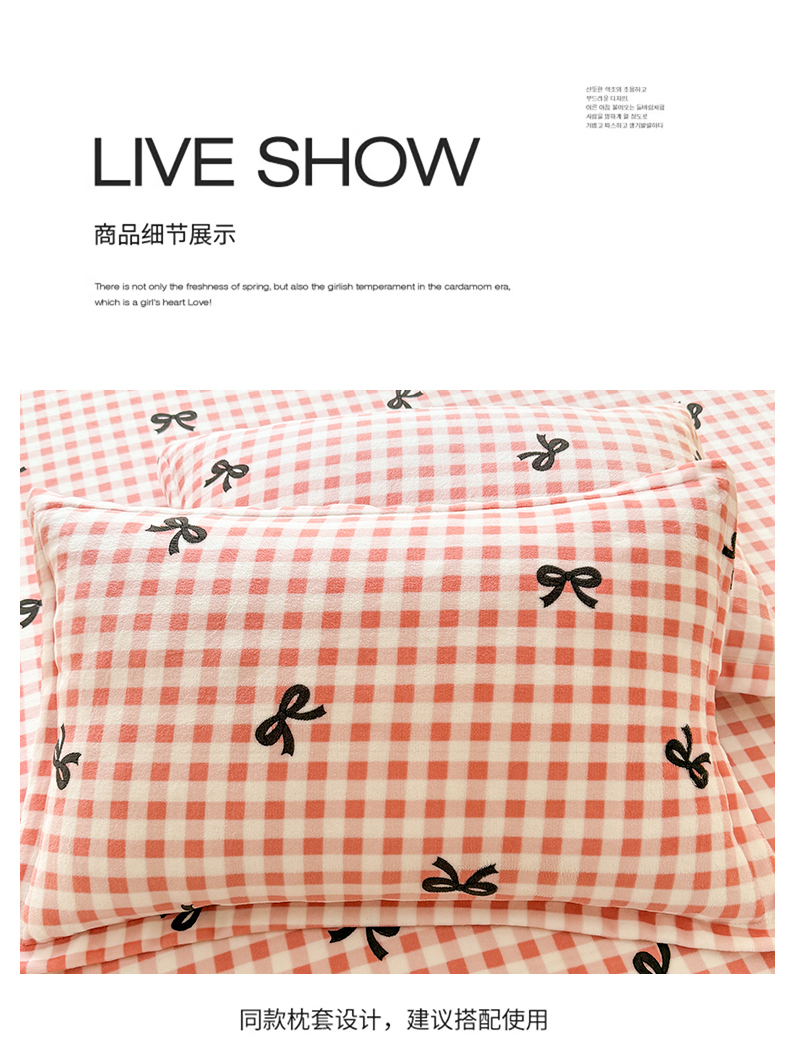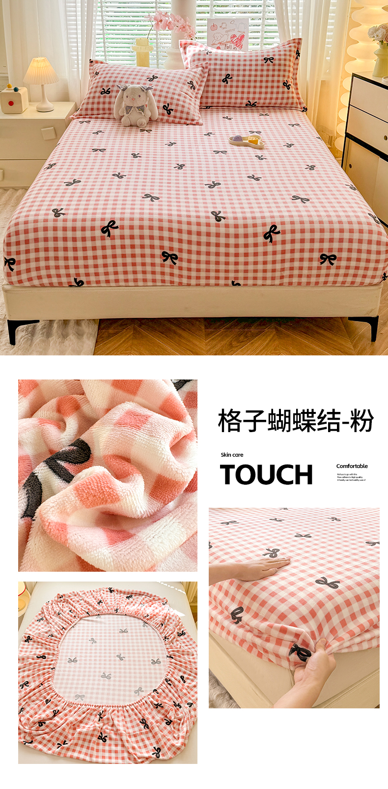 妖妖家纺 2024新款200克牛奶绒单床笠 格子蝴蝶结-粉