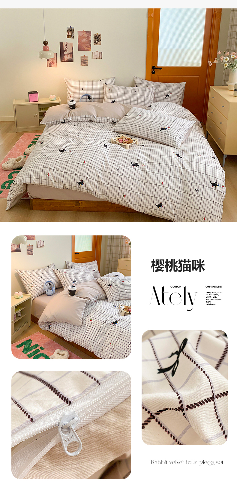 富瑞阁 2024爆款13070全棉小清新印花四件套三件套 樱桃猫咪